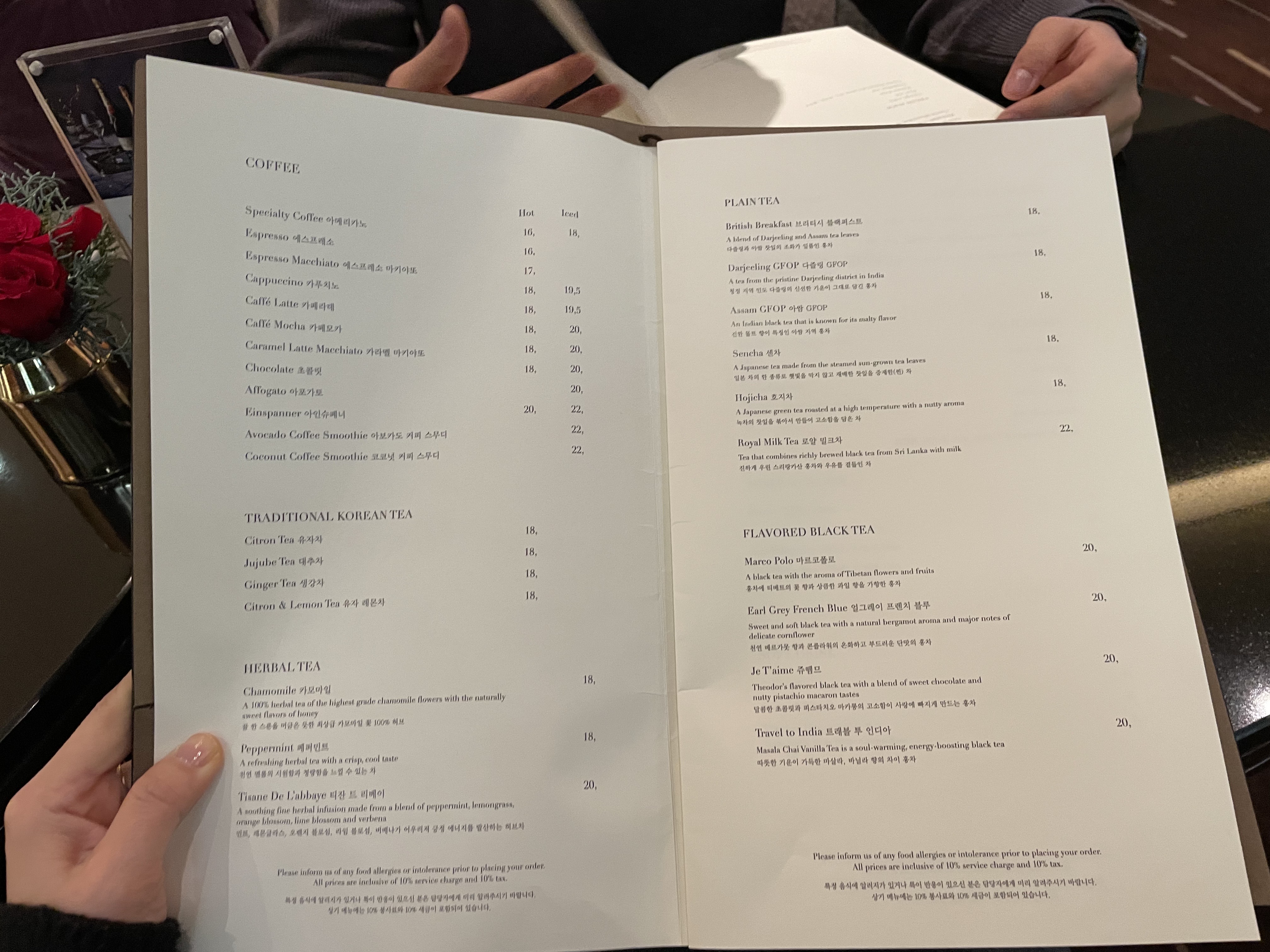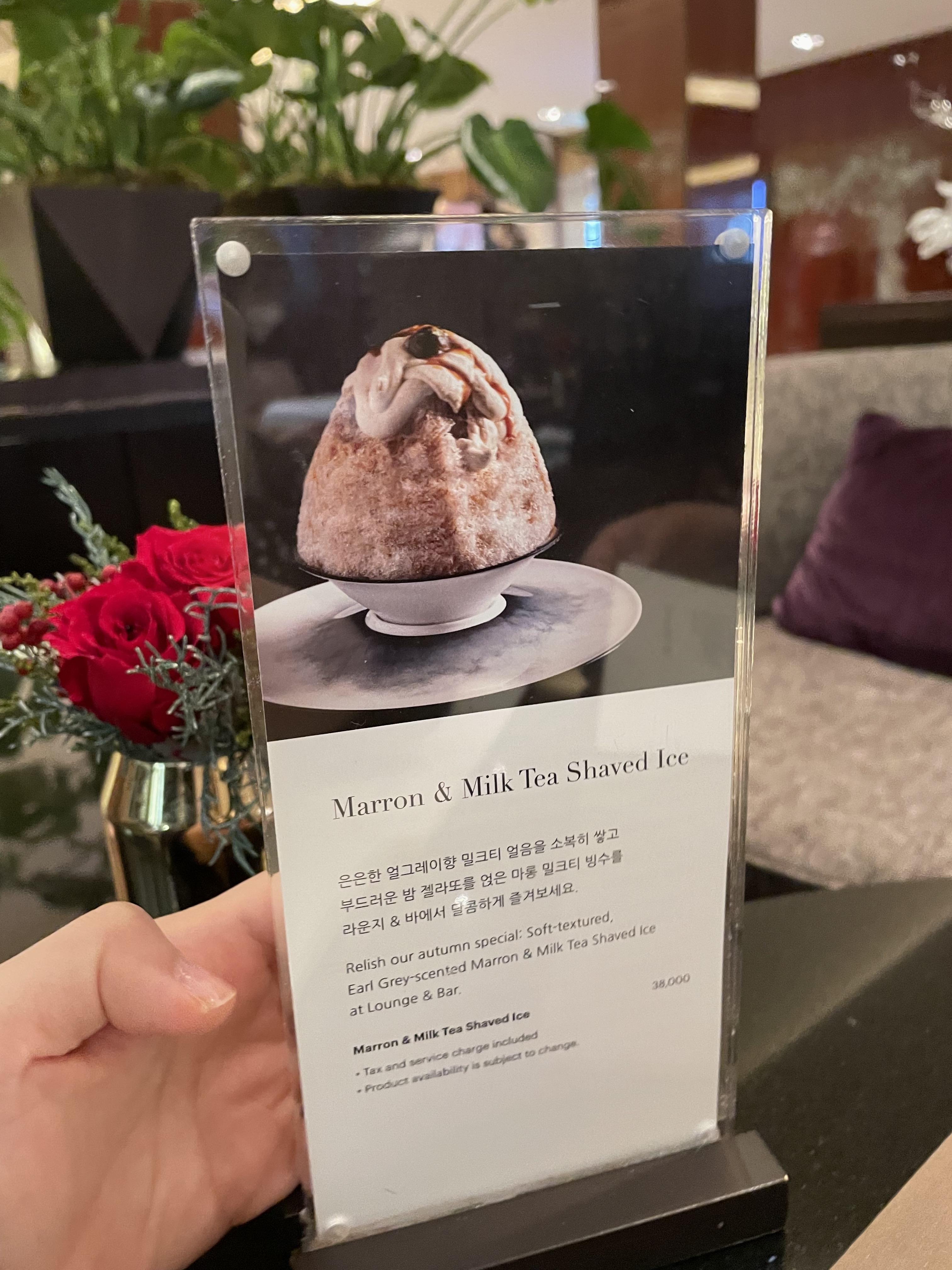 저희는 아이스 아메리카노(18,000원)와, 마롱 밀크티 빙수(38,000원)를 주문했습니다. 빙수는 투숙객이 주문 시 15% 할인해 준다고 합니다.