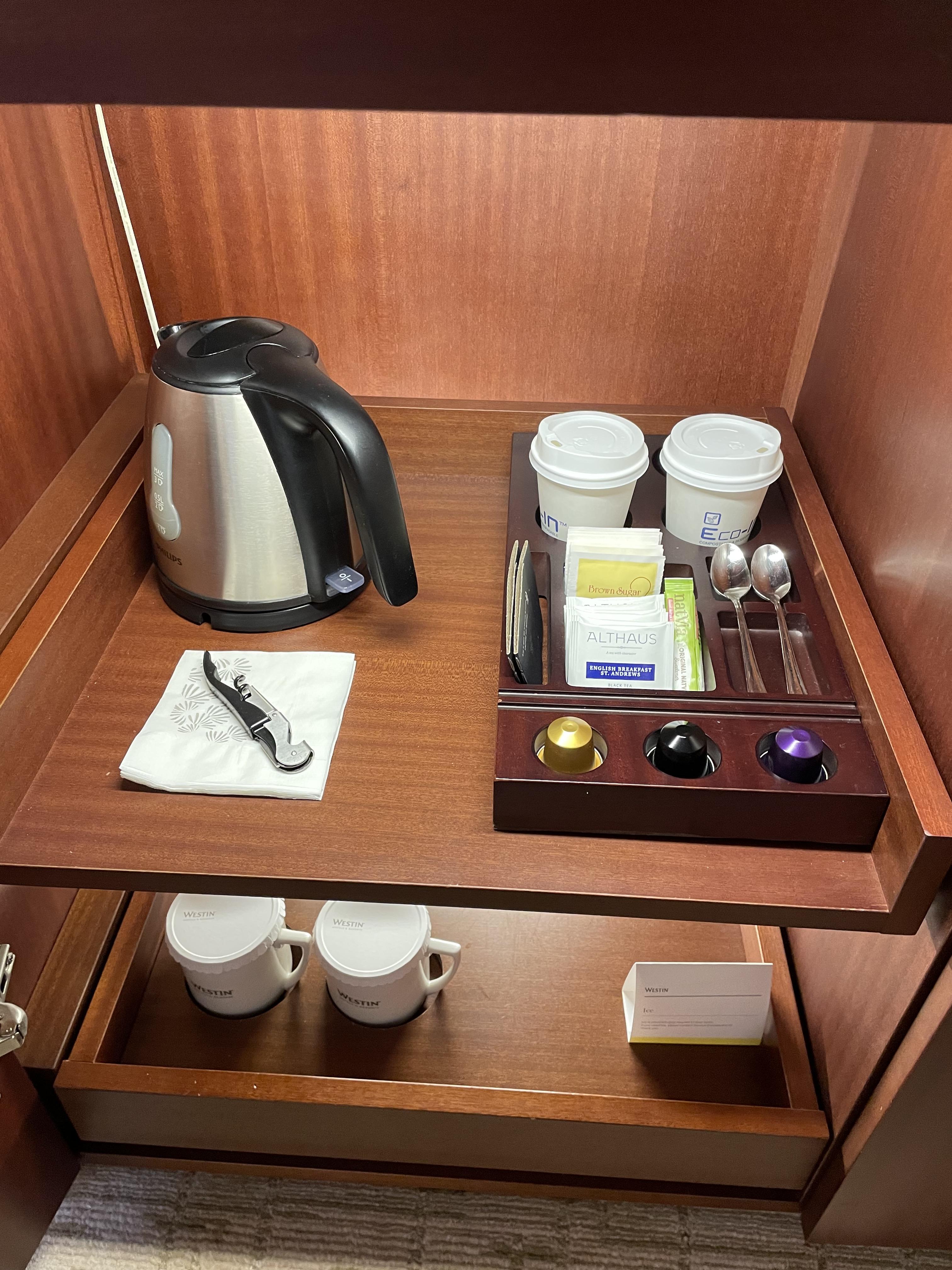 무료로 제공되는 생수와 커피와 티백입니다. 네스프레소 캡슐커피머신이 있고요. 3개의 캡슐커피가 무료로 제공됩니다. 커피포트와 컵, 와인잔, 와인 오프너 등이 있습니다.