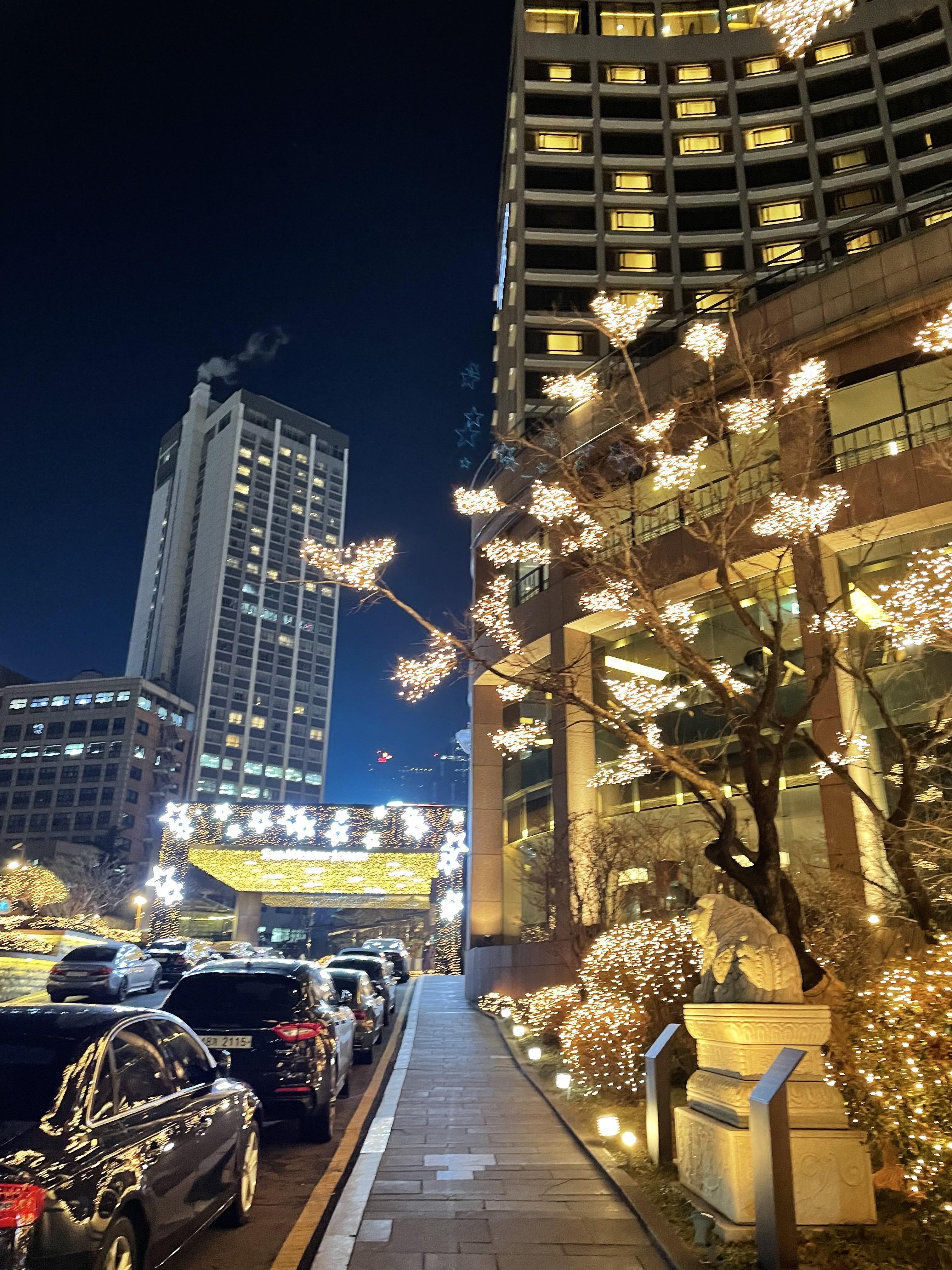 웨스틴 조선 호텔의 밤의 모습입니다. 호텔 근처에는 볼거리들이 참 많았는데요. 걸어서 갈 수 있는 곳이 많아서 좋았습니다.