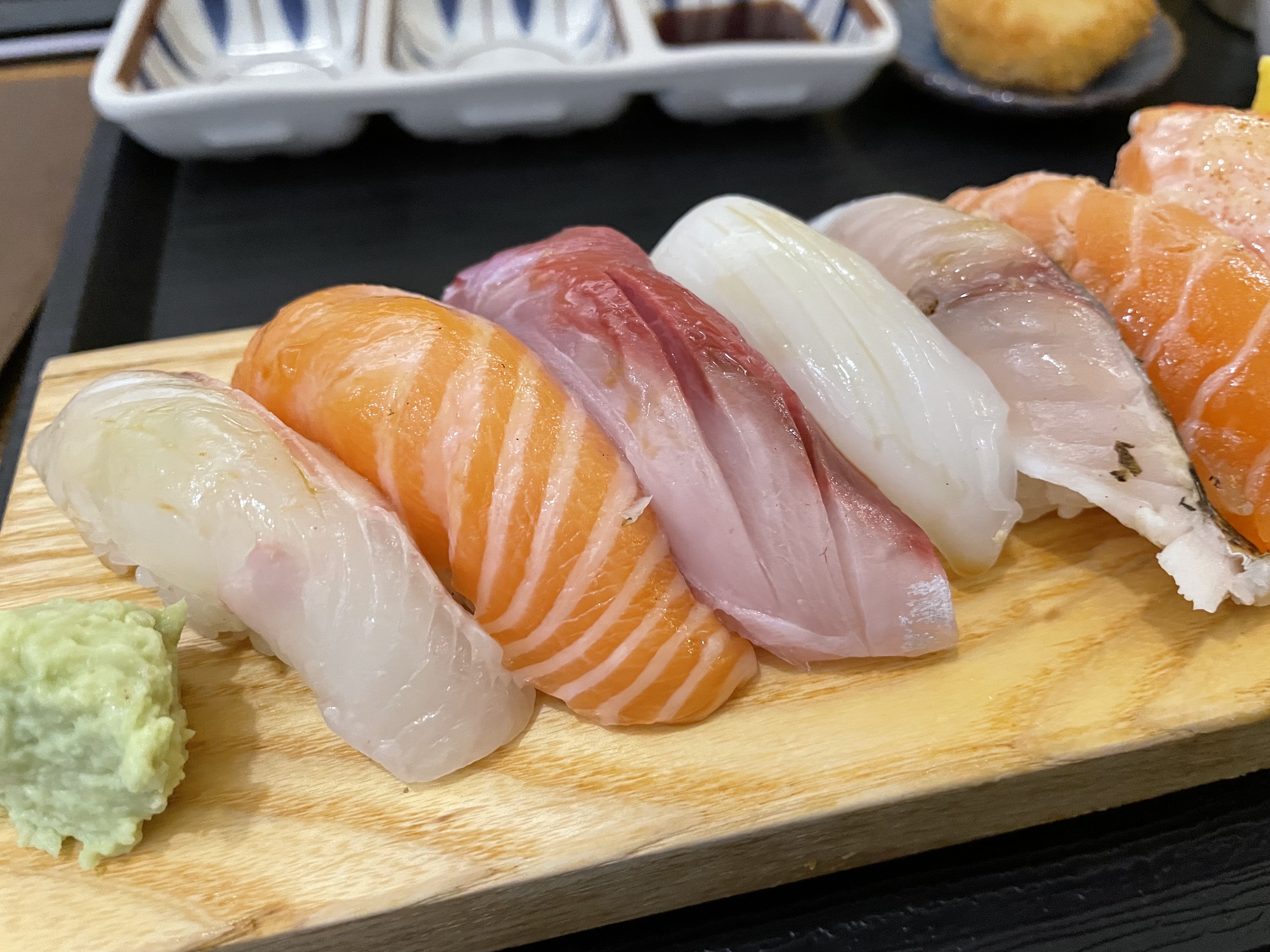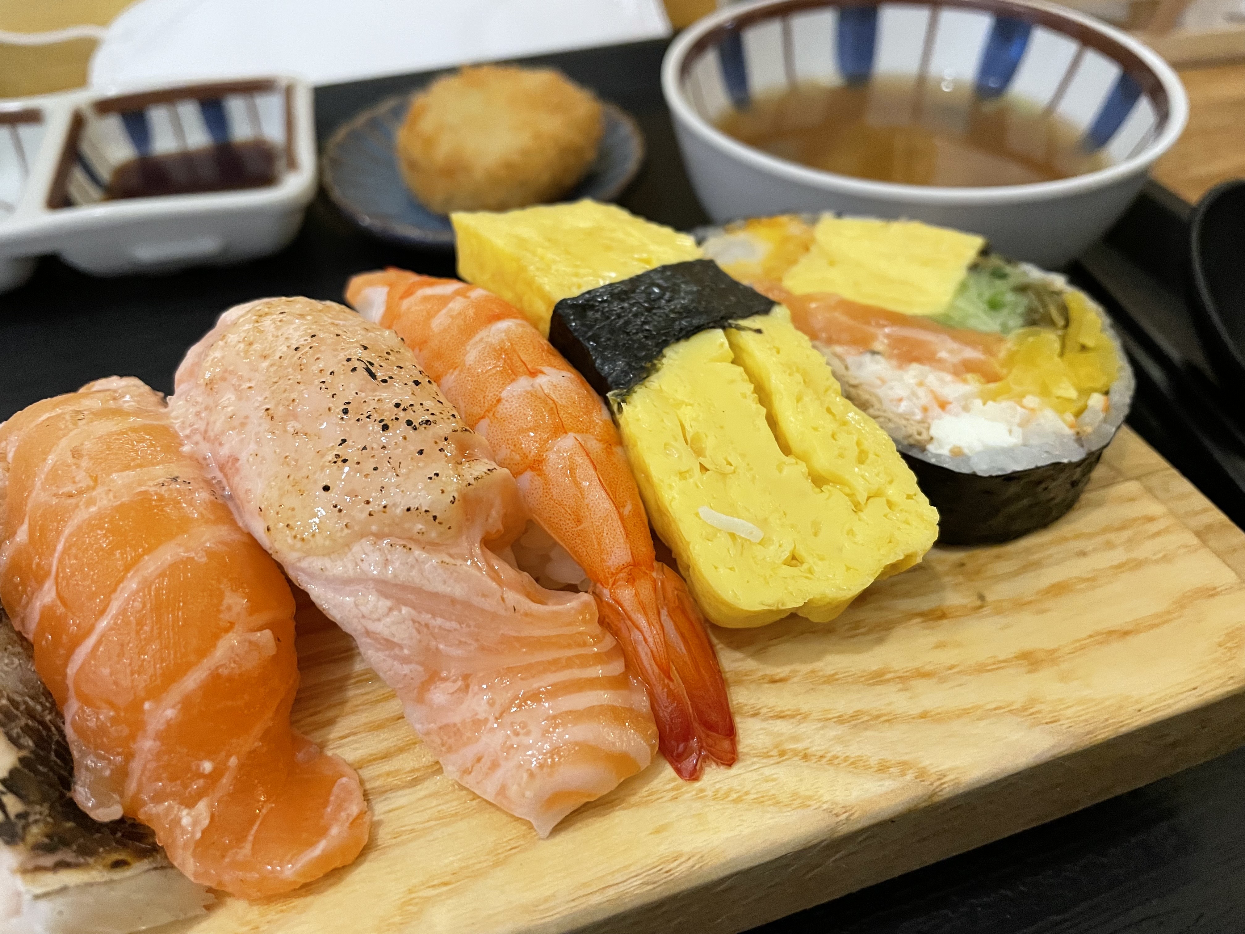 차이점은 구운 연어초밥 대신 고등어인지 청어인지 모르겠는 초밥이 대신 들어가 있다는 점이에요.