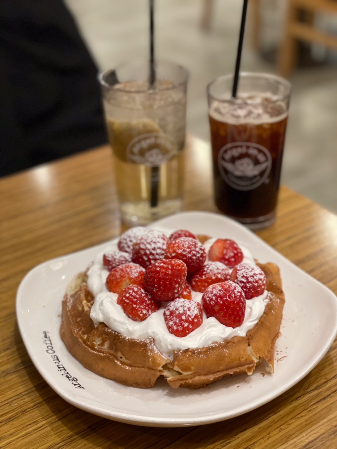 새로 나온 메뉴인 스트로베리 듬뿍 와플과 커피와 차 두 잔을 시켰어요.