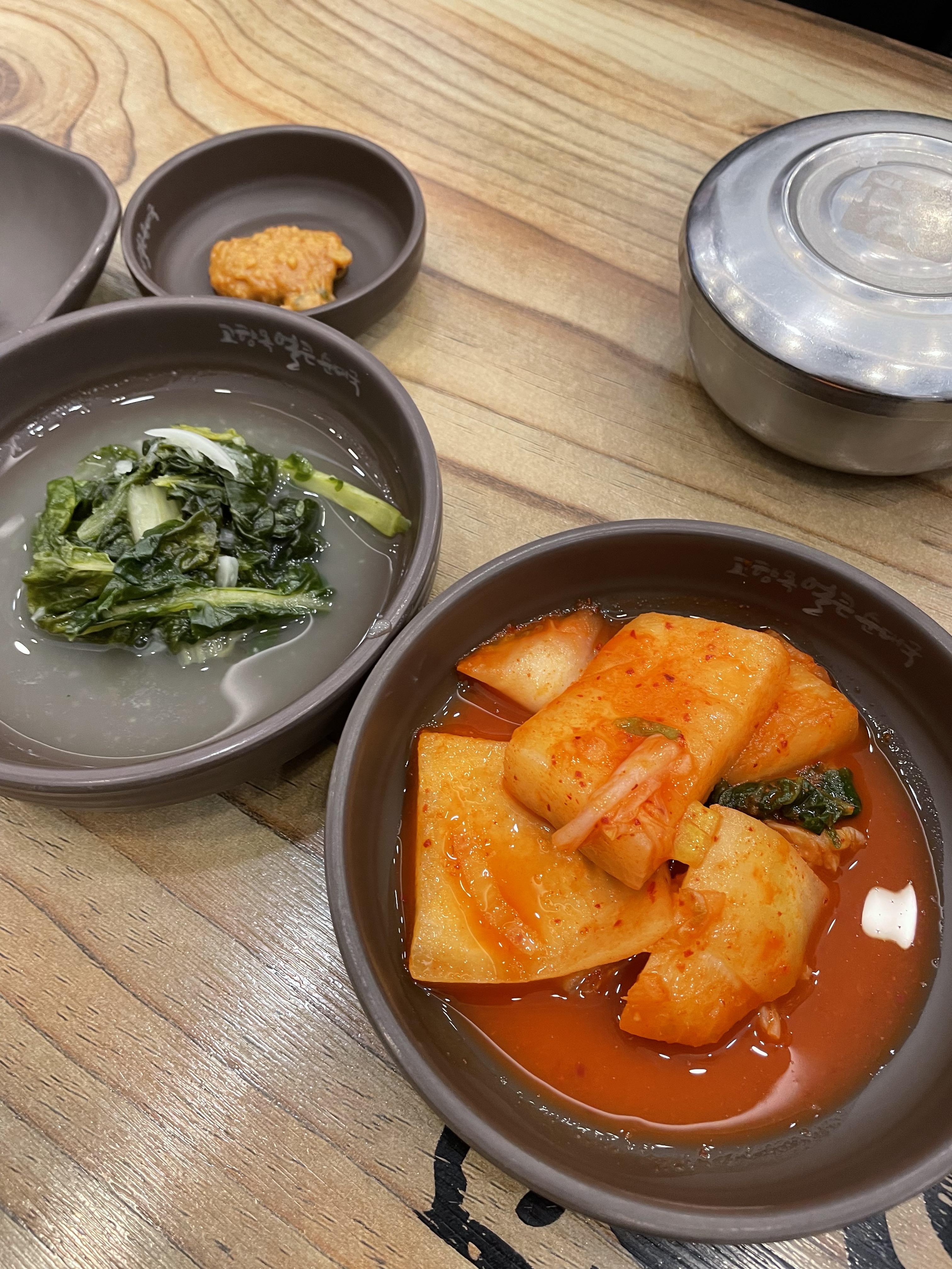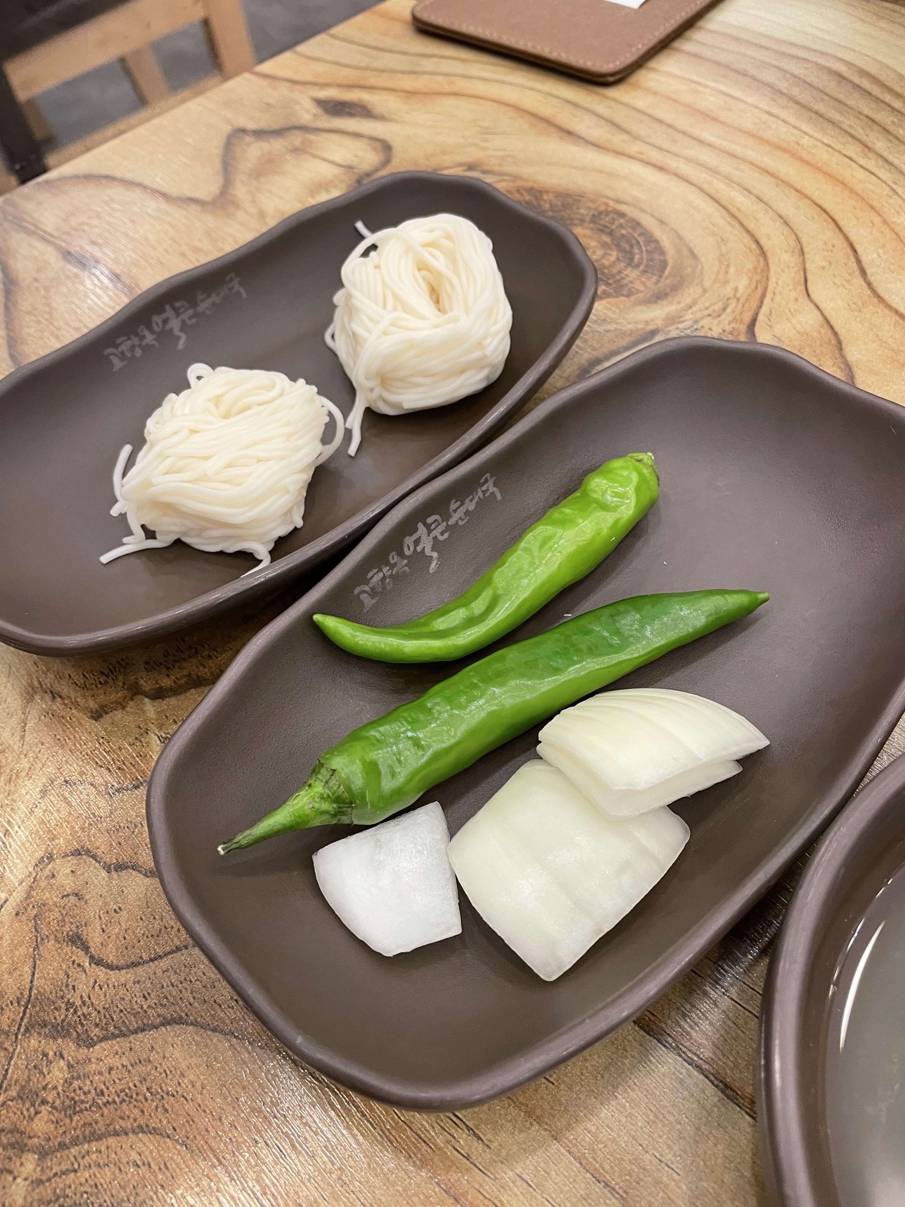순대국을 주문했을 때 나오는 세팅입니다. 국수 소면과 김치, 양파와 고추가 나왔어요.