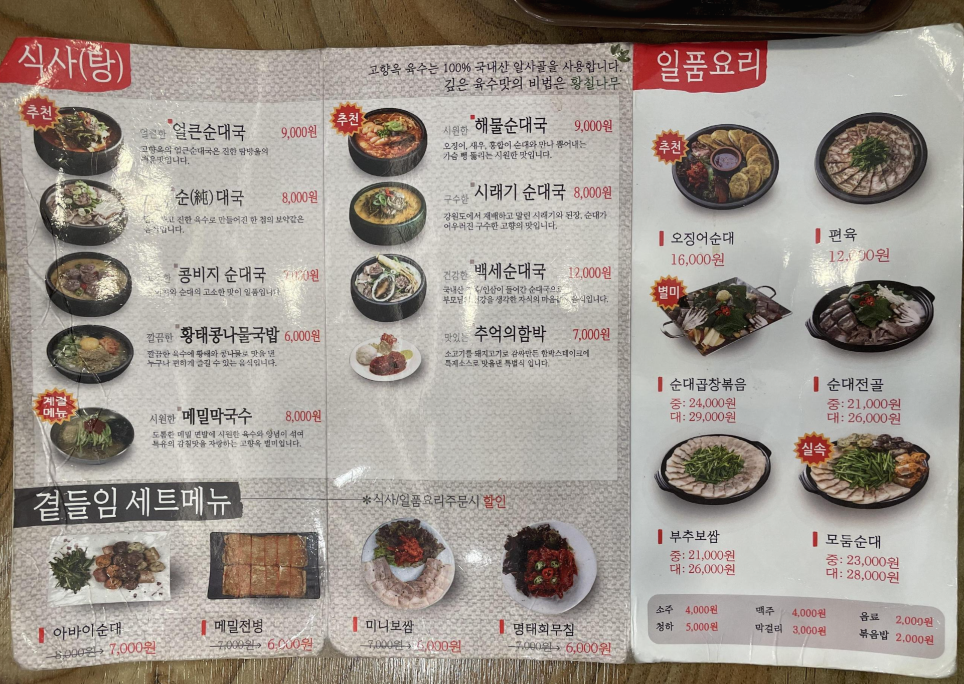 메뉴판입니다. 배가 더 고팠으면 오징어순대도 시켰을 것 같은데, 이 날은 배가 많이 고프지 않아서 그냥 얼큰순대국(9,000원)만 시켰습니다.