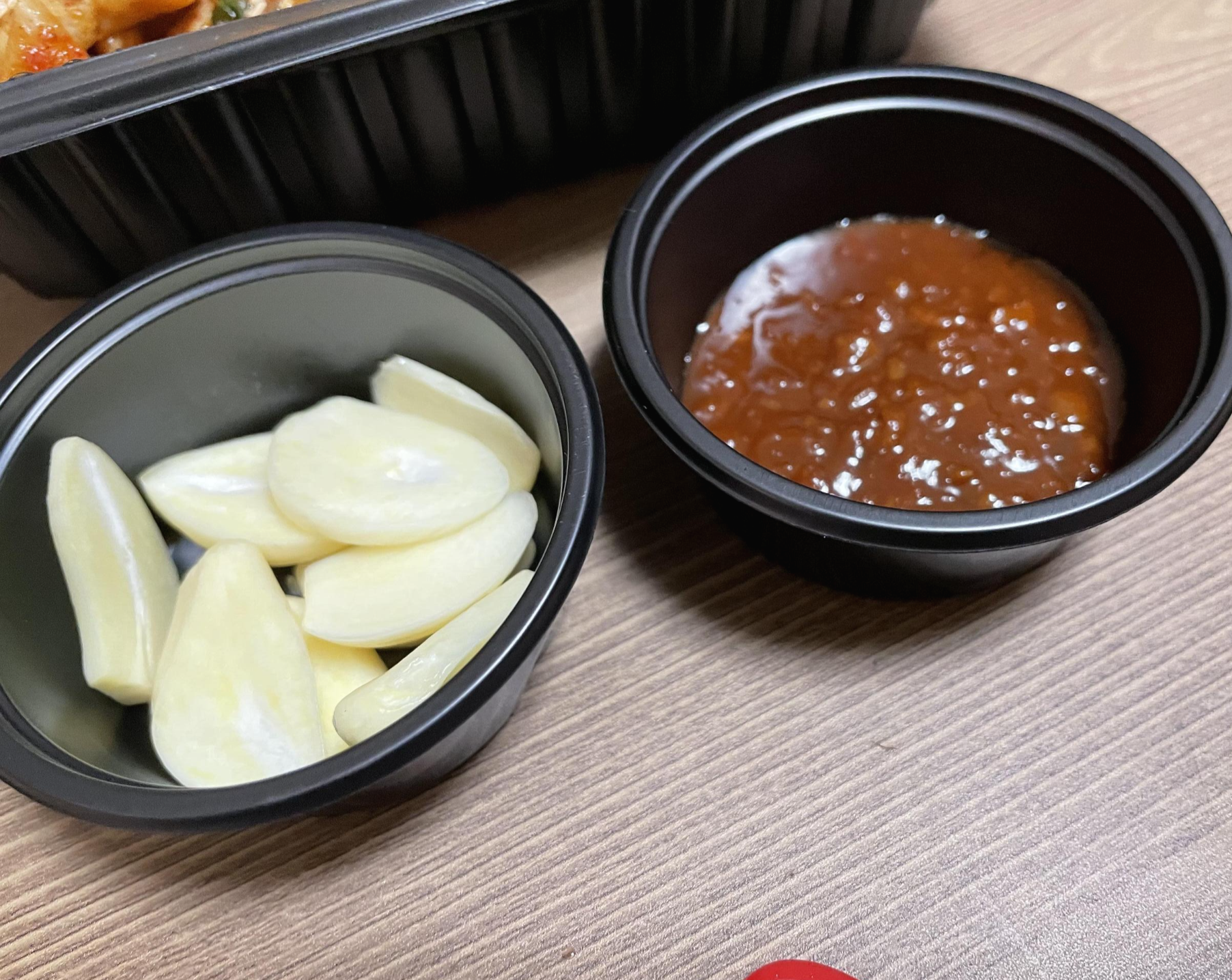 찍어 먹는 장과 마늘도 같이 왔습니다.
