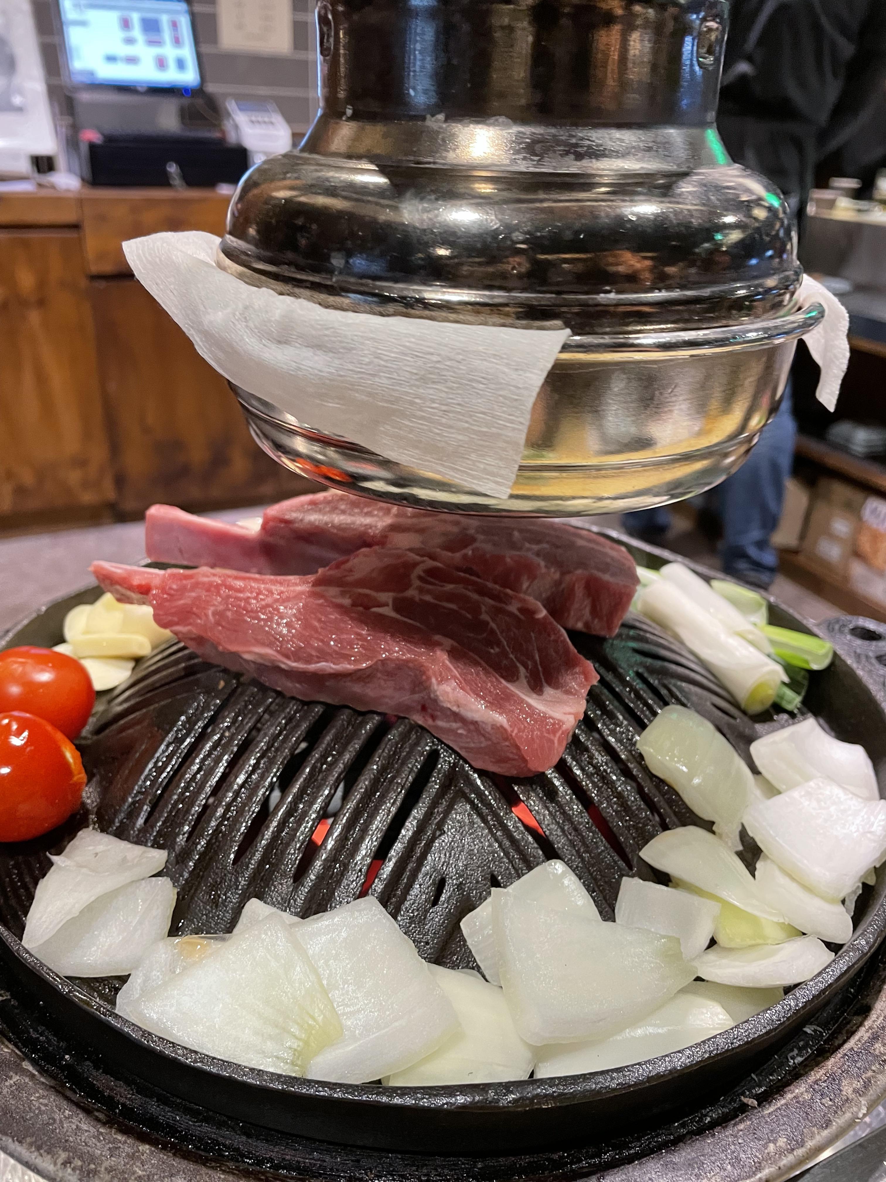 특이한 건 이런 닷지 같은 구조인데, 각 자리 앞에 화로가 있고, 직원분이 가운데서 돌아가며 고기를 구워주시는 것이에요. 고기가 올라가기 전 야채들이 올라가 있습니다.