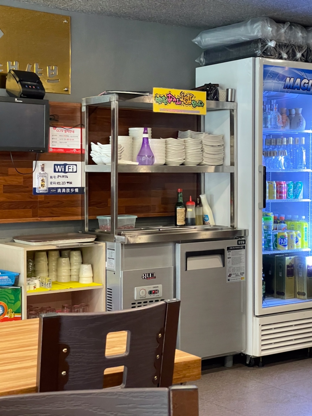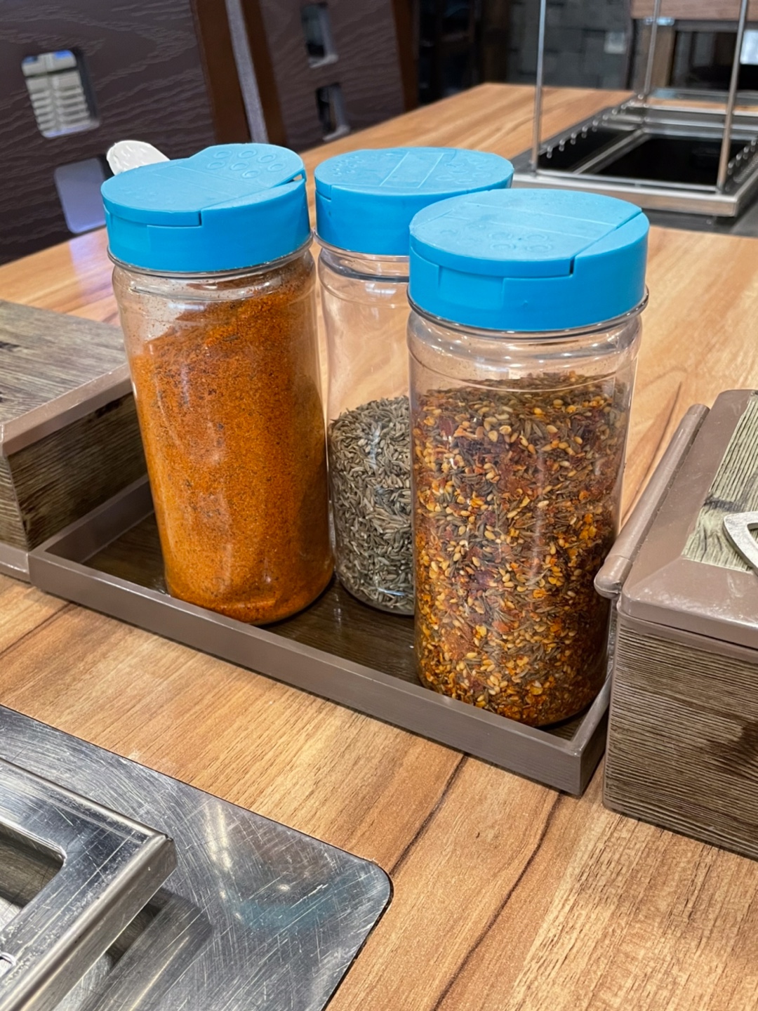 한쪽에는 셀프바가 있어서 단무지 등을 리필할 수 있고, 앞접시도 다 있어요. 테이블 위는 양꼬치를 찍어먹는 소스가 있네요.