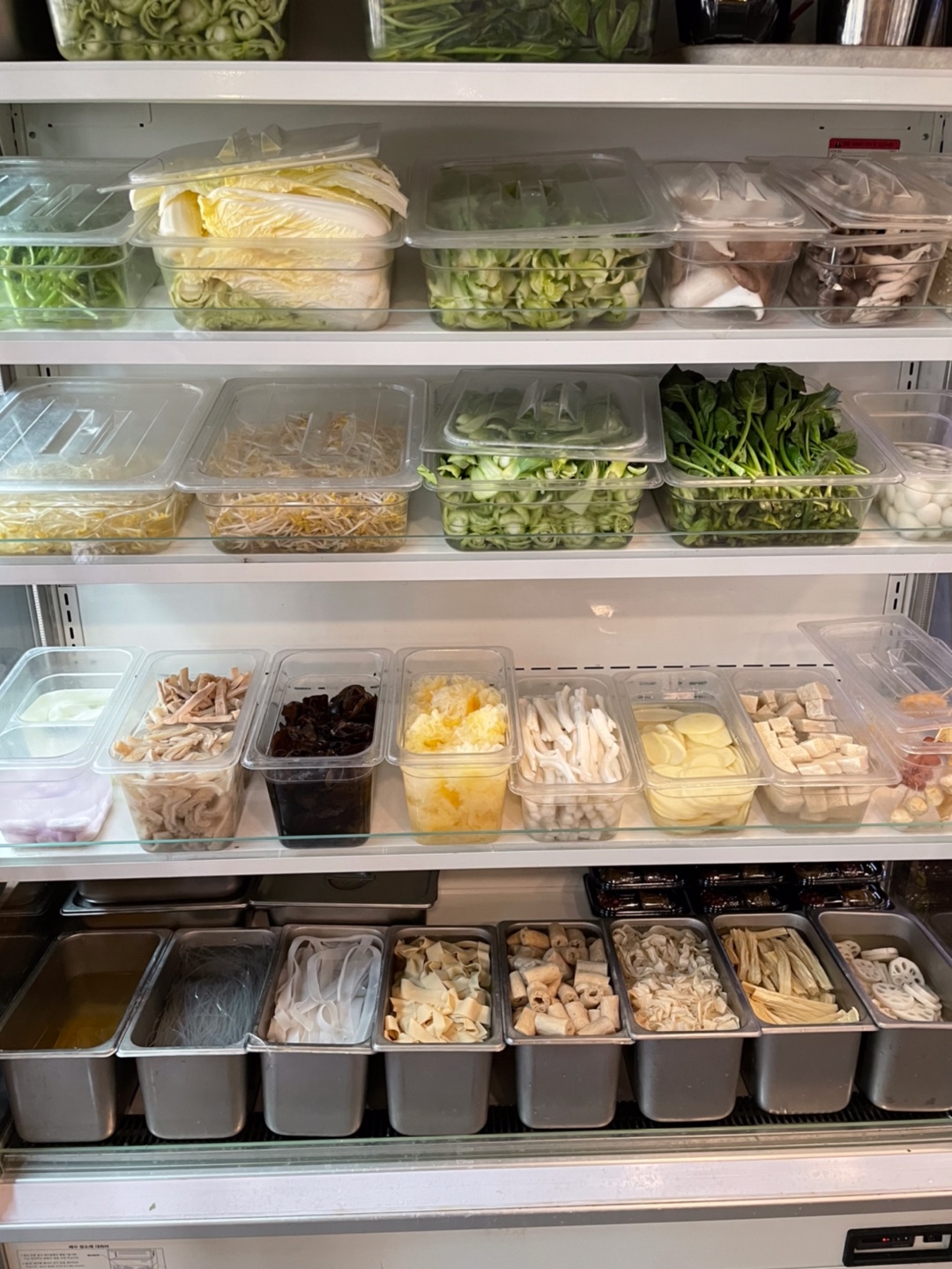 위칸에는 채소들이, 아랫칸에는 면과 사리들이 있어요.