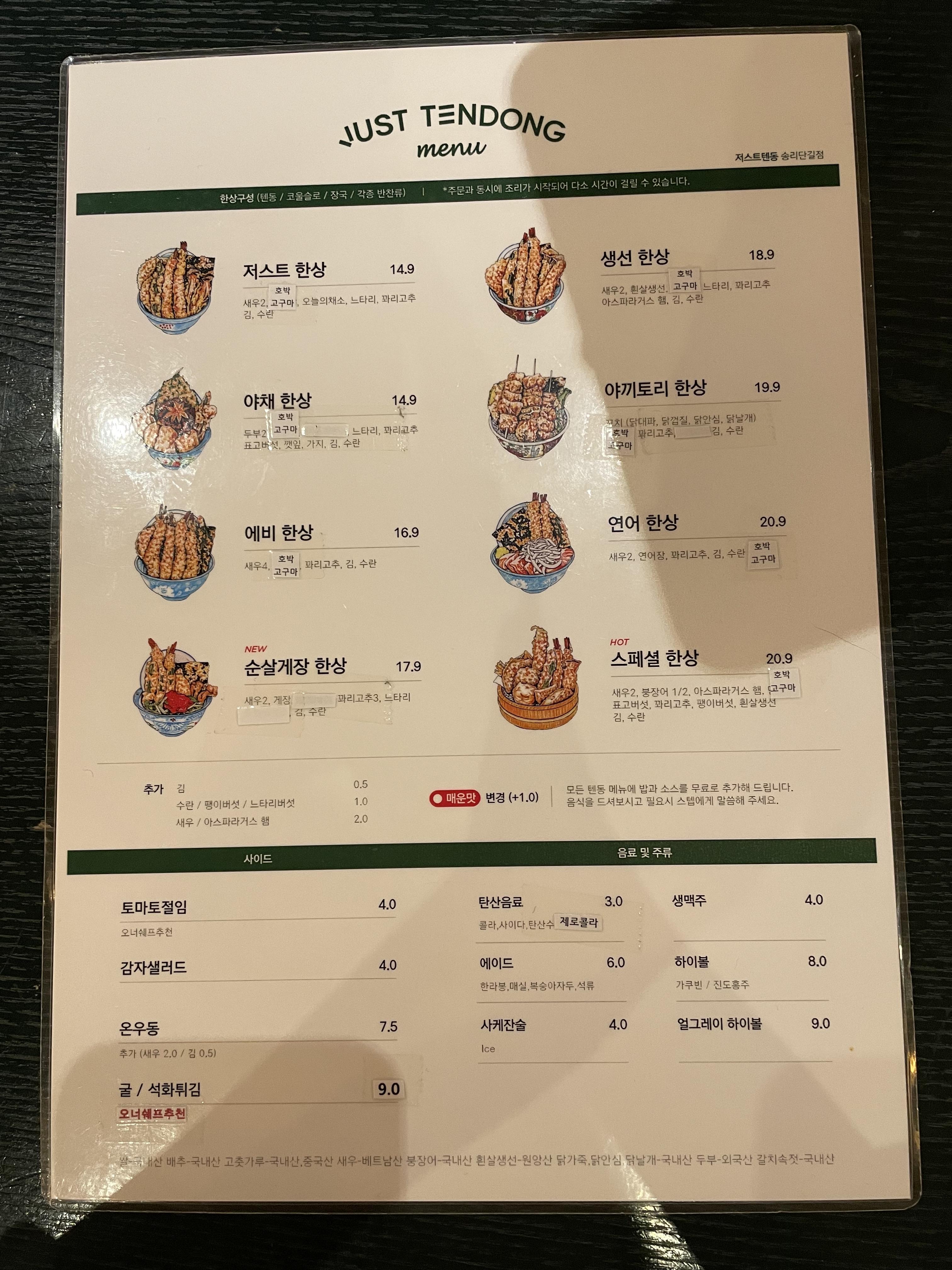 저스트텐동은 워낙 인스타광고가 많이 뜨는 곳이라서 좀 거르고 있었는데, 웨이팅도 없고 해서 한 번 방문해봤습니다. 브레이크타임이 5시에 끝나는데 그때까지 사람들이 줄 서있고, 5시 지나서 사람들이 다 들어가니깐 웨이팅이 없더라고요.