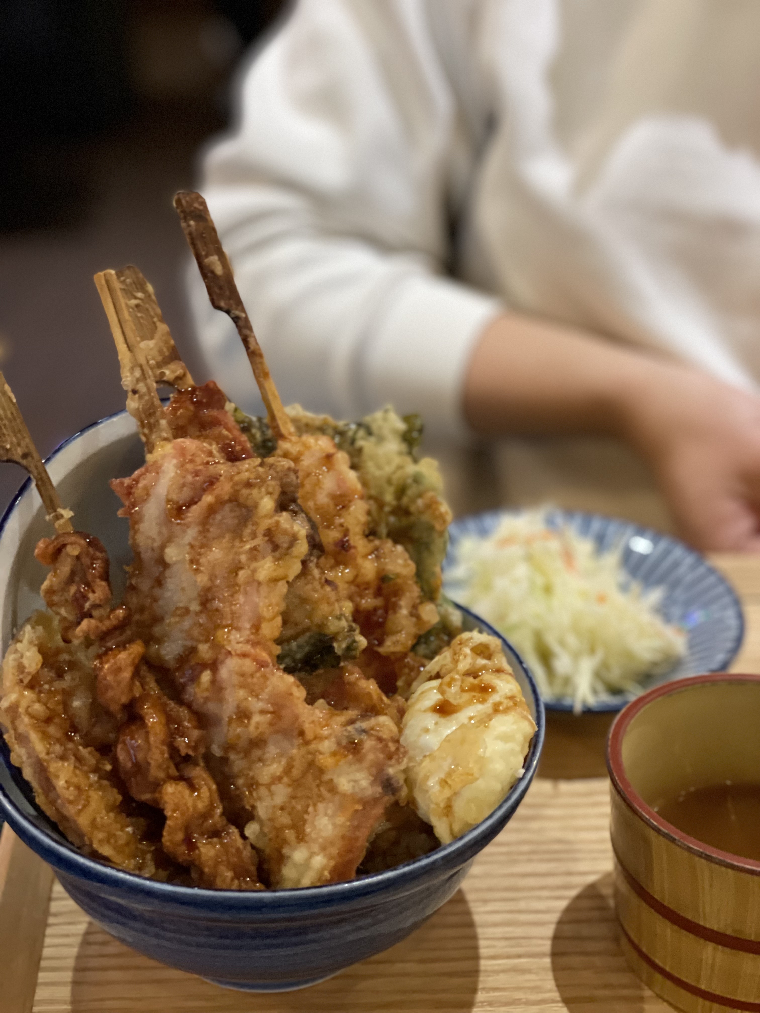 먹는 방법은 그릇위에 꽂힌 작은 접시에 튀김들을 옮겨 담고, 수란을 터뜨려 밥을 비벼 먹으면 됩니다. 고추냉이 등을 곁들여 먹으면 되고요.