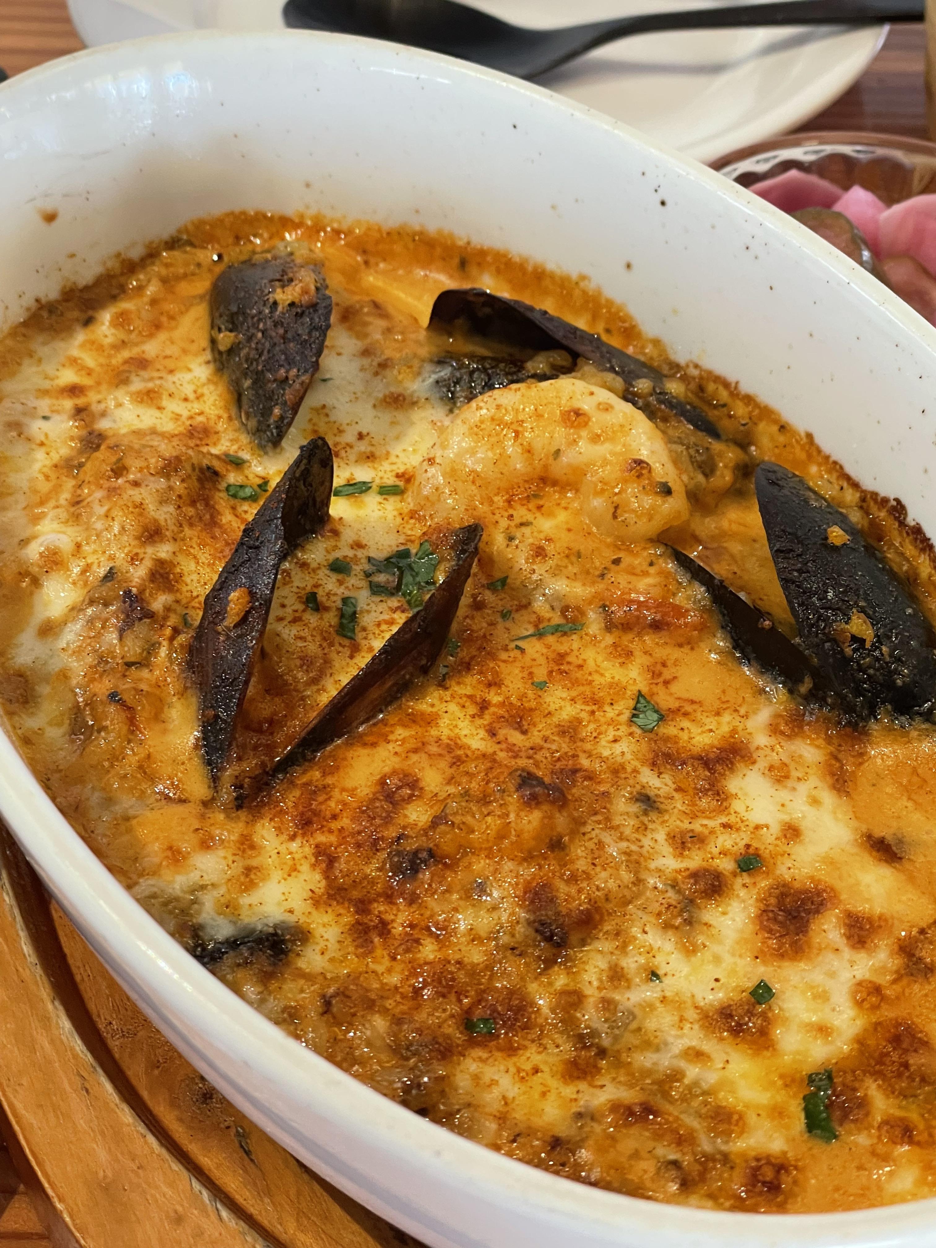 해산물이 들어간 로제리조또예요! 치즈가 듬뿍 뿌려져 있었답니다.