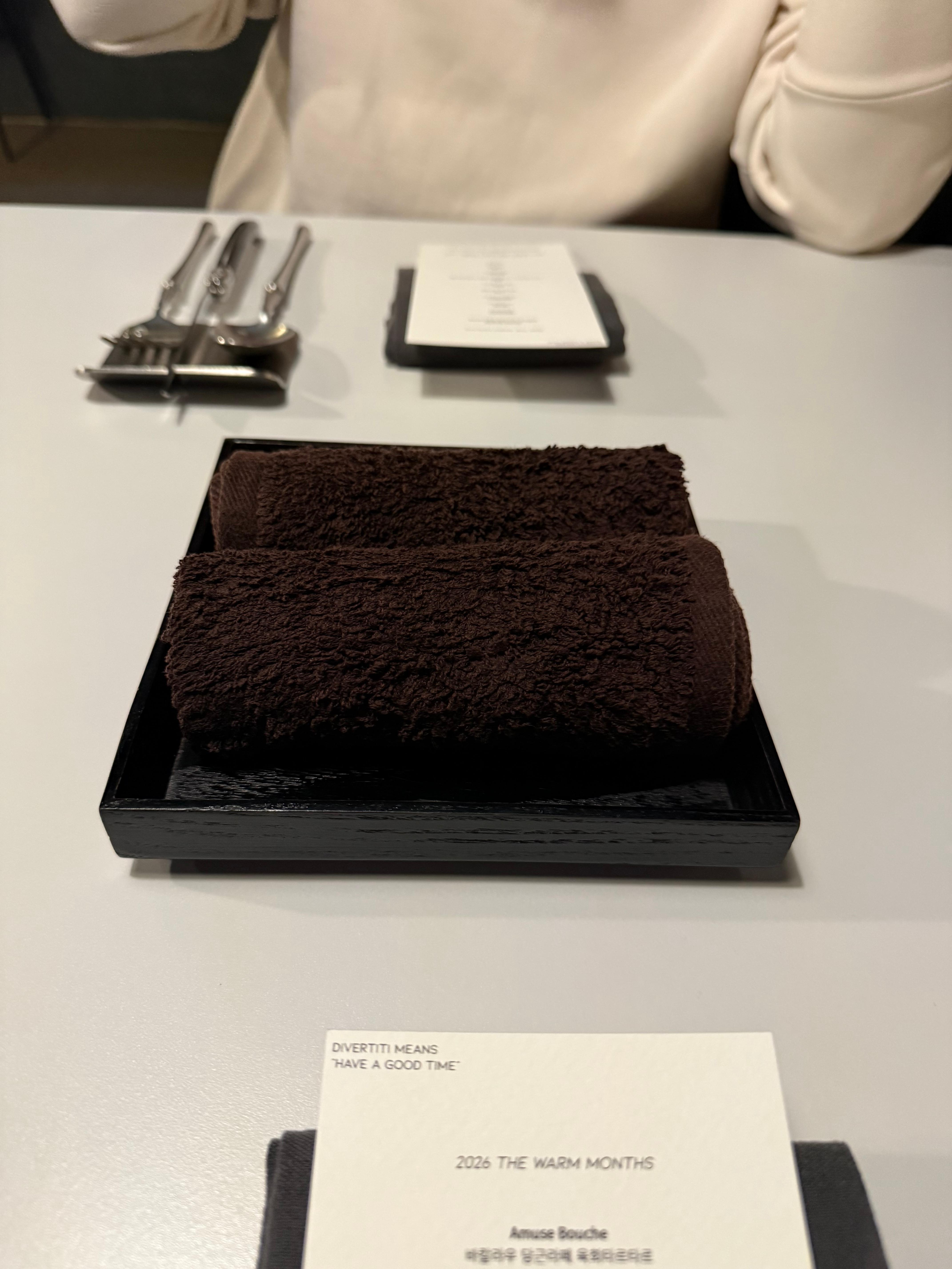 전반적으로 깔끔하고 고급스러운 세팅입니다. 물수건을 주셨어요.