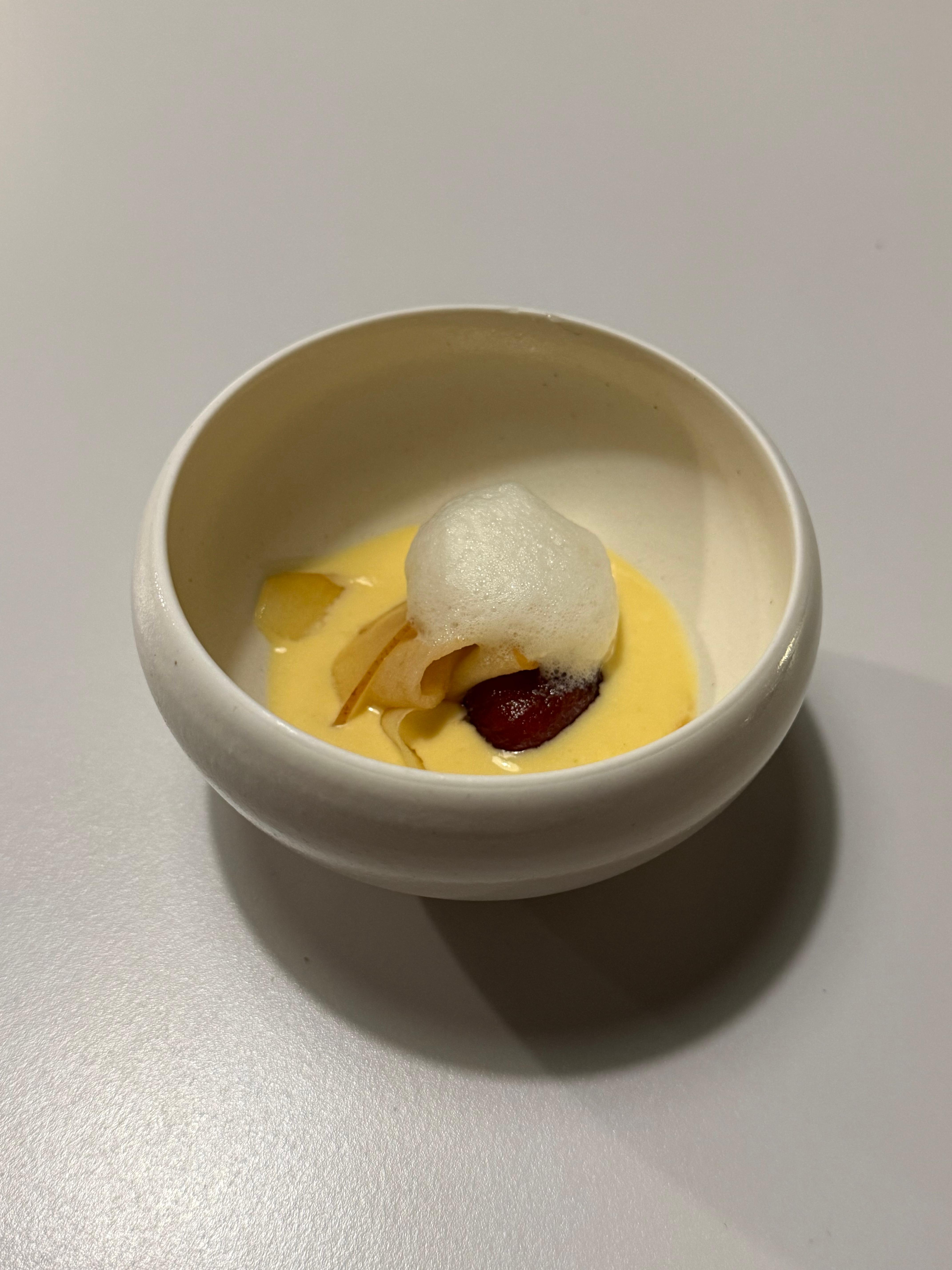 절인 사과와 토마토가 들어가 있고, 위에는 폼이 올라가 있습니다. 토마토 먼저 시식하라 하셨는데, 토마토절임이 너무 맛있었어요! 새콤함과 고구마의 달콤함의 조합이 좋았어요.