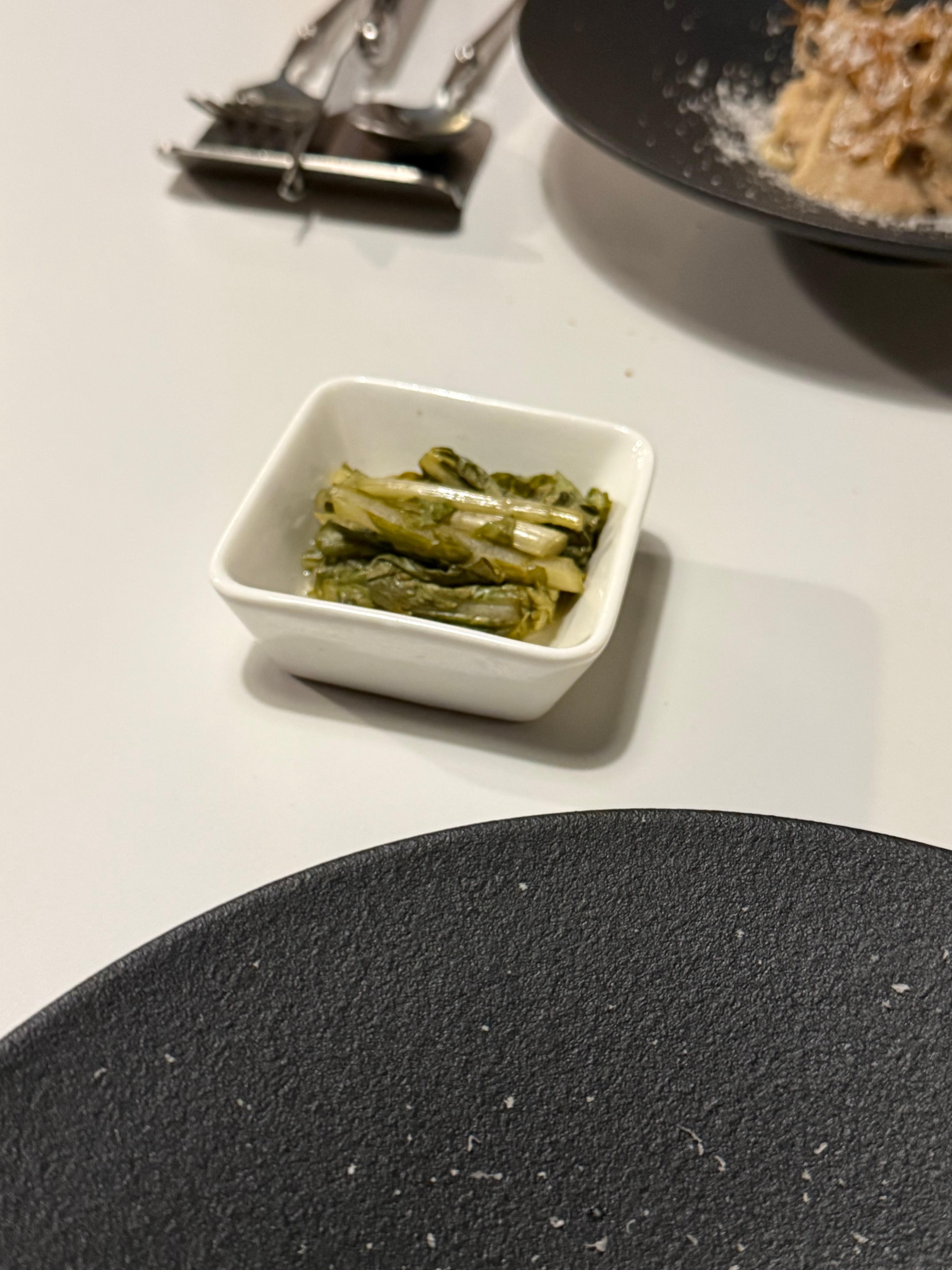자연산 참돔과 배로 만든 폼, 아래는 아스파라거스와 시금치가 있었어요.