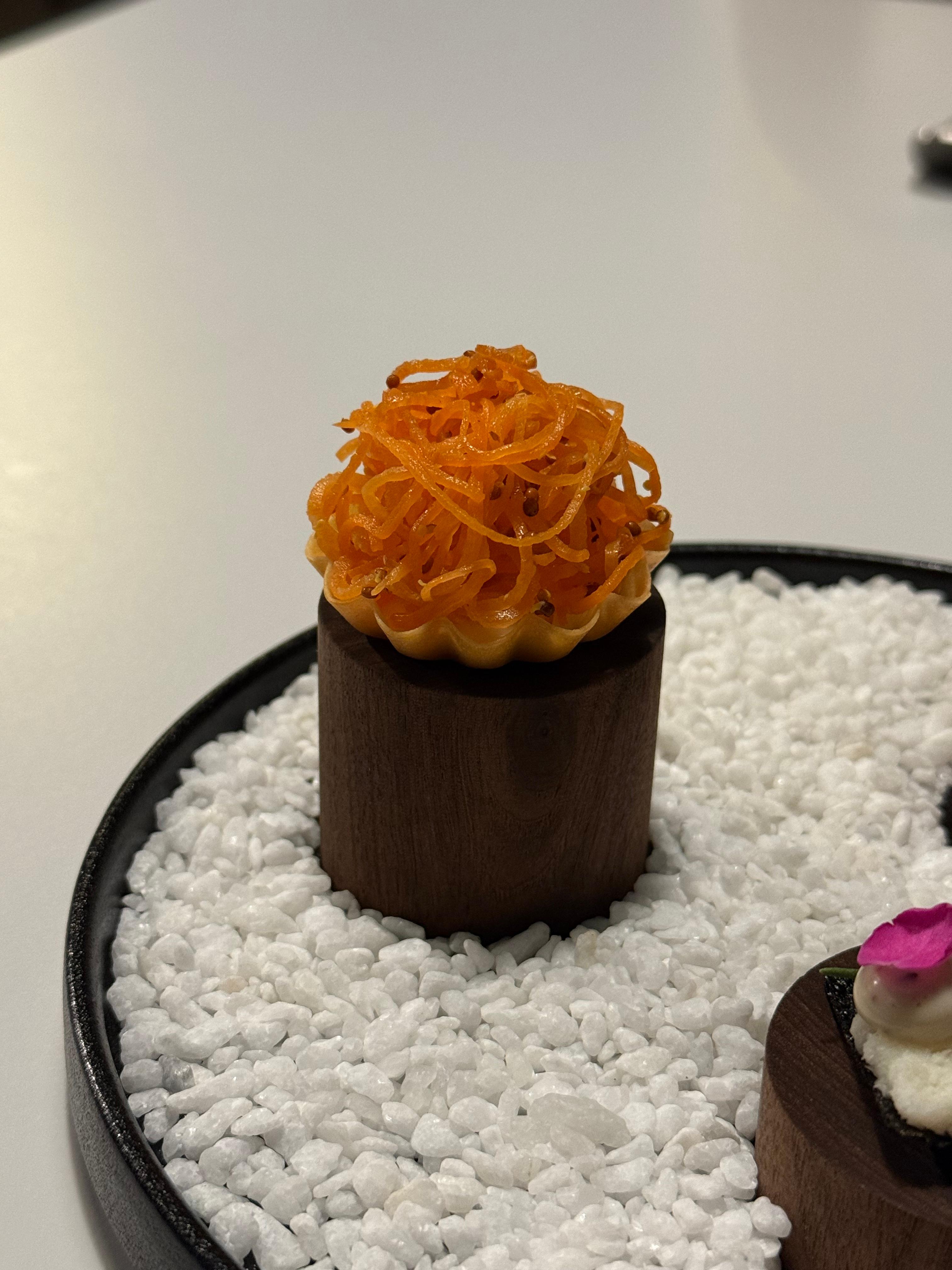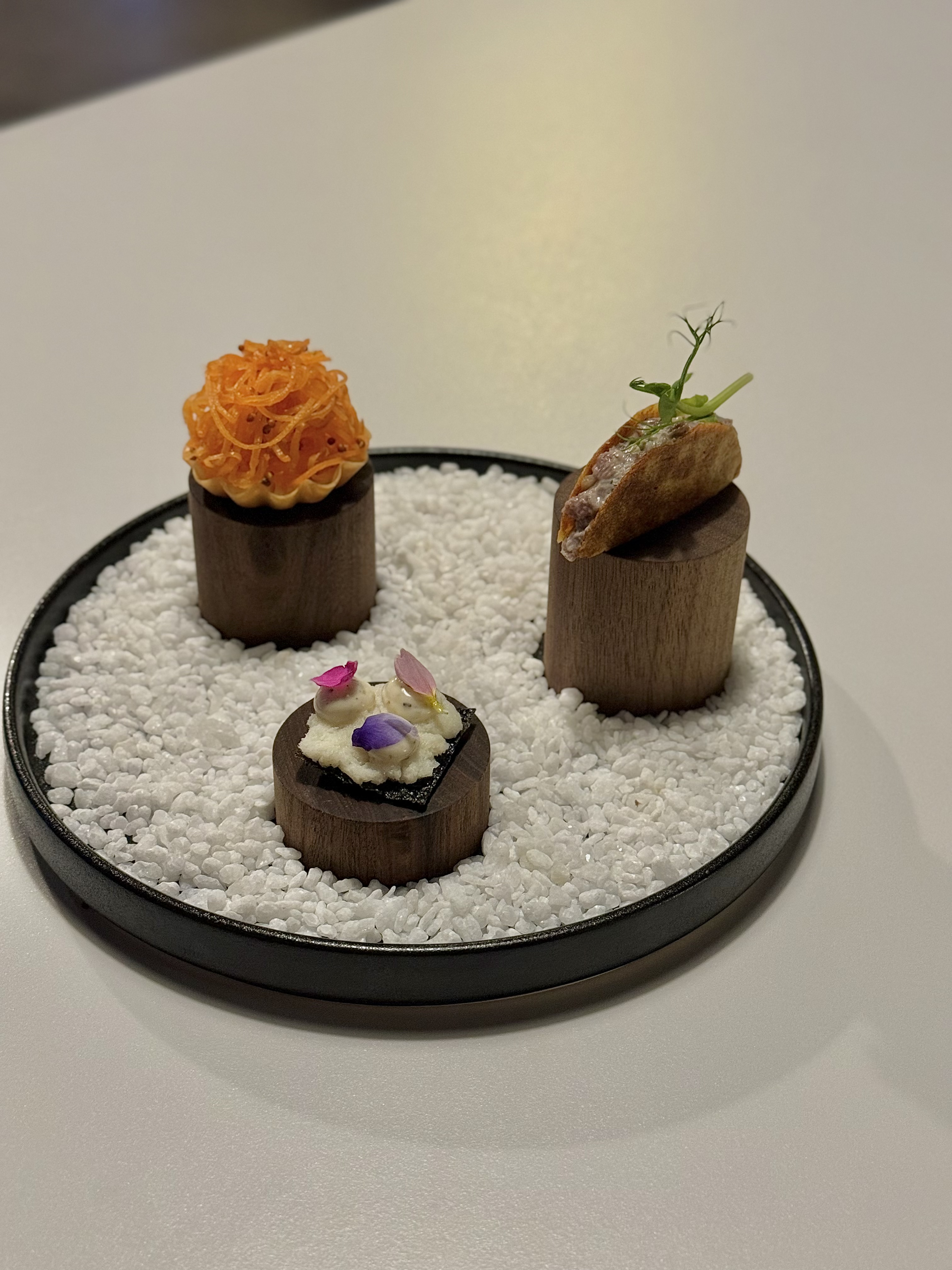 아뮤즈부쉬로 나온 바칼라우, 당근라페, 육회타르타르 입니다. 먹는 순서는 높이가 낮은 순서대로 먹으면 됩니다.