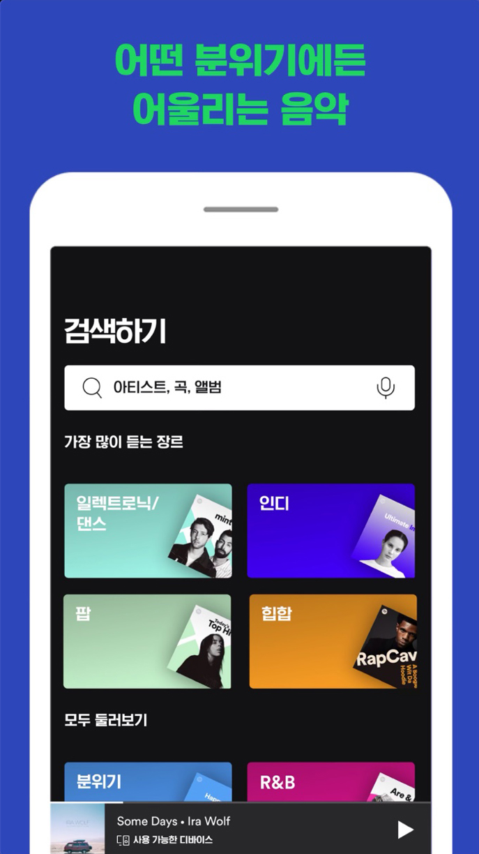 스포티파이 는 6천만곡 이상의 트랙과 40억개 이상의 플레이리스트를 보유한 세계 최대 오디오 음원 스트리밍 서비스로, 현재 한국을 포함 93개 국가 3억 2000만명 이상의 이용자가 사용하고 있습니다.