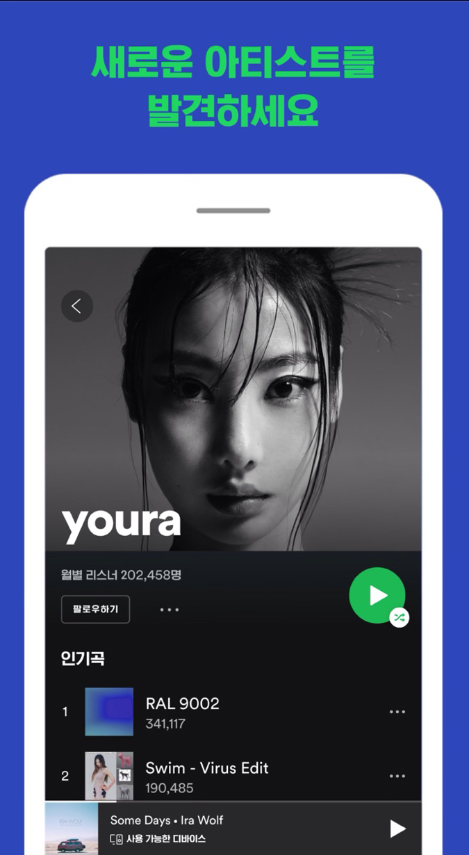 그럼에도 불구하고 스포티파이 를 사용하는 이유는 국내 음원 플랫폼들이 따라갈 수 없는 정교한 사용자 맞춤 음원 추천서비스입니다. 어플을 설치하면 좋아하는 아티스트를 선정하게 되는데요. 최초 선정한 3팀을 기반으로 추천곡을 제안합니다. 이 후에도 유저의 활동을 기반으로 매일 새로운 추천리스트를 바꿔 제공합니다.