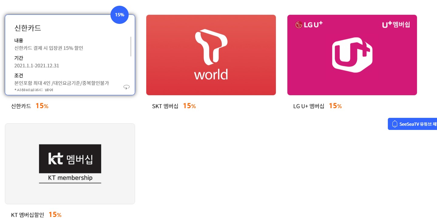 제휴 할인은 통신사 3사와, 신한카드가 되네요!