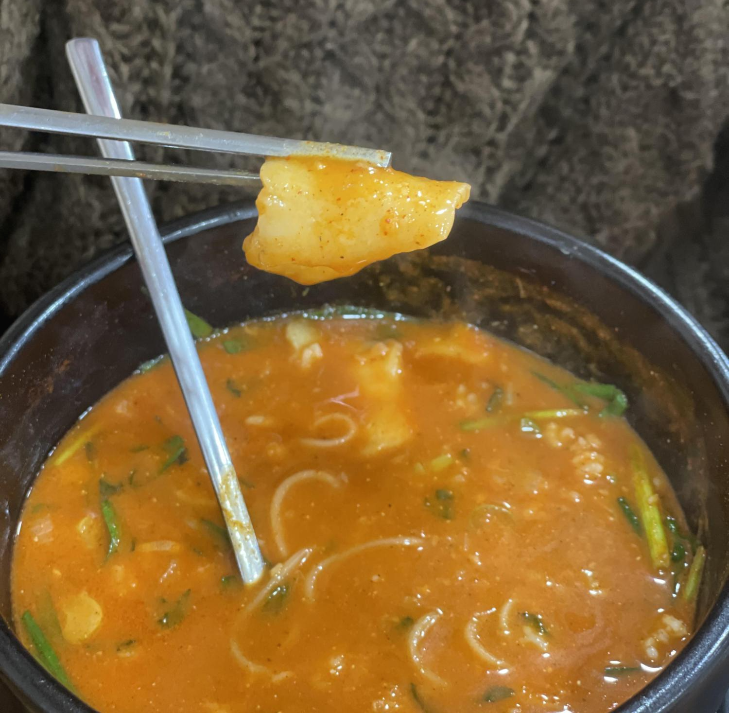 먹다 보면 이렇게 안에 수제비도 들어가 있어요. 소면도 있고, 밥도 있고 여러 가지가 들어있어서 너무 좋은 것 같아요!