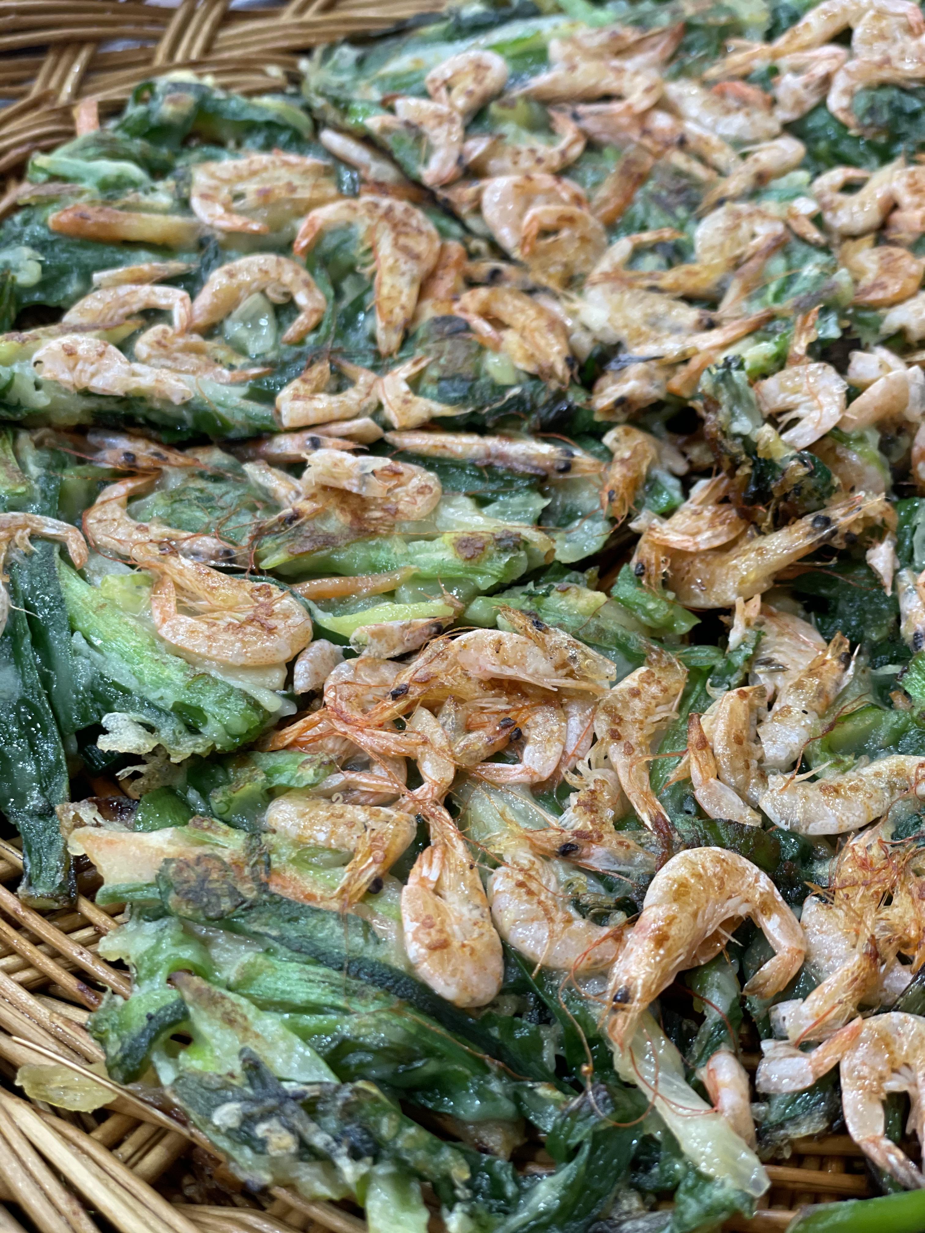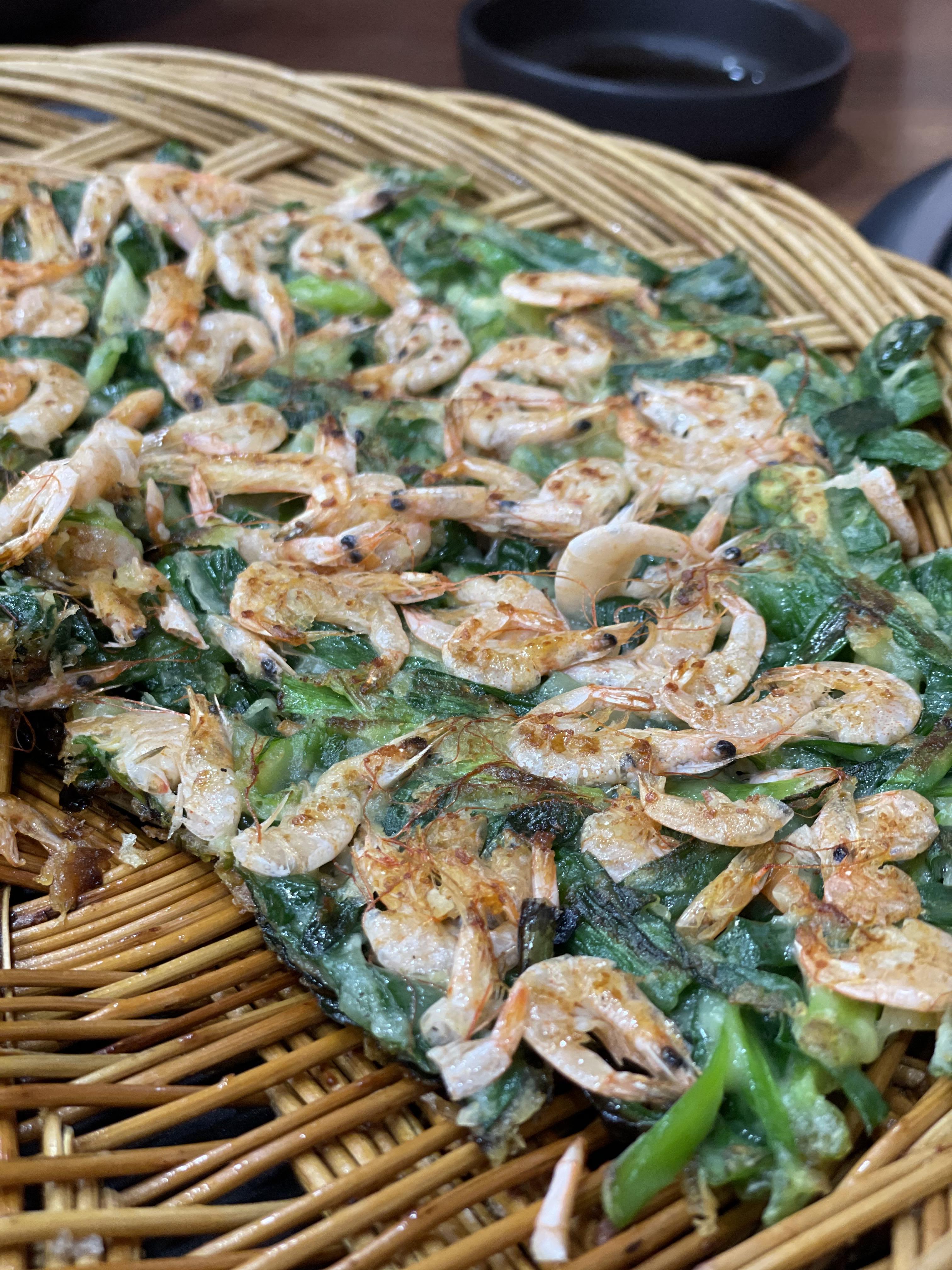 일단 느낌은 부추전이나 파전에 바삭한 새우가 올라간 느낌인데요. 전의 식감과 새우의 바삭함이 어우러져 맛있었어요.