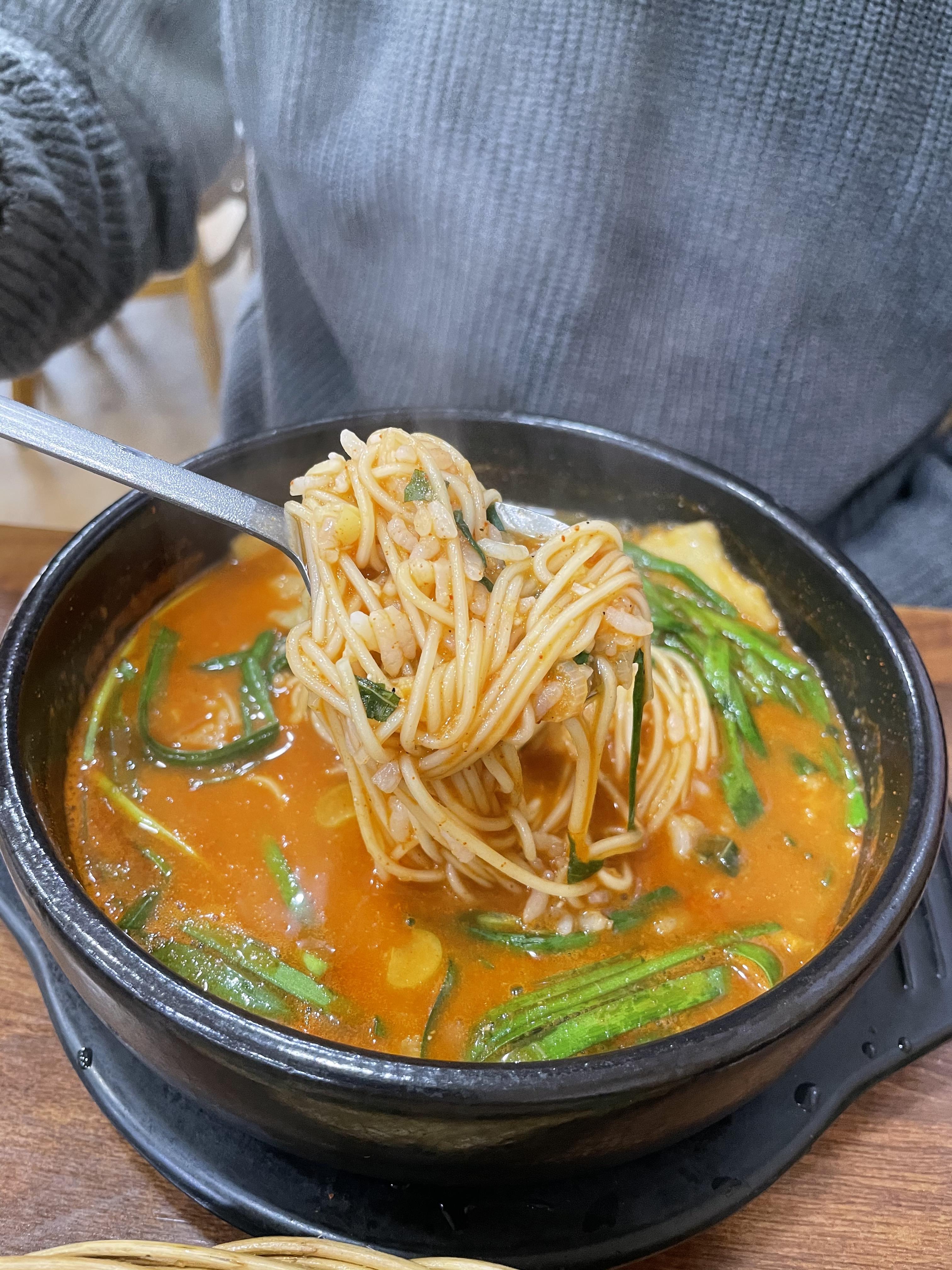 맛을 설명하자면 약간 장칼국수 같은 느낌이에요. 국물은 맑진 않고 걸쭉한 느낌인데 텁텁하다기 보단 얼큰하죠.
