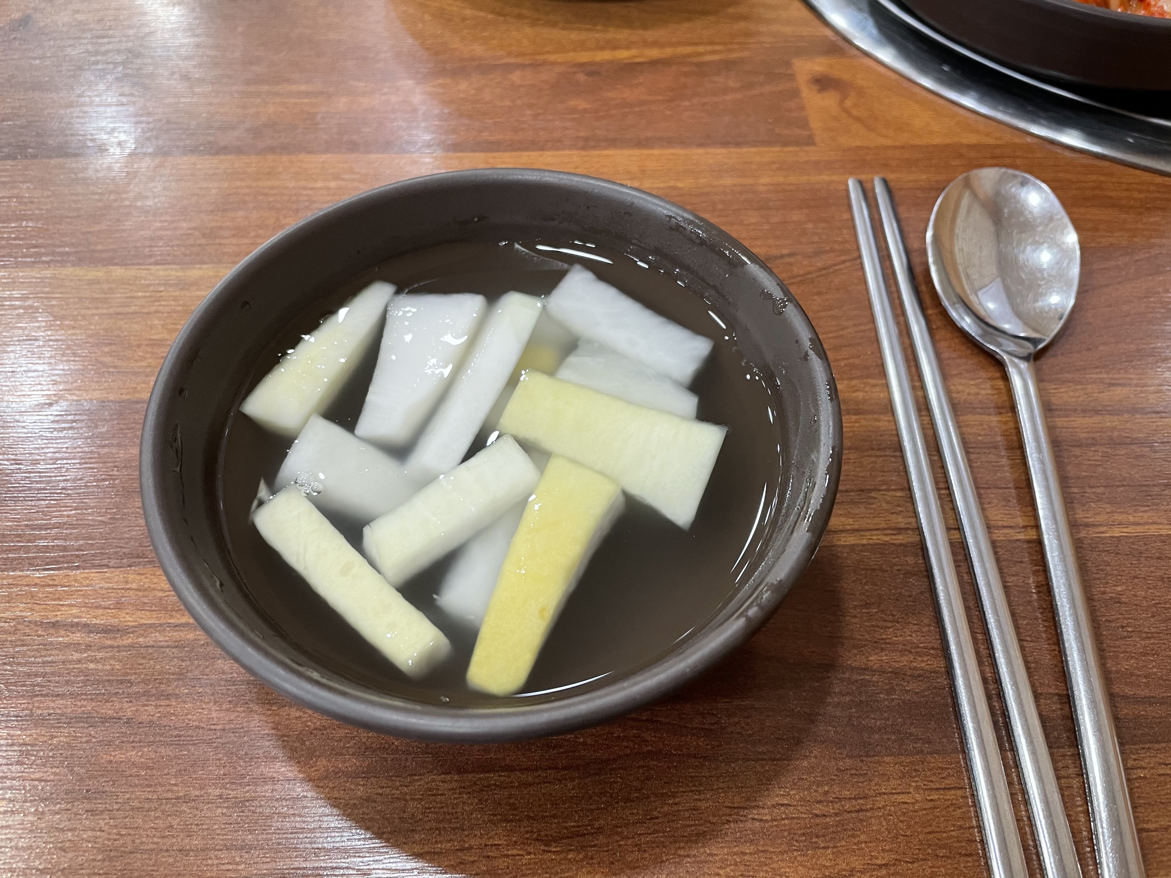 기본 상차림은 일단 간단해요. 동치미 국물이 시원해요. 한 그릇 더 리필해서 먹었어요.