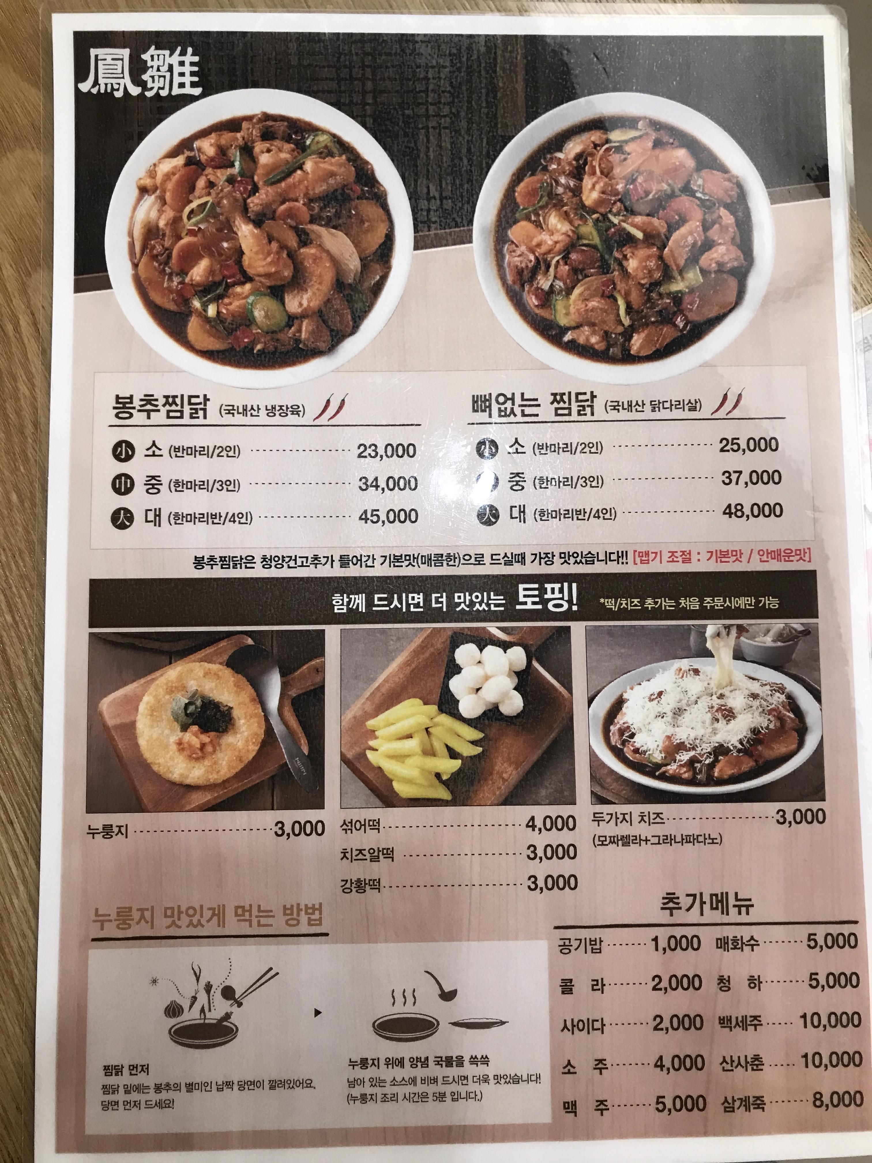 메뉴를 쭉보고, 두 명이라 뼈 없는 찜닭 소자(반마리/2인용)를 맵기는 기본 맛으로 하고, 누룽지, 섞어떡, 공기밥을 시켰어요.