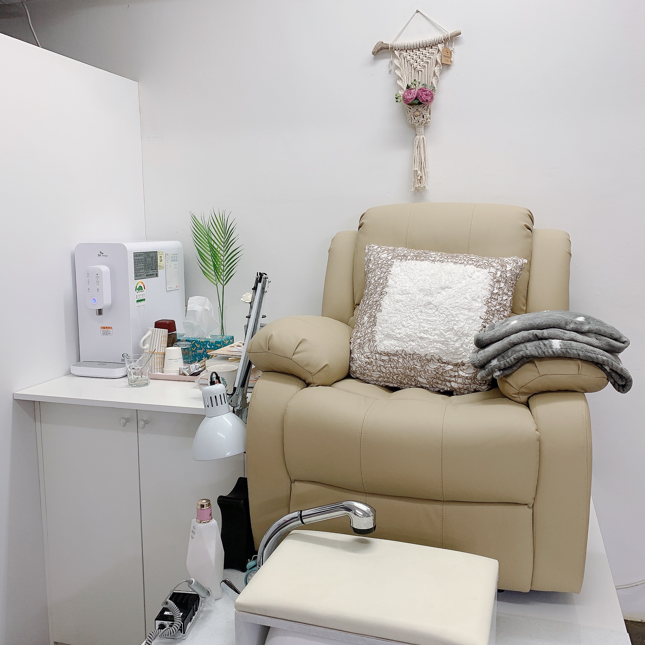 그리고 한쪽에는 페디전용 자리가 있었어요. 저 의자에 앉아있으면 세상 졸리답니다. 아, 그리고 너무 좋은 점은 화장실이 매장 내에 있다는 점! 너무 깔끔한 화장실이 매장 내부에 있어서 엄청 편해요.