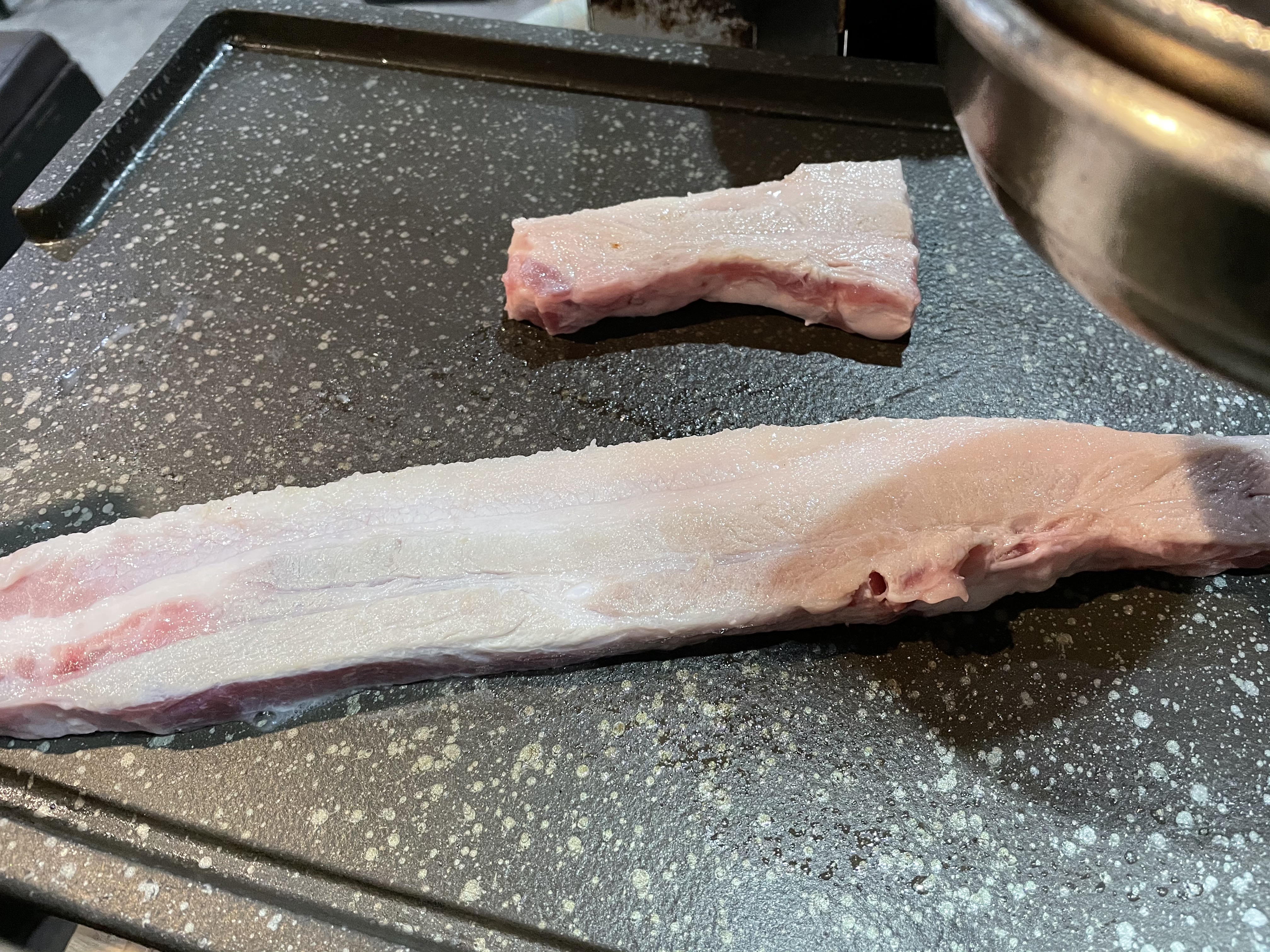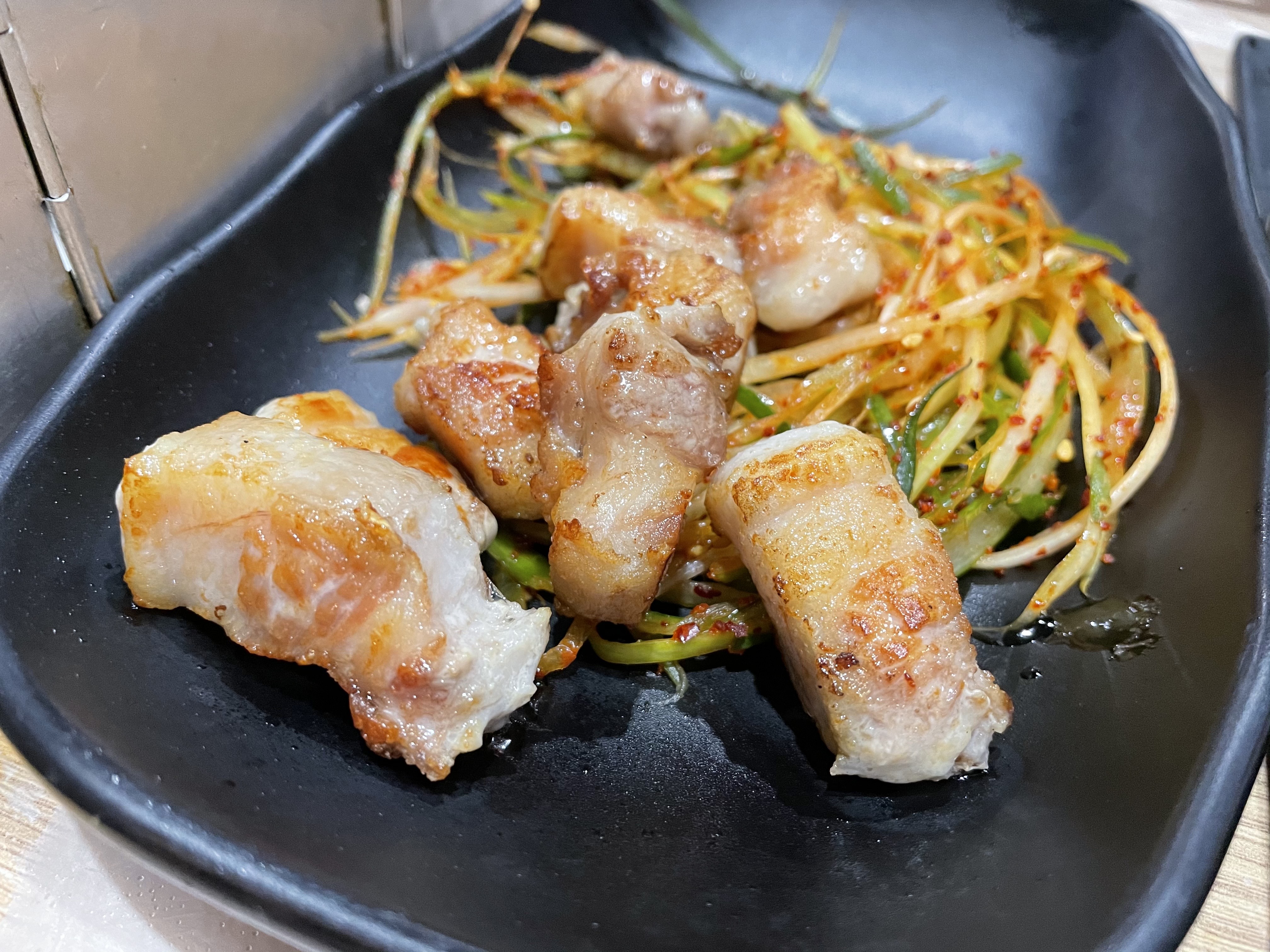 가브리살의 맛이 어땠는지 가물가물하면서 시켰어요. 목살은 퍽퍽해서 먹고 싶지 않고, 삼겹살은 기름져서 느끼할 것 같았기에. 그런데 이 가브리살은 딱 그 중간 정도의 맛이네요. 하지만 전 삼겹살이 더 맛있었던 것 같아요.