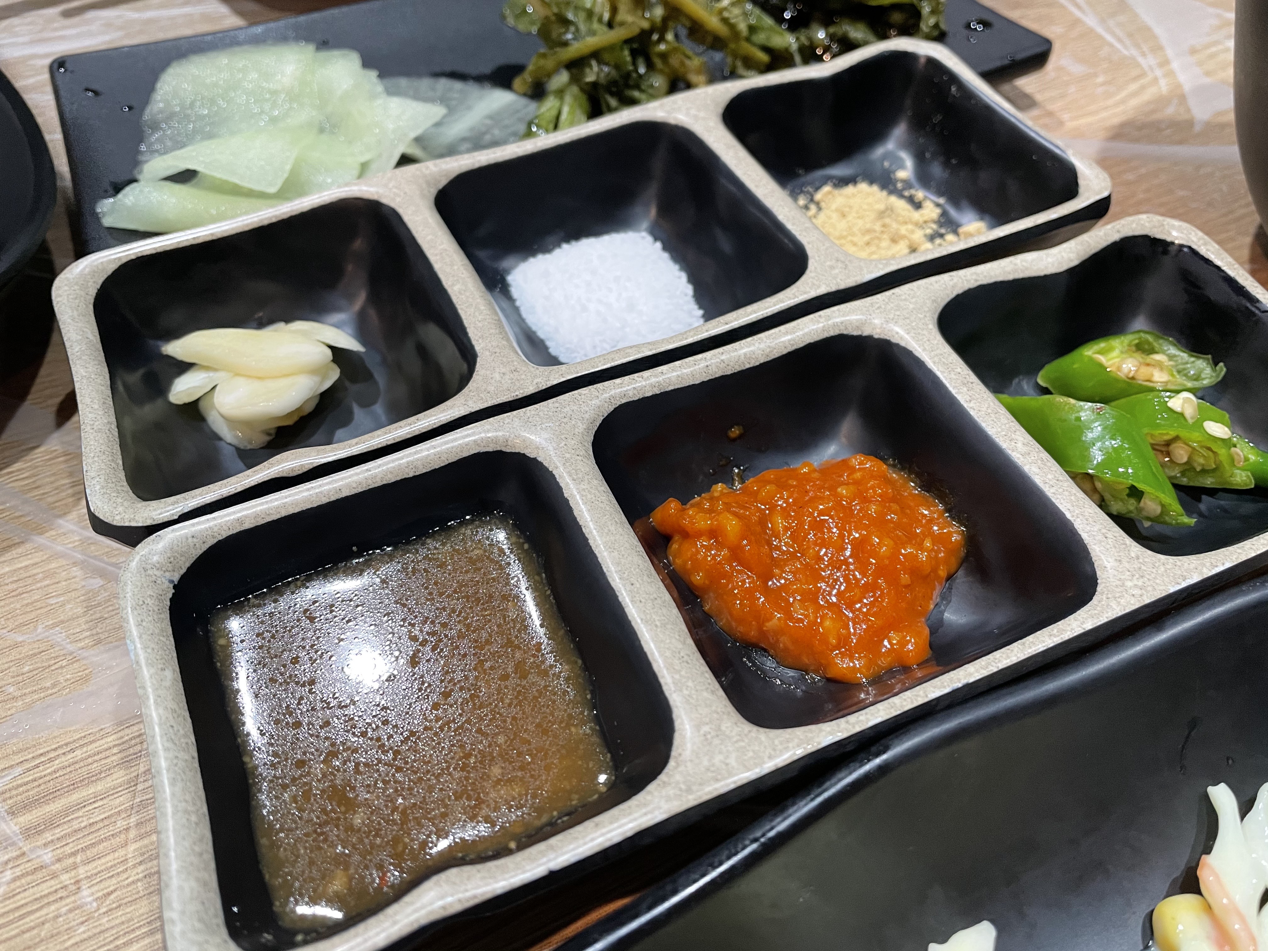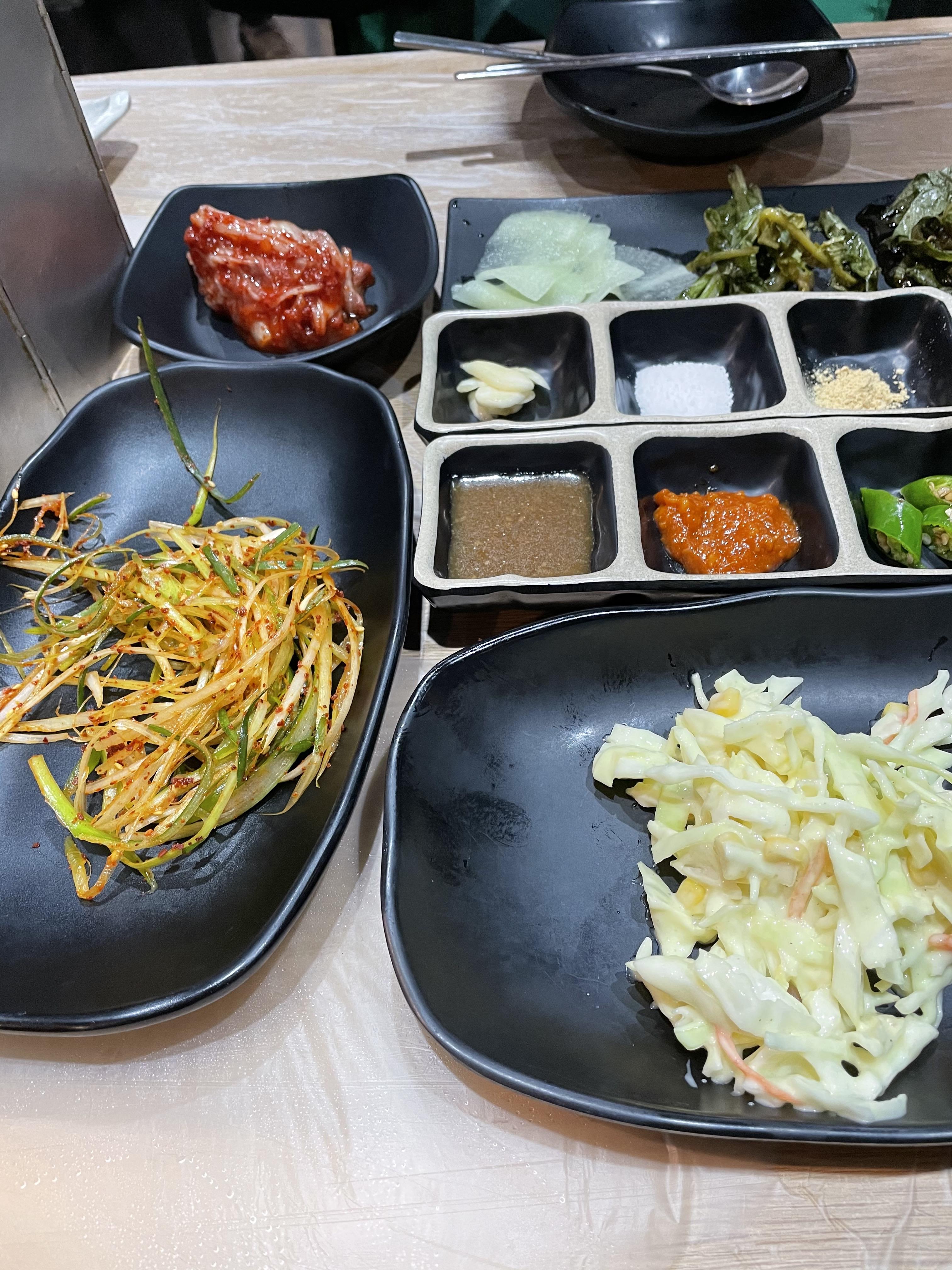 상차림이에요. 셀프바가 있어 부족한 것은 더 가져다 드시면 됩니다. 저는 저.. 열무인지 깻잎인지 하는 절임이랑 고기랑 먹으니깐 맛있더라고요.