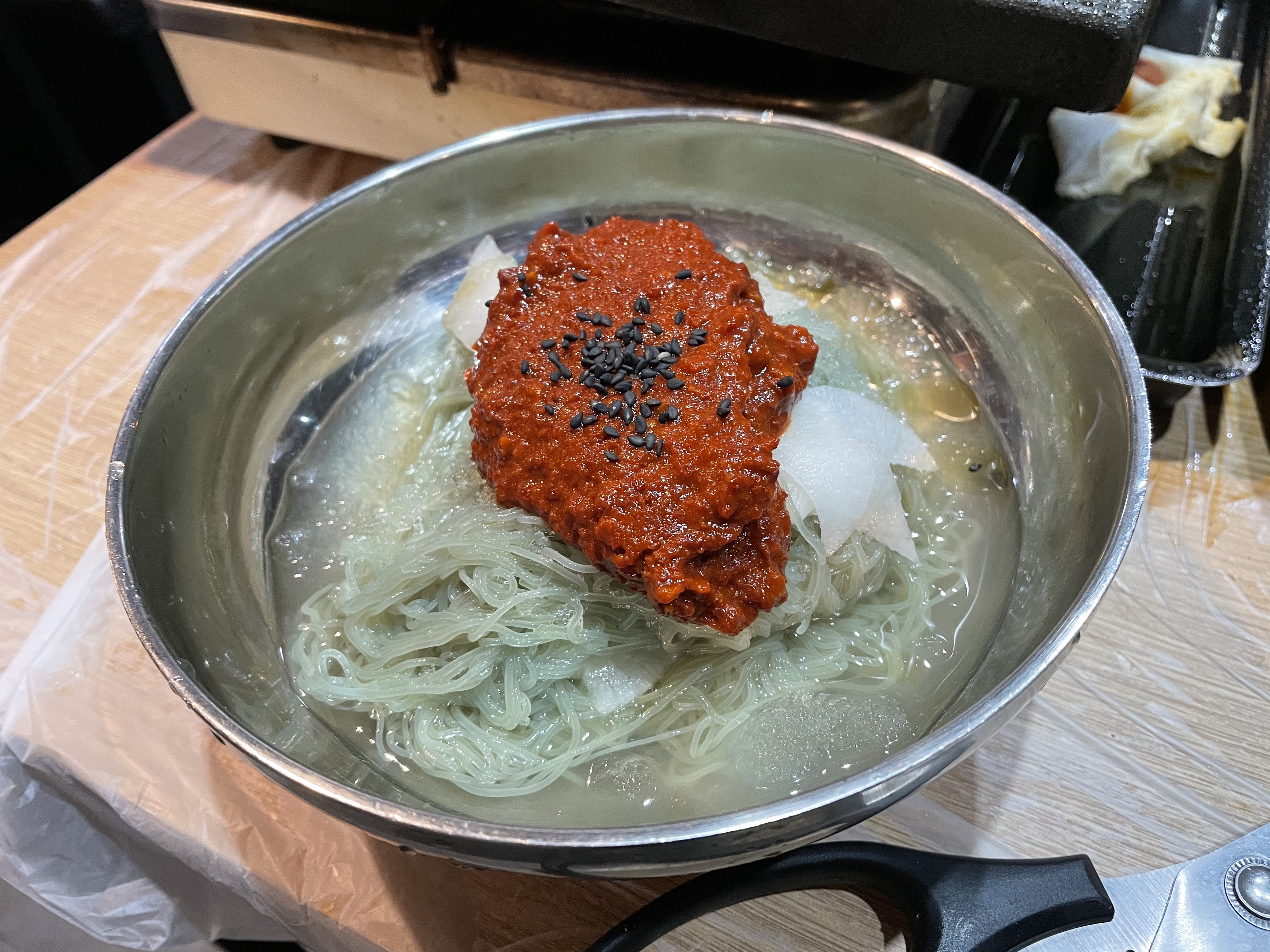 고기를 먹는데 사이드로 시킨 옛날도시락과 비빔냉면이 나왔어요. 저는 도시락 맛있었어요. 비빔냉면은 평범한 맛?