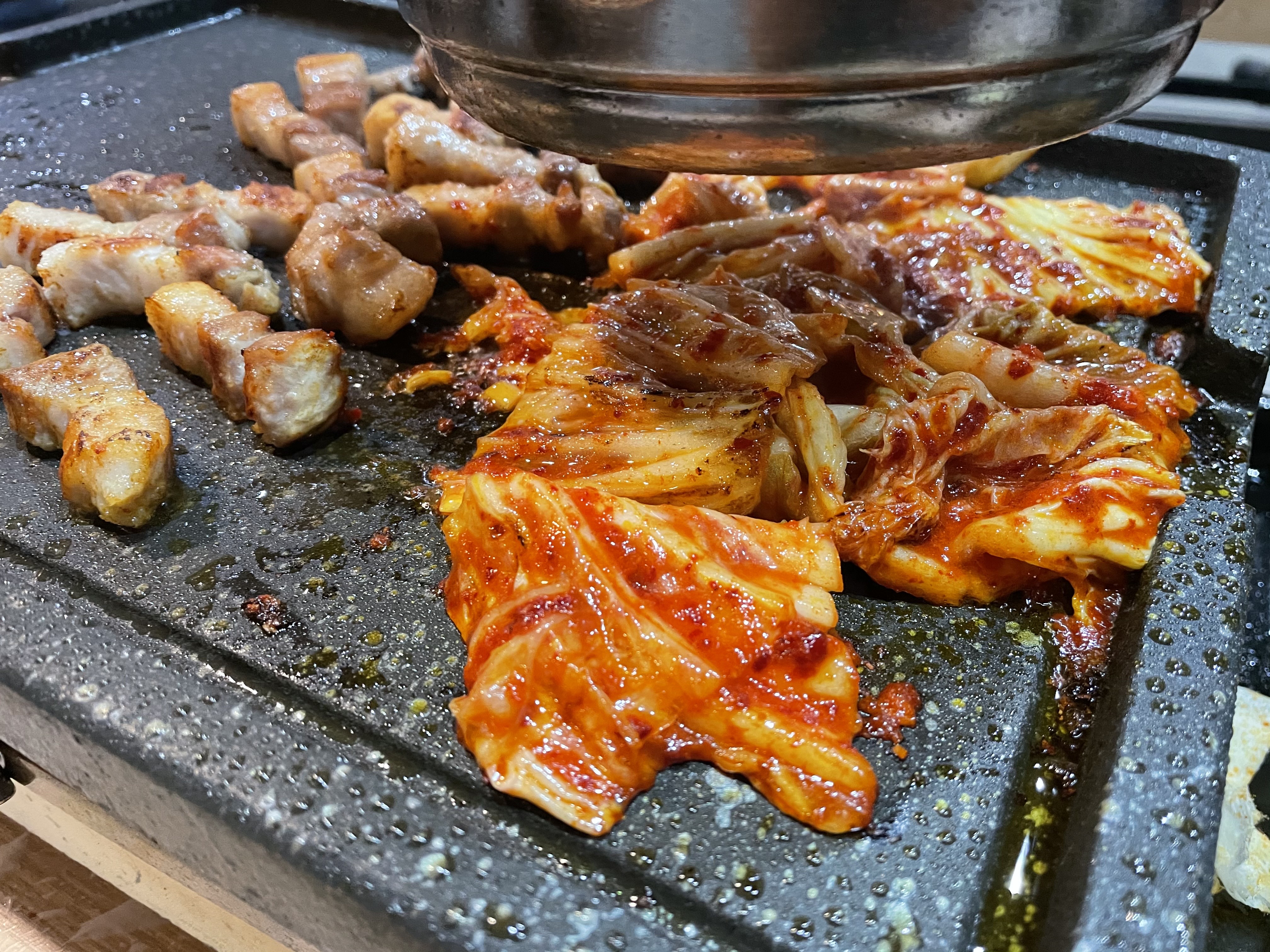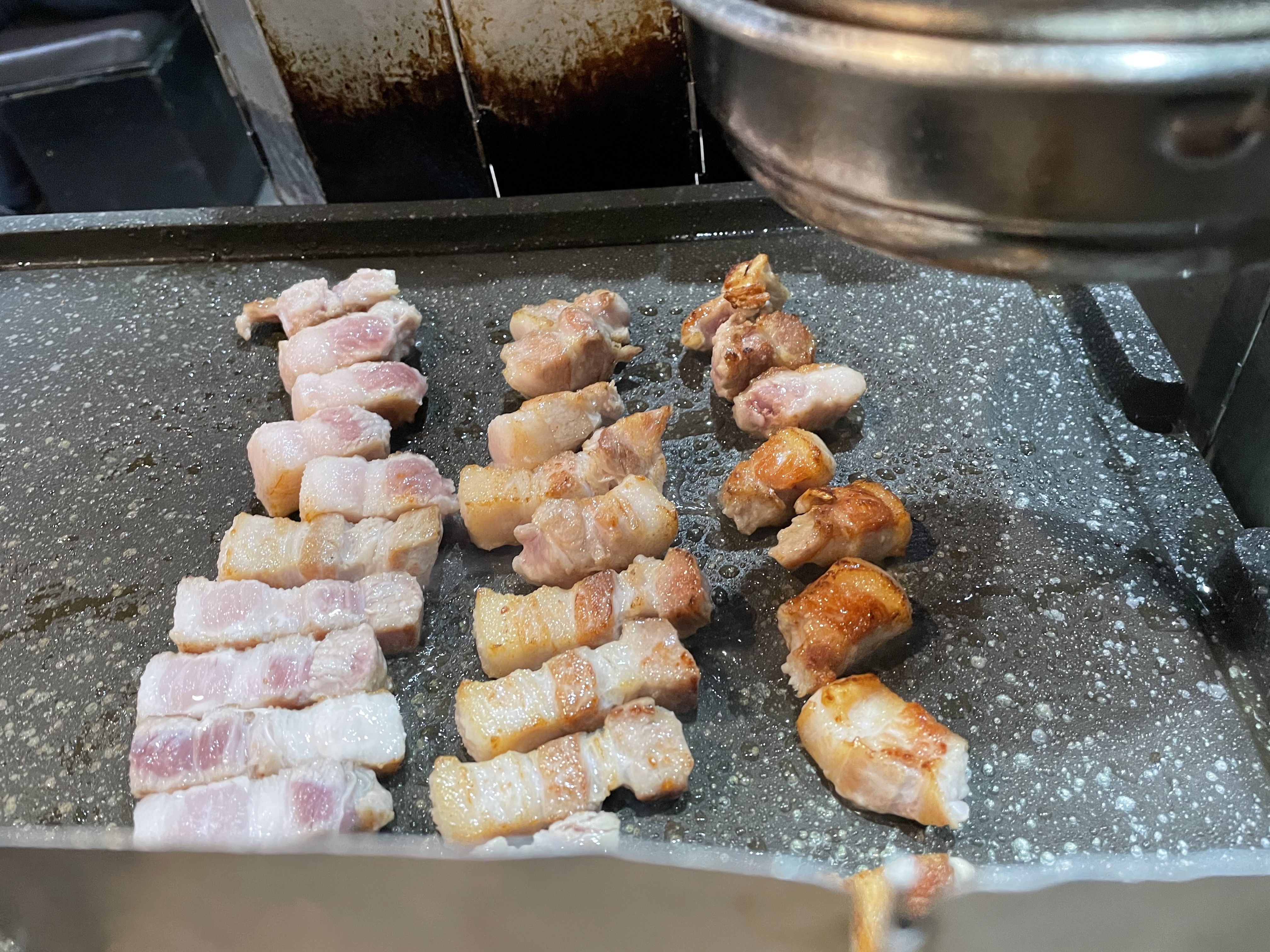 삼겹살이 나란히 누워 익어가고 있네요.