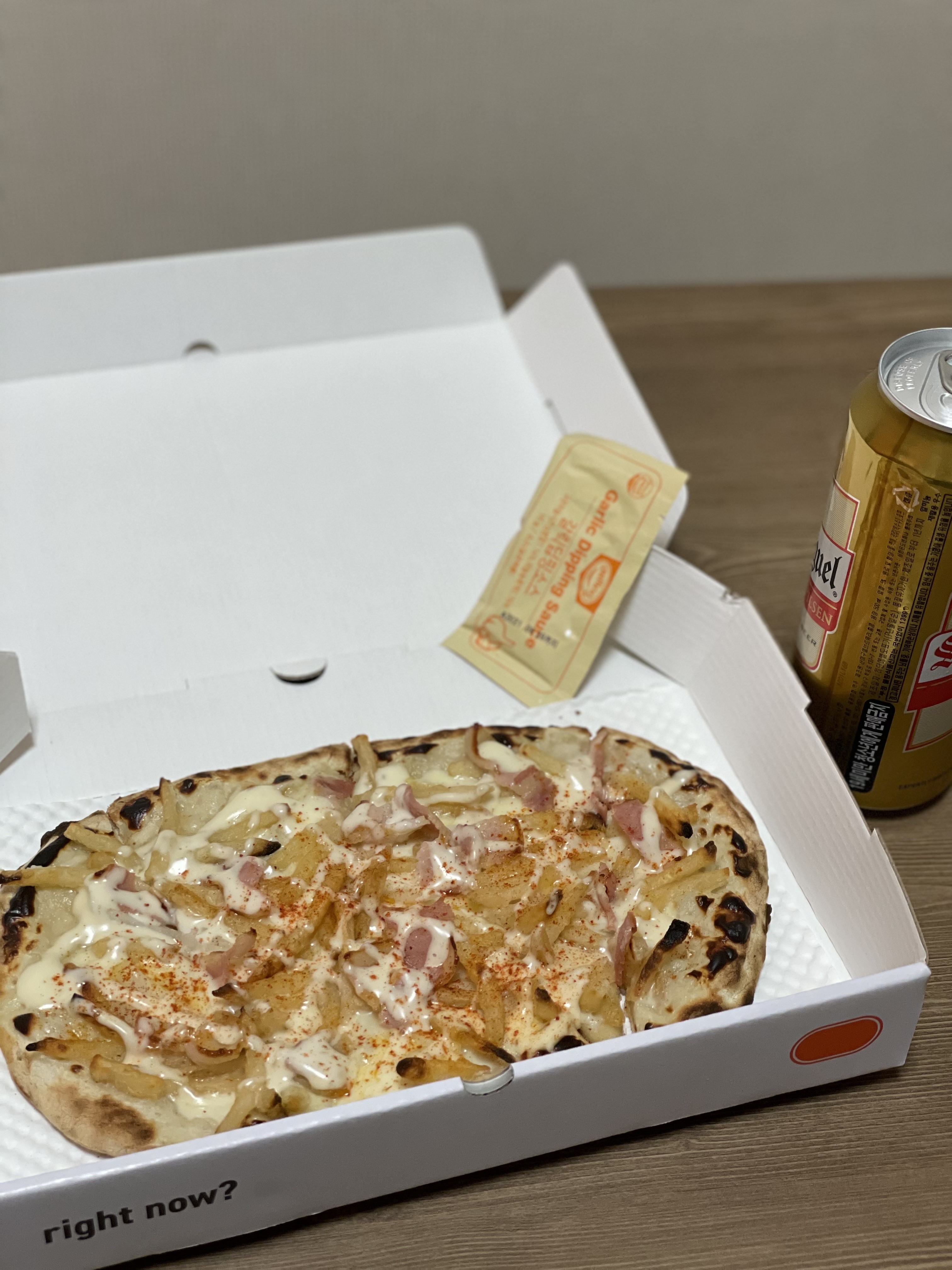 크런치 포테이토 피자에 갈릭디핑소스를 추가해서 주문했어요.