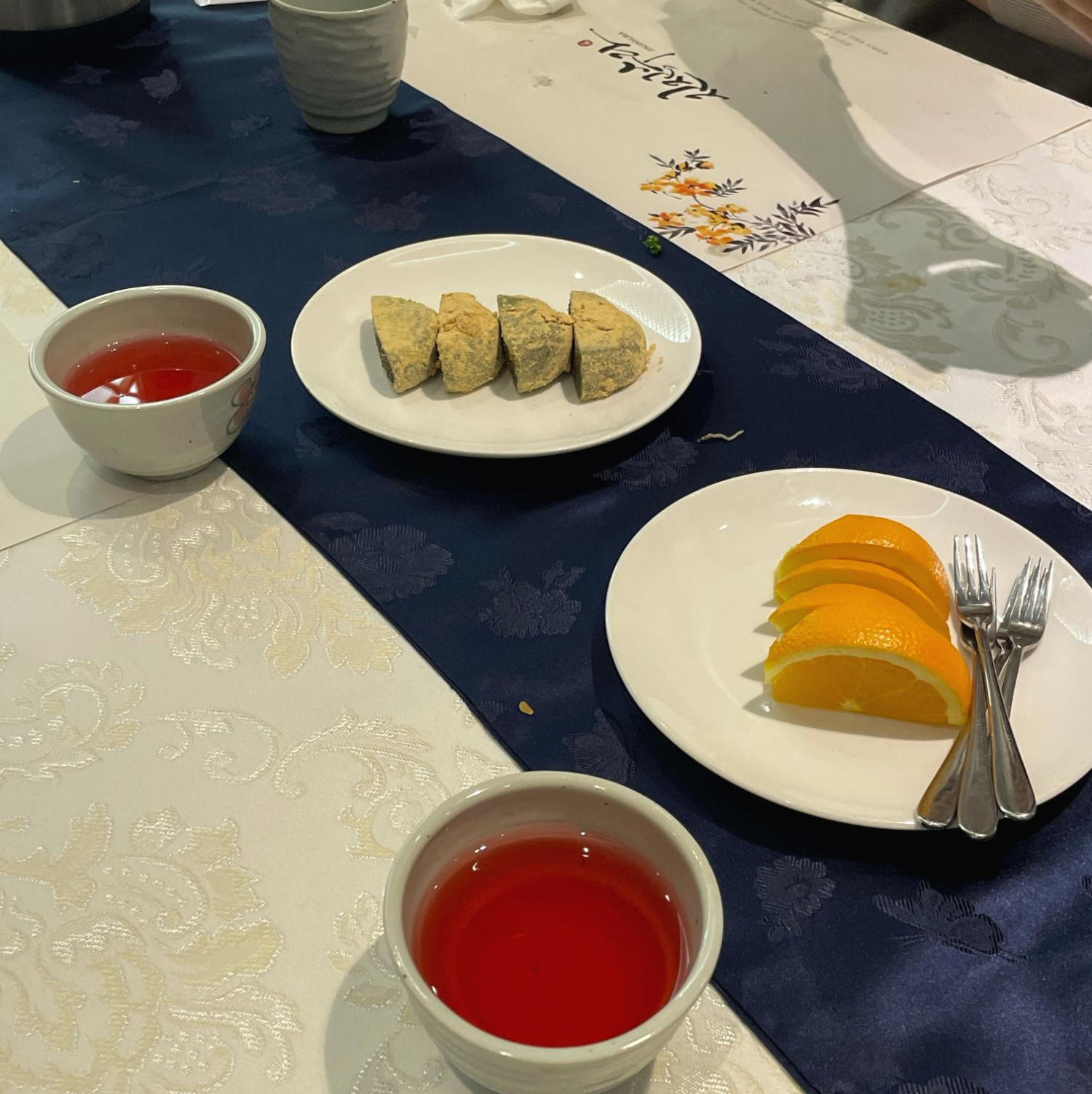 마지막으로 디저트로 나온 두텁떡과 과일, 전통음료예요. 과일의 종류가 더 많았으면 좋았겠다... 하는 아쉬움이 있었어요. 떡은 달았어요!