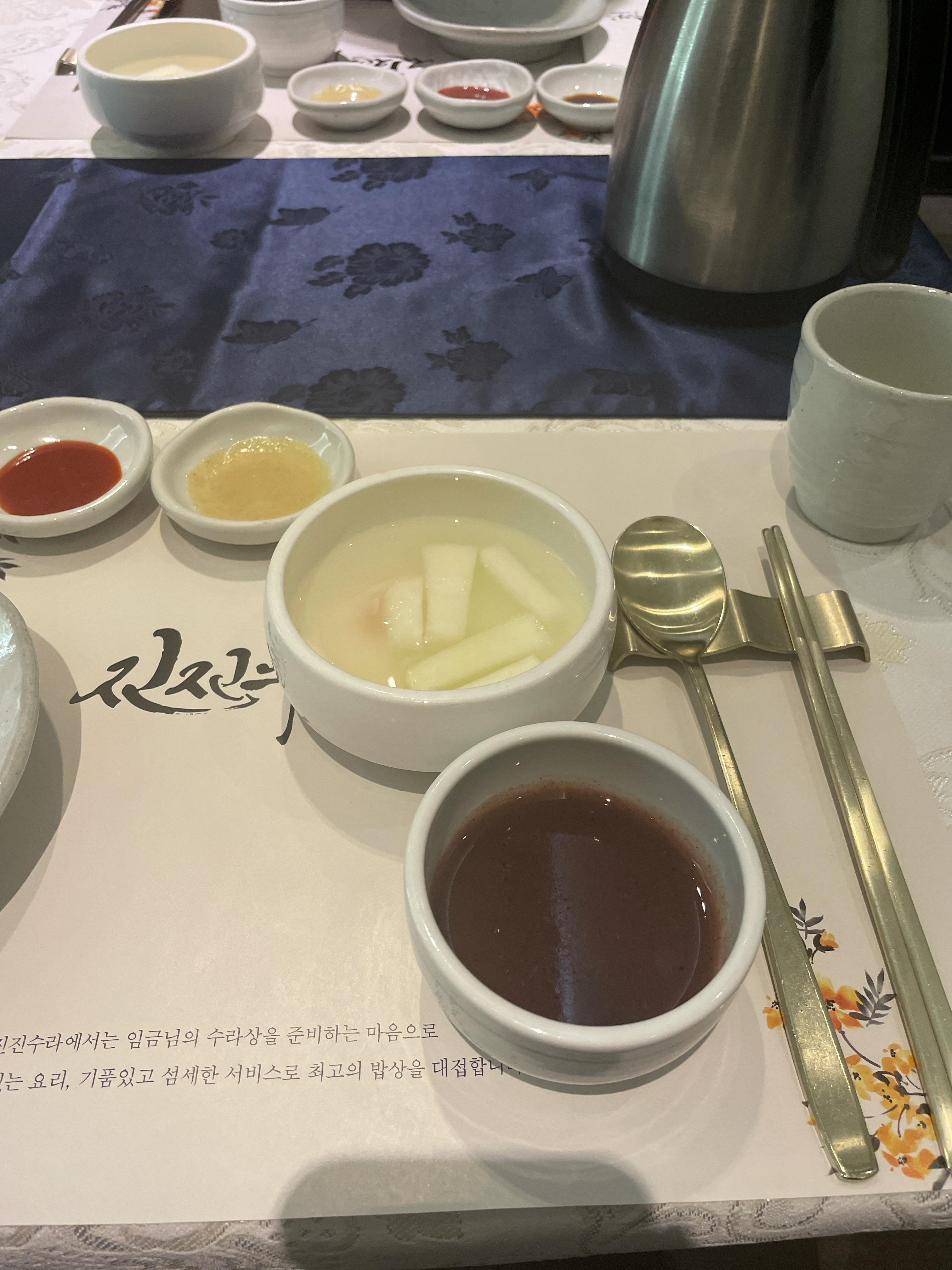 기본 세팅이구요! 처음에 전통차가 나오는데 보리차 같은 맛이었고, 건강 계절죽으로 팥죽이 나왔는데 팥죽은 무척 달았어요! 숙성 동치미는 제가 아는 그 맛이네요!