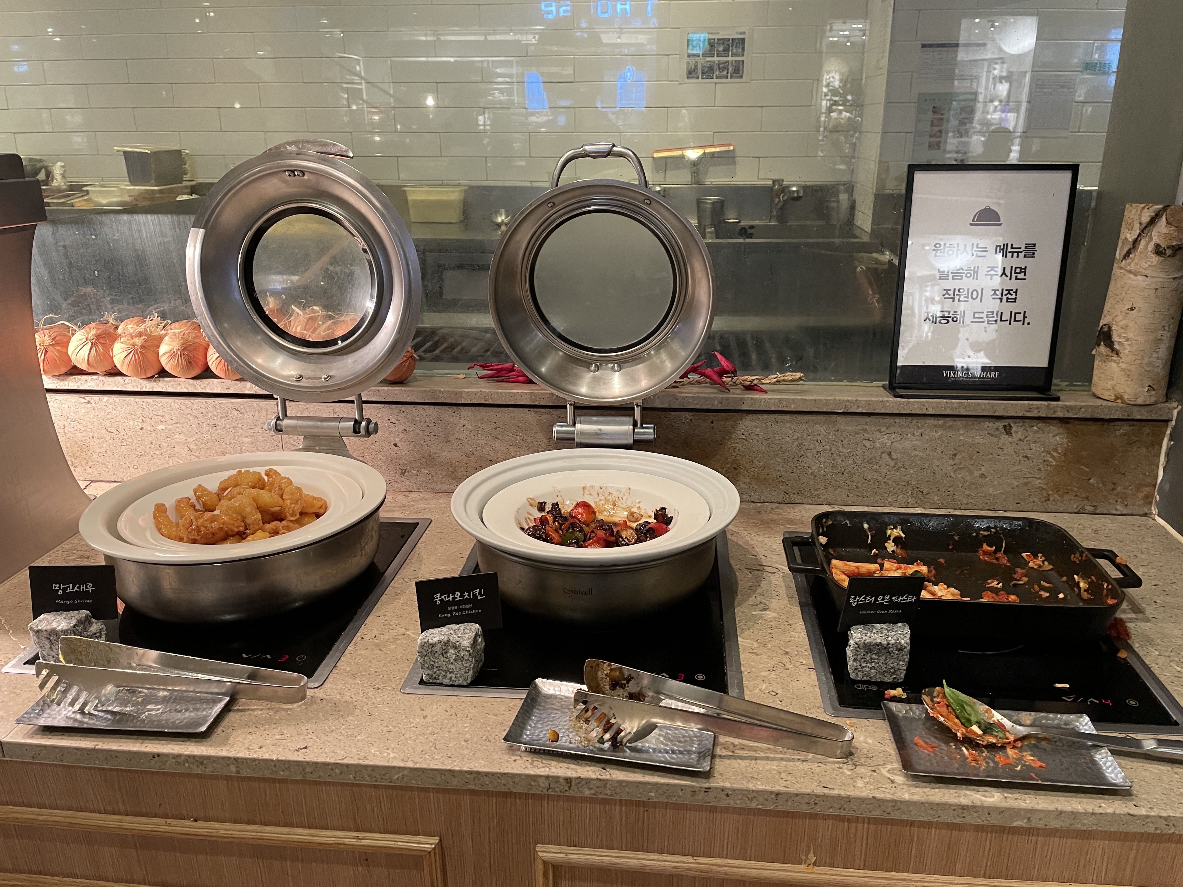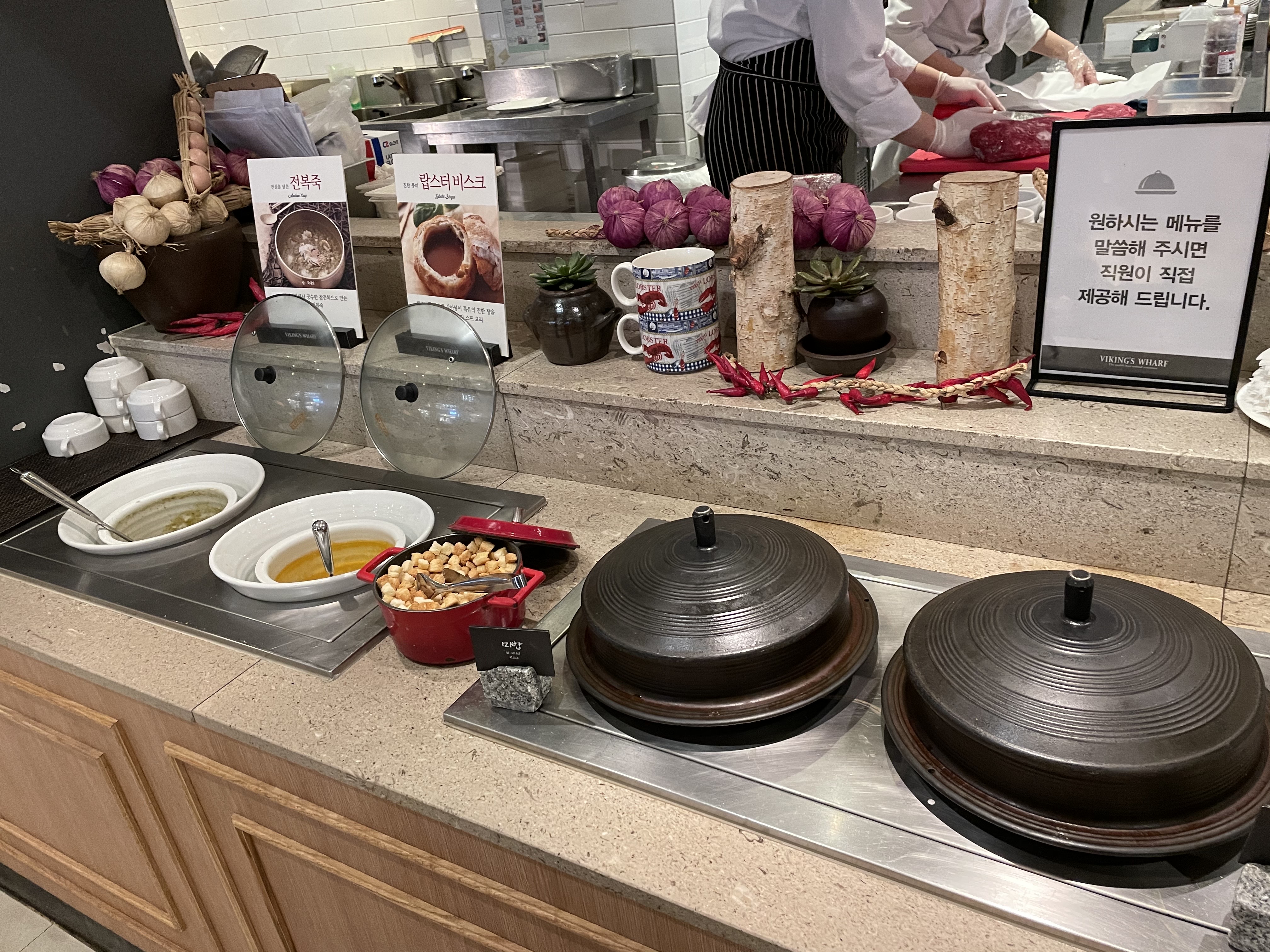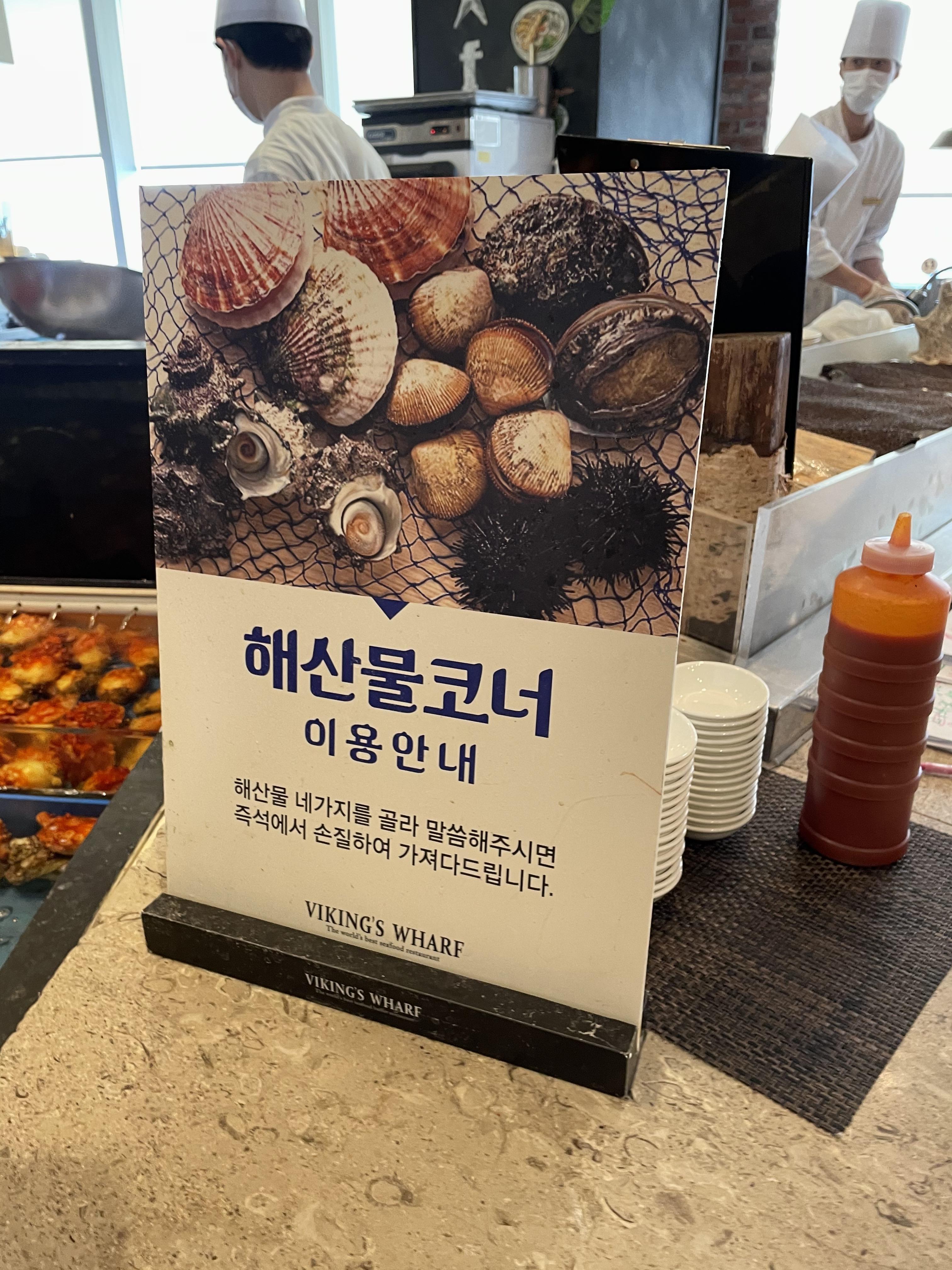 이 곳은 그 외 요리코너예요. 한국음식과 해산물을 이용한 요리들이 주로 있죠. 메뉴들 앞에는 접근을 차단하는 줄이 쳐져 있고 그 통로를 직원분들이 왔다 갔다 하시면서 고객들이 원하는 음식을 접시에 덜어주세요.