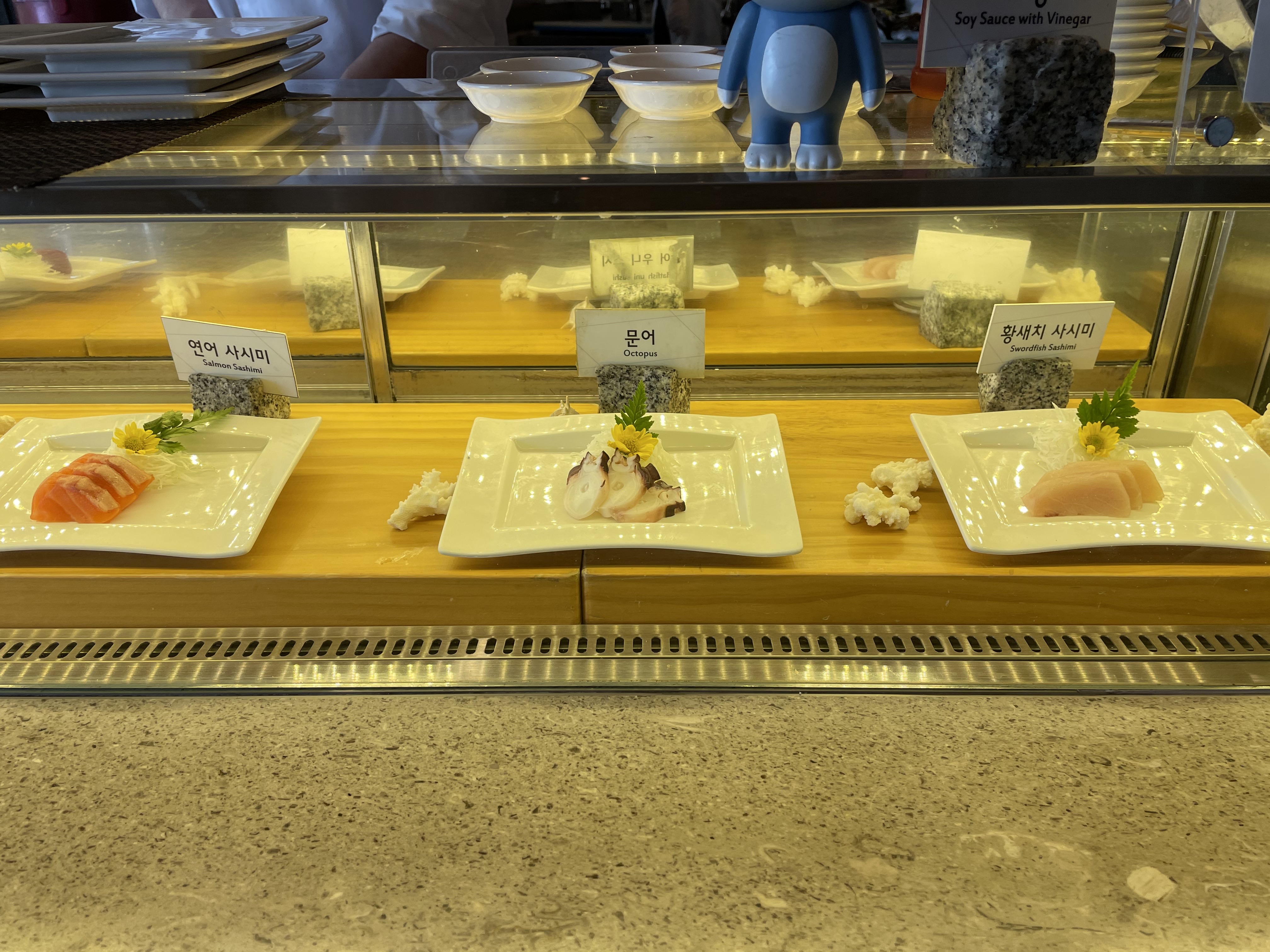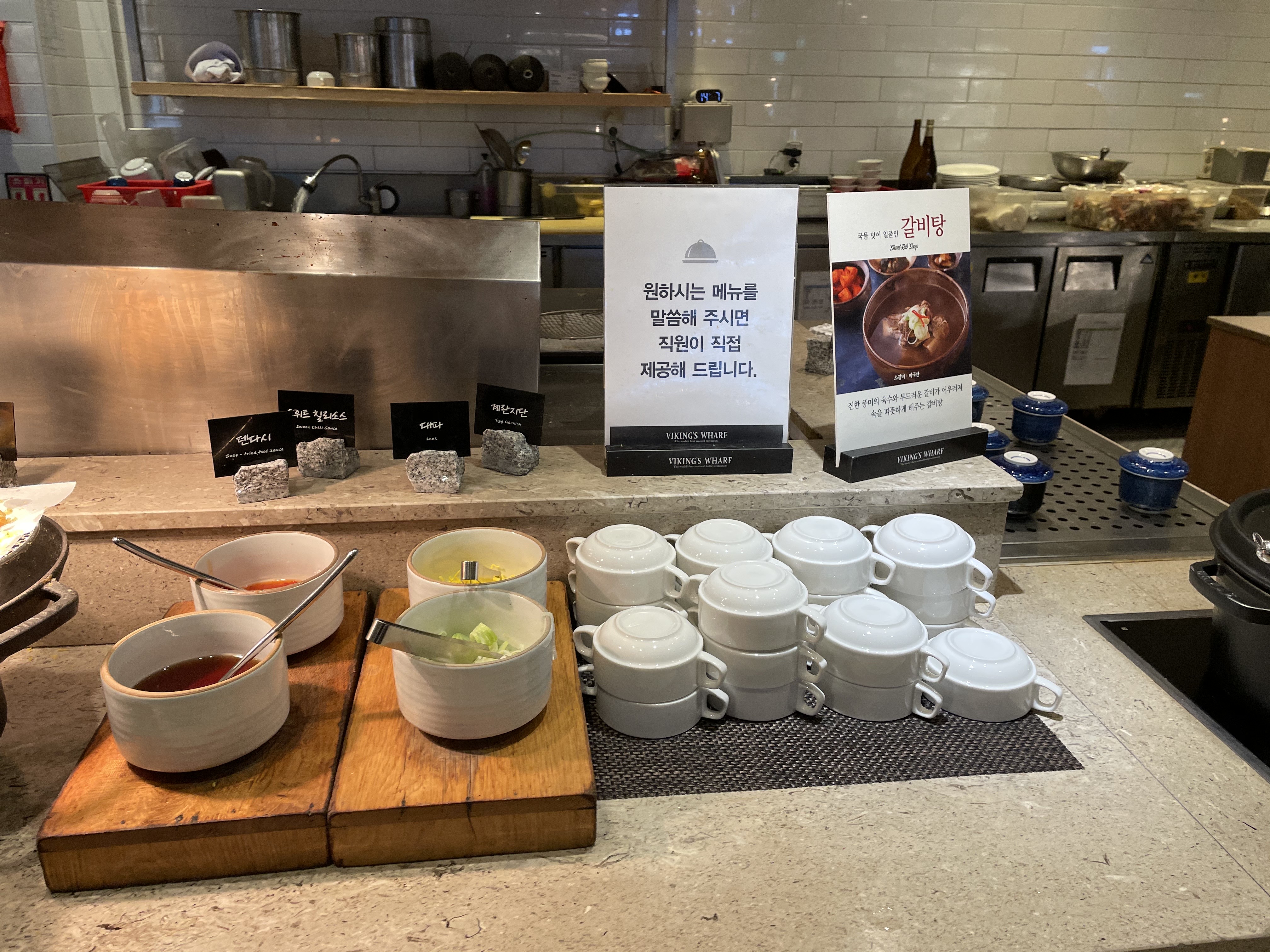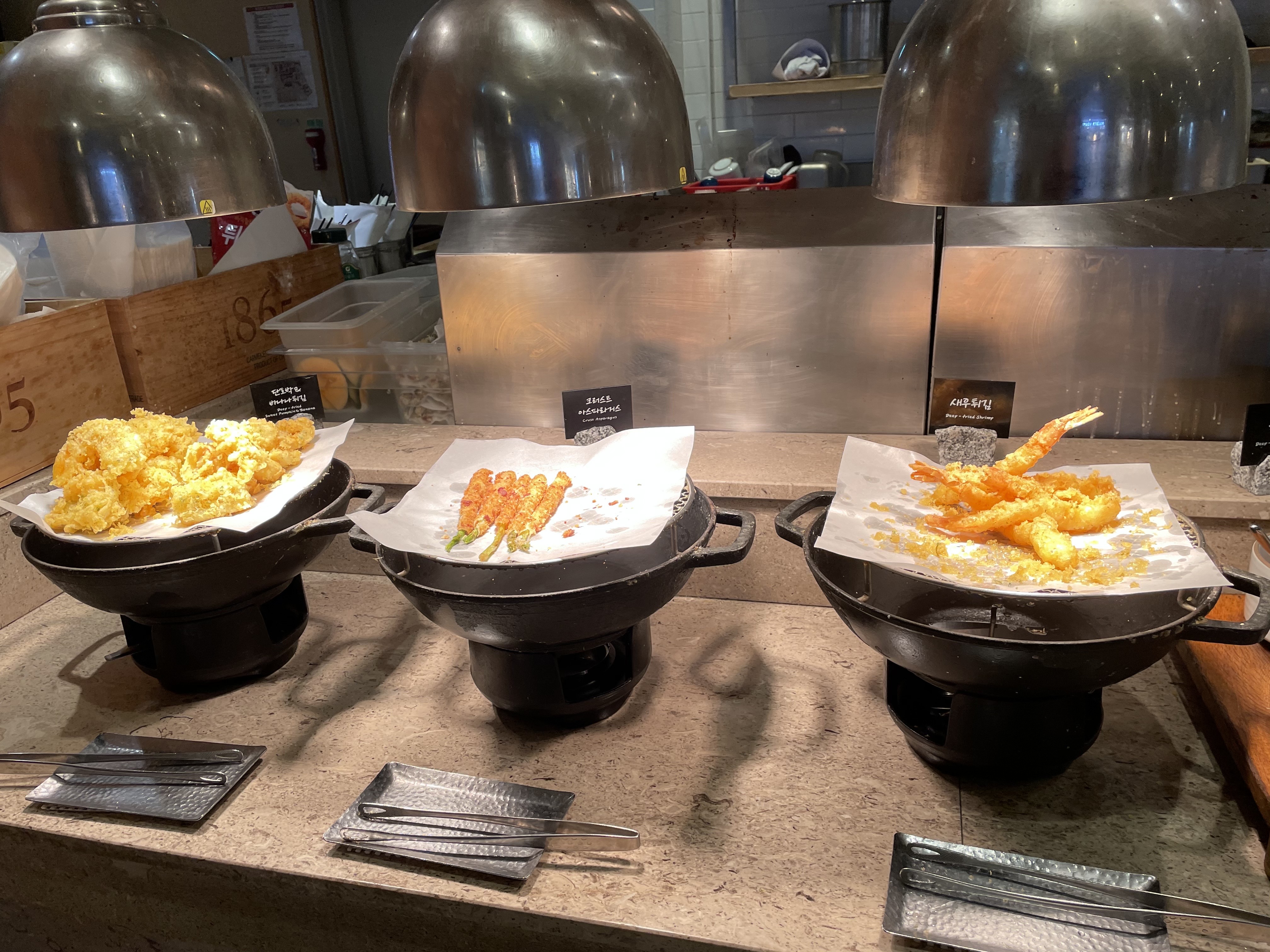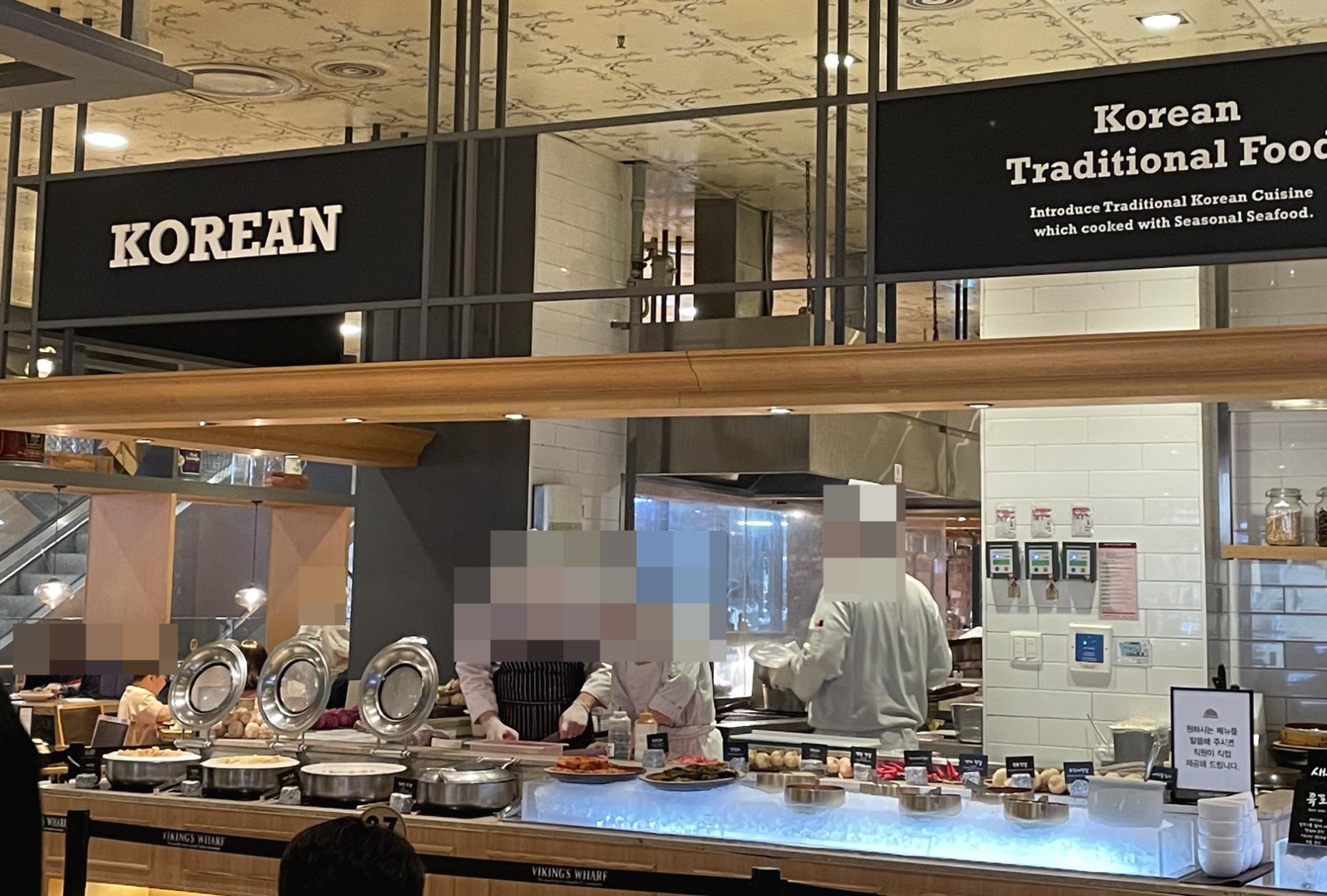 이 곳은 그 외 요리코너예요. 한국음식과 해산물을 이용한 요리들이 주로 있죠. 메뉴들 앞에는 접근을 차단하는 줄이 쳐져 있고 그 통로를 직원분들이 왔다 갔다 하시면서 고객들이 원하는 음식을 접시에 덜어주세요.