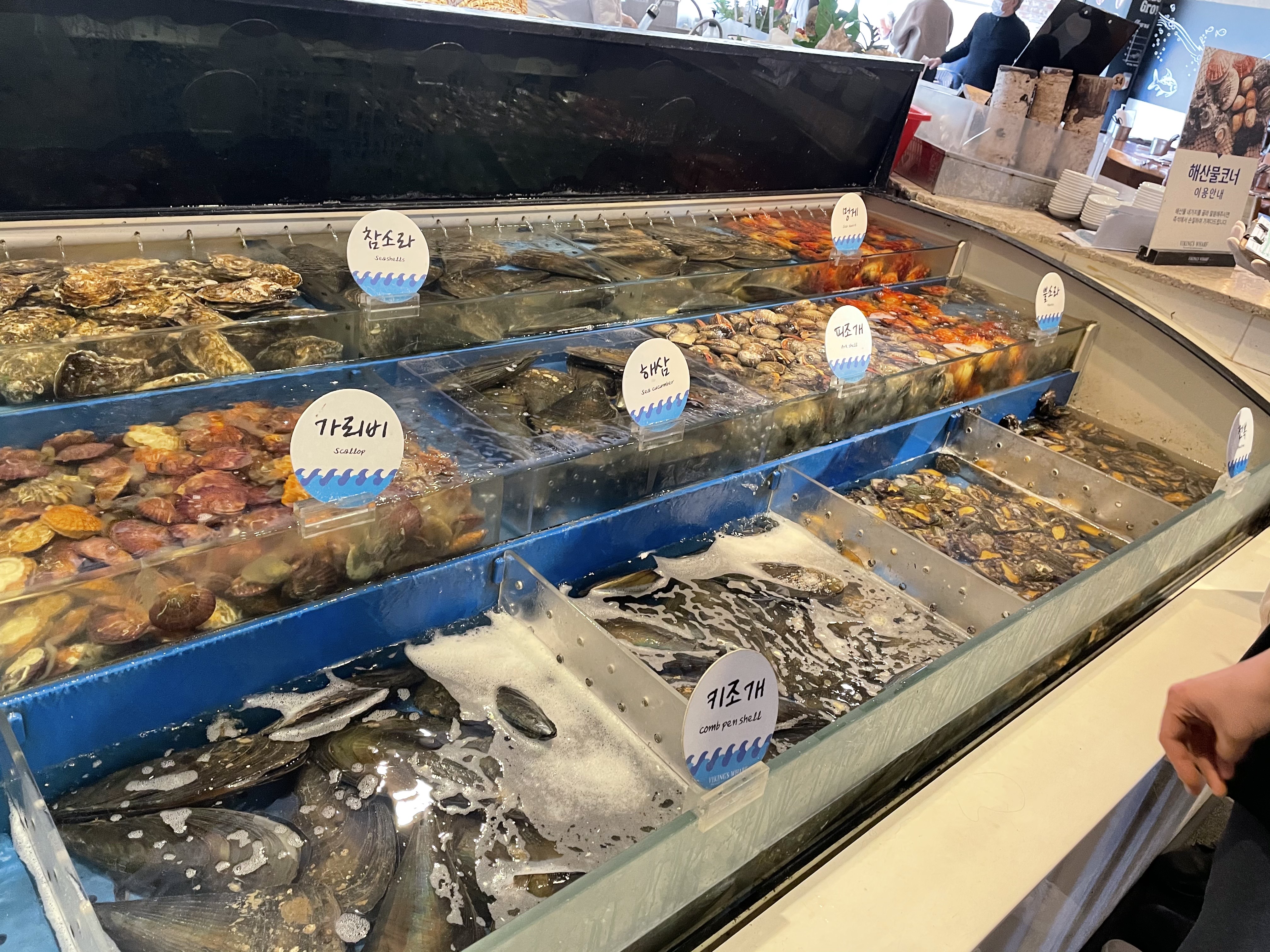 이 곳은 해산물 코너예요. 참소라, 멍게, 가리비, 해삼, 피조개, 뿔소라, 키조개, 전복 등의 해산물이 수조에 있어요. 이 곳 또한 옆에 서계신 직원분께 원하는 해산물 종류를 말씀하시고 (한 번에 최대 4가지) 테이블 넘버 말씀하시면 가져다주십니다.
