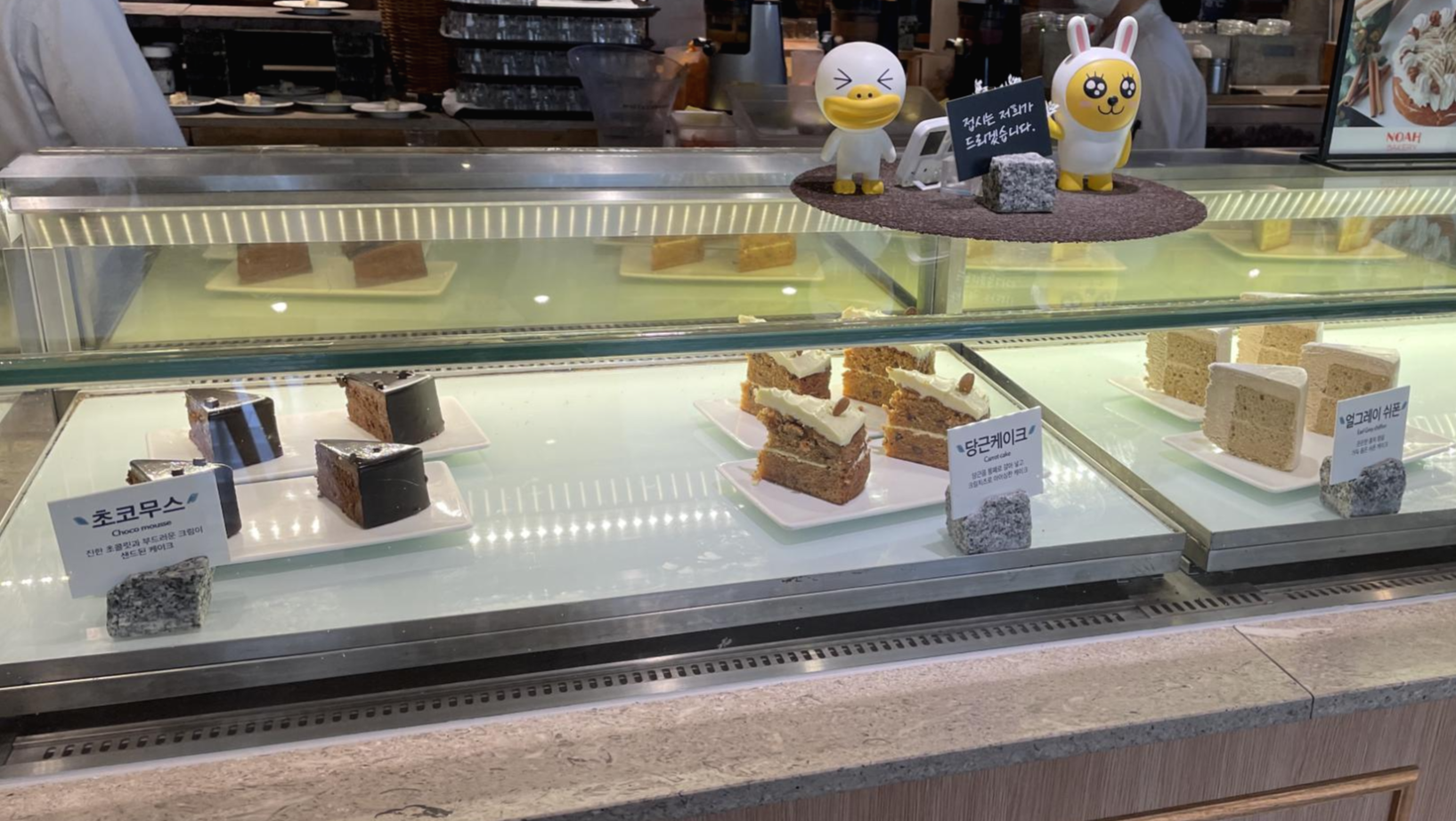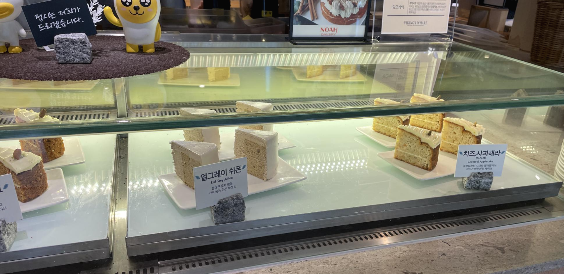 제가 좋아하는 달콤한 조각 케이크이에요. 노아베이커리라고 하네요. 초코무스, 당근케이크, 얼그레이 쉬폰, 치즈,사과해라 로 총 4가지 종류예요.