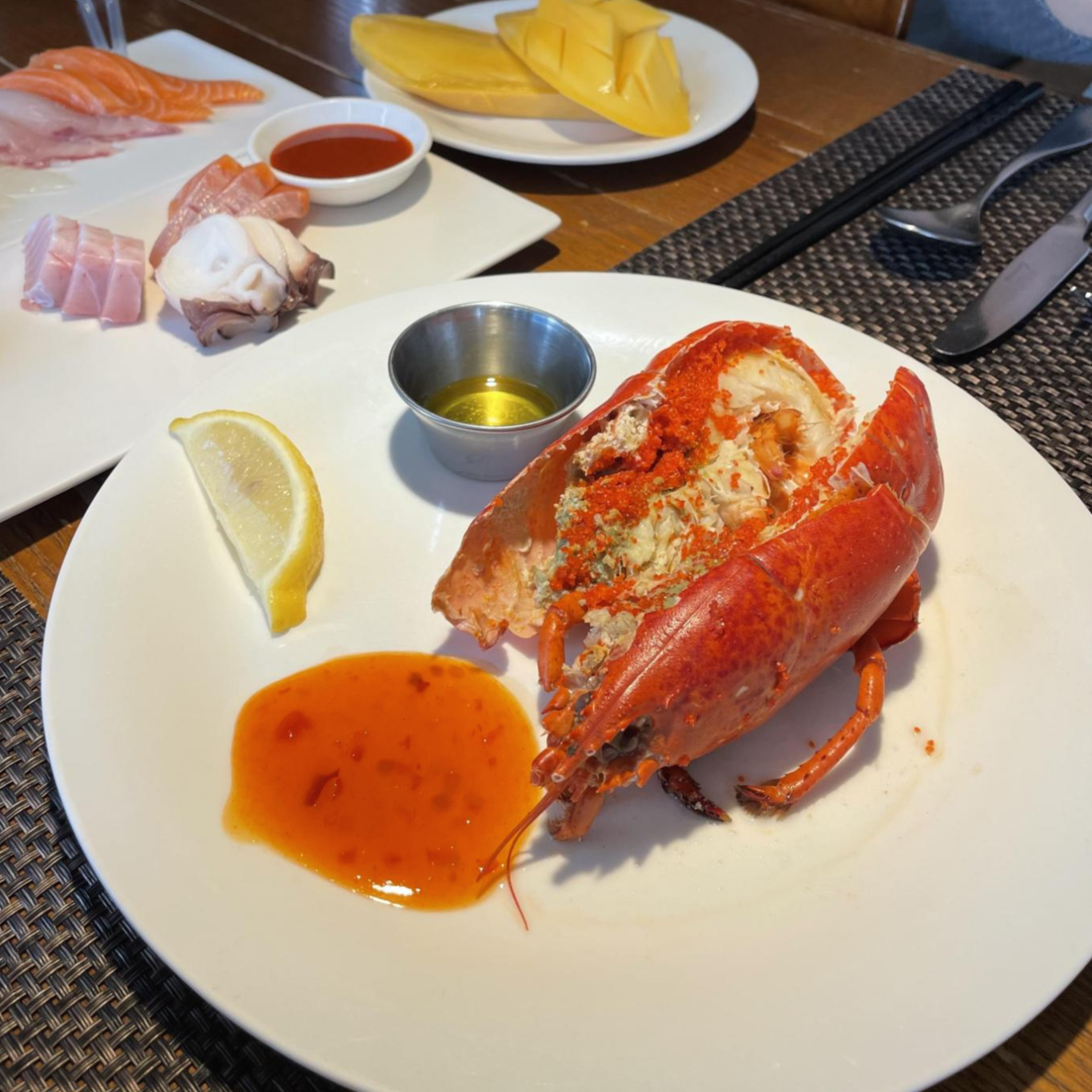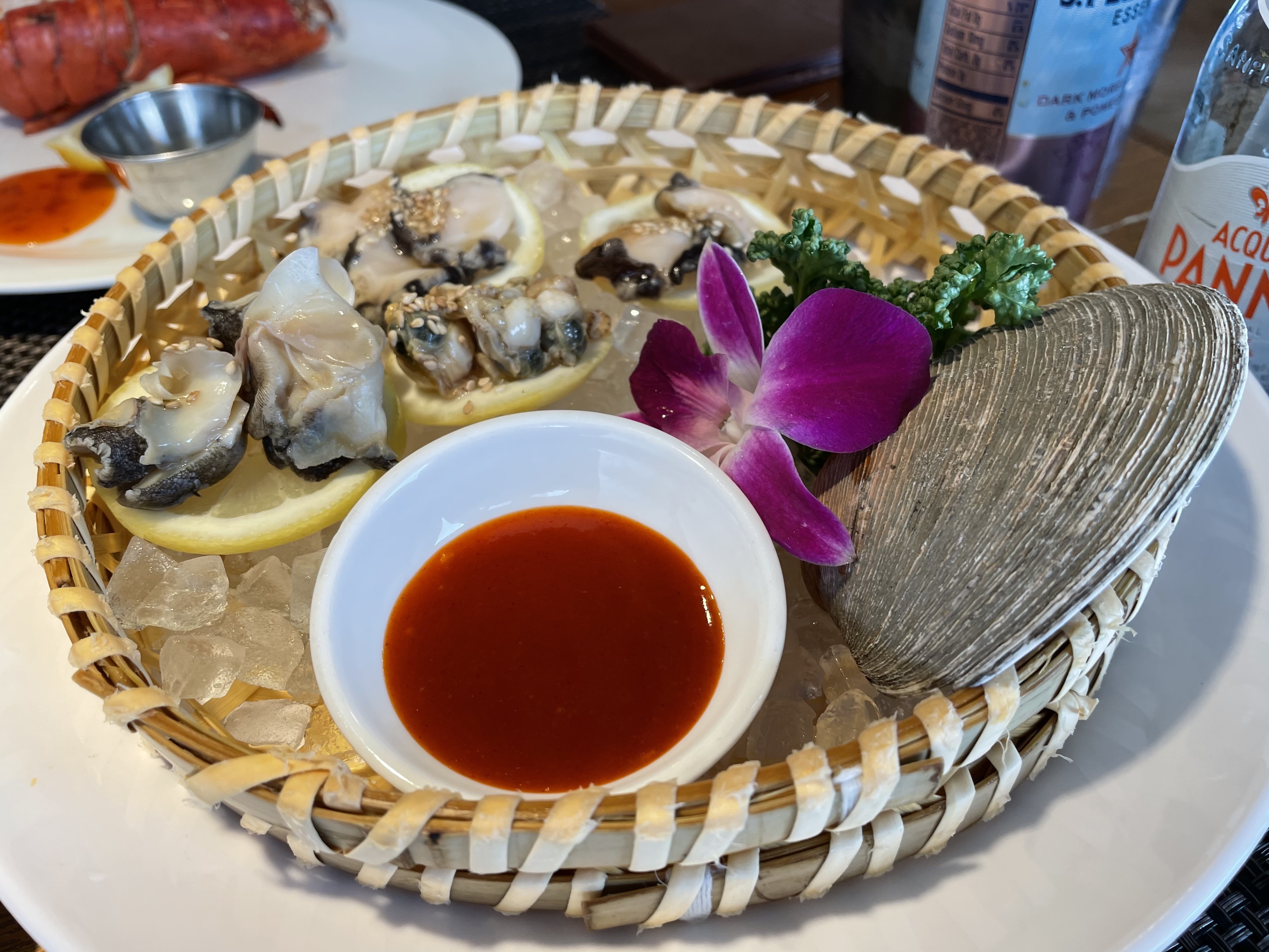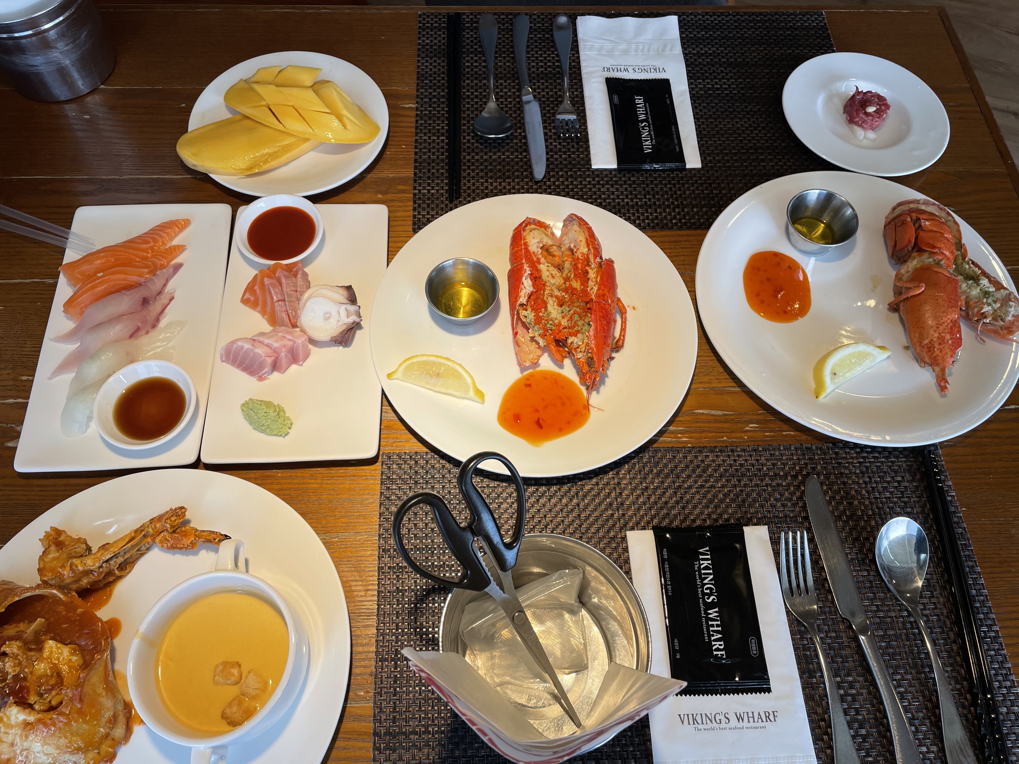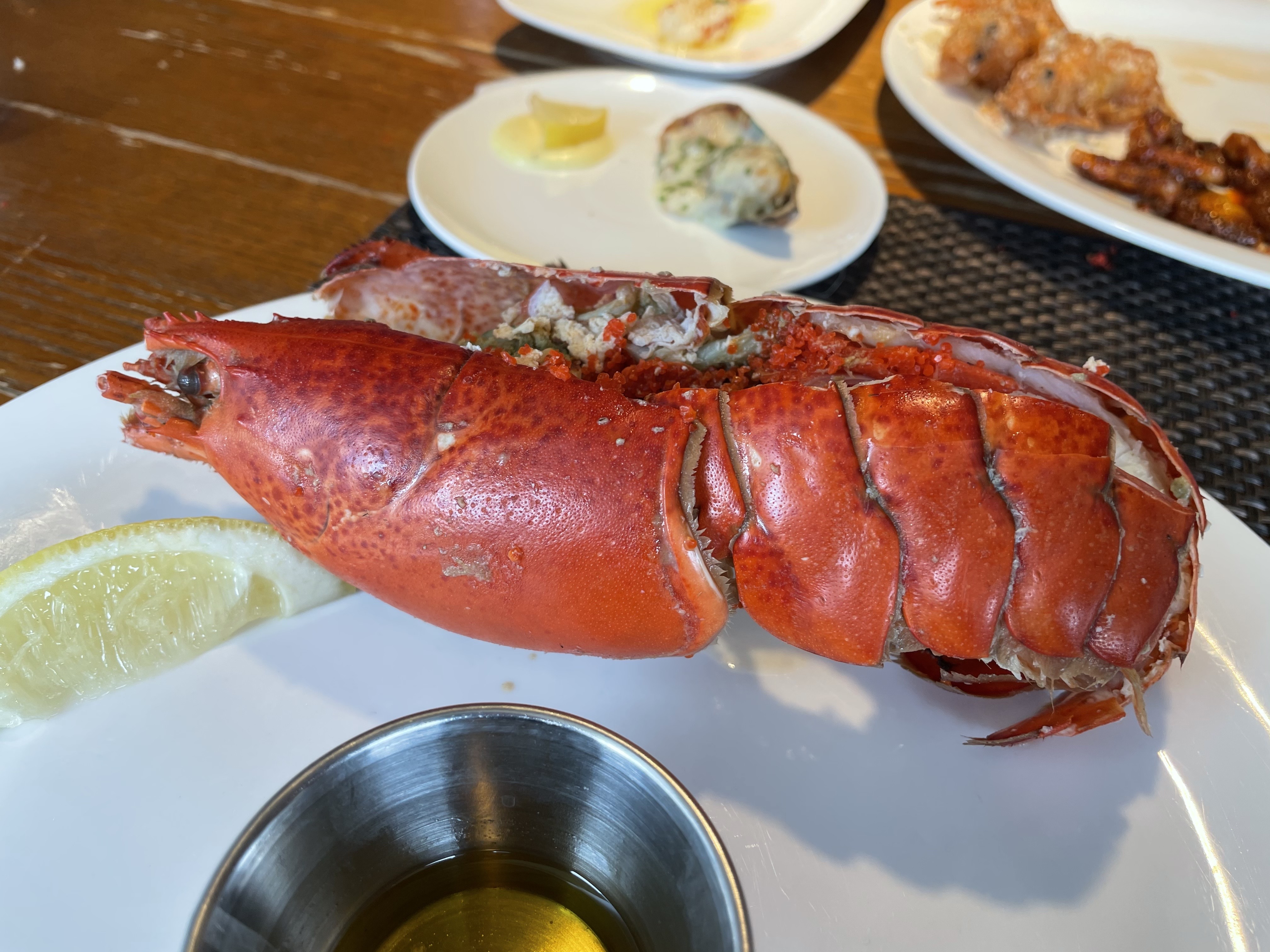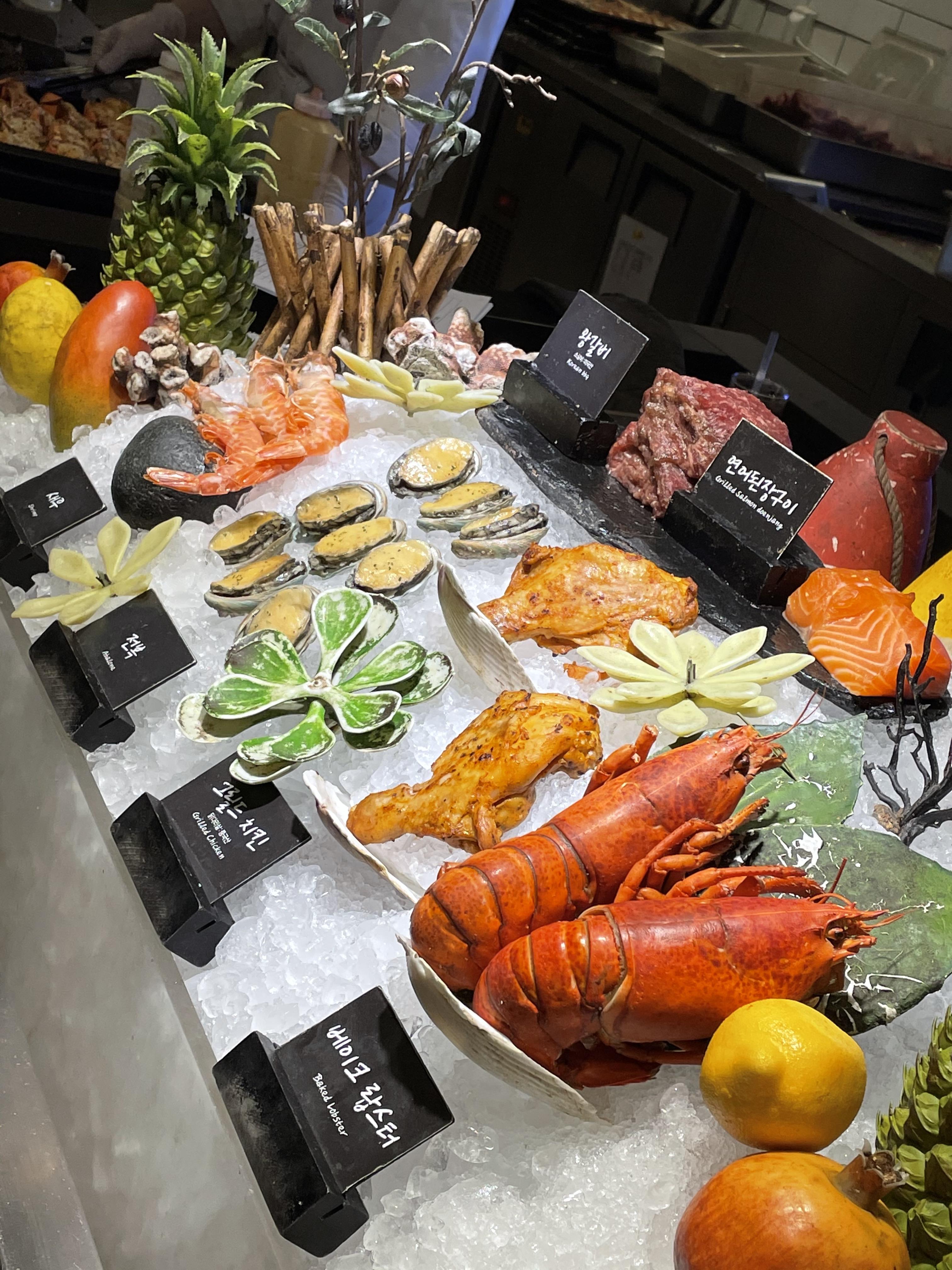1. 랍스터찜 : 캐나다와 미국으로부터 직접 공수한 랍스터라고 하구요. 전 한 세 마리쯤 먹은 것 같아요. 더 많이 먹었어야 했나 약간 후회 중이지만. 맛은 꽤 좋았어요. 랍스터를 본격적으로 먹어본건 처음인데, 쫄깃하고 살도 많았답니다. 랍스터 중에는 저렇게 빨간 알이 있는 친구가 있고 없는 친구가 있는데, 결과적으로는 맛은 큰 차이 없는 것 같아요. 알이 있으면 약간 고소한 맛이 있는 것 같기도 하지만..?