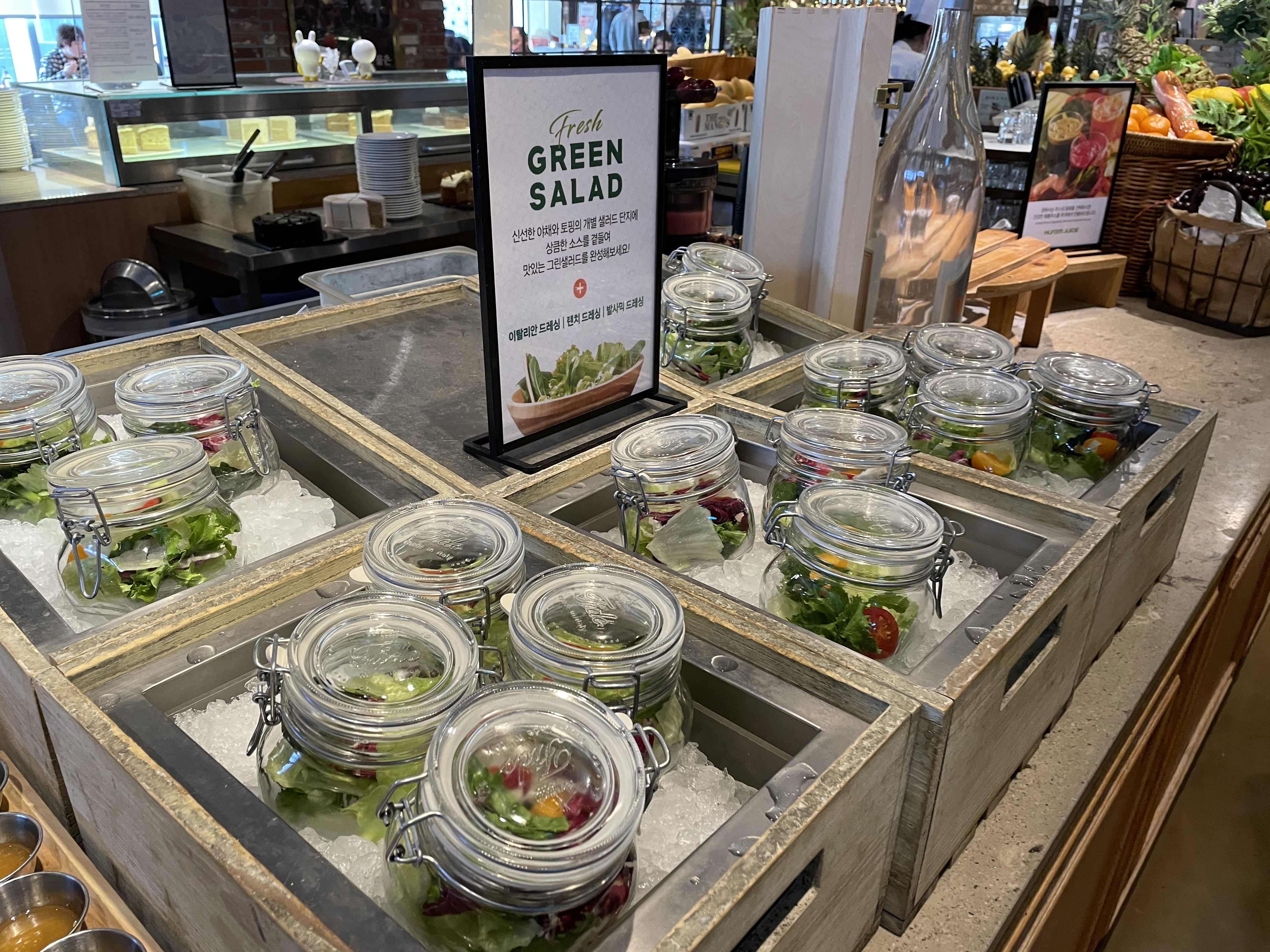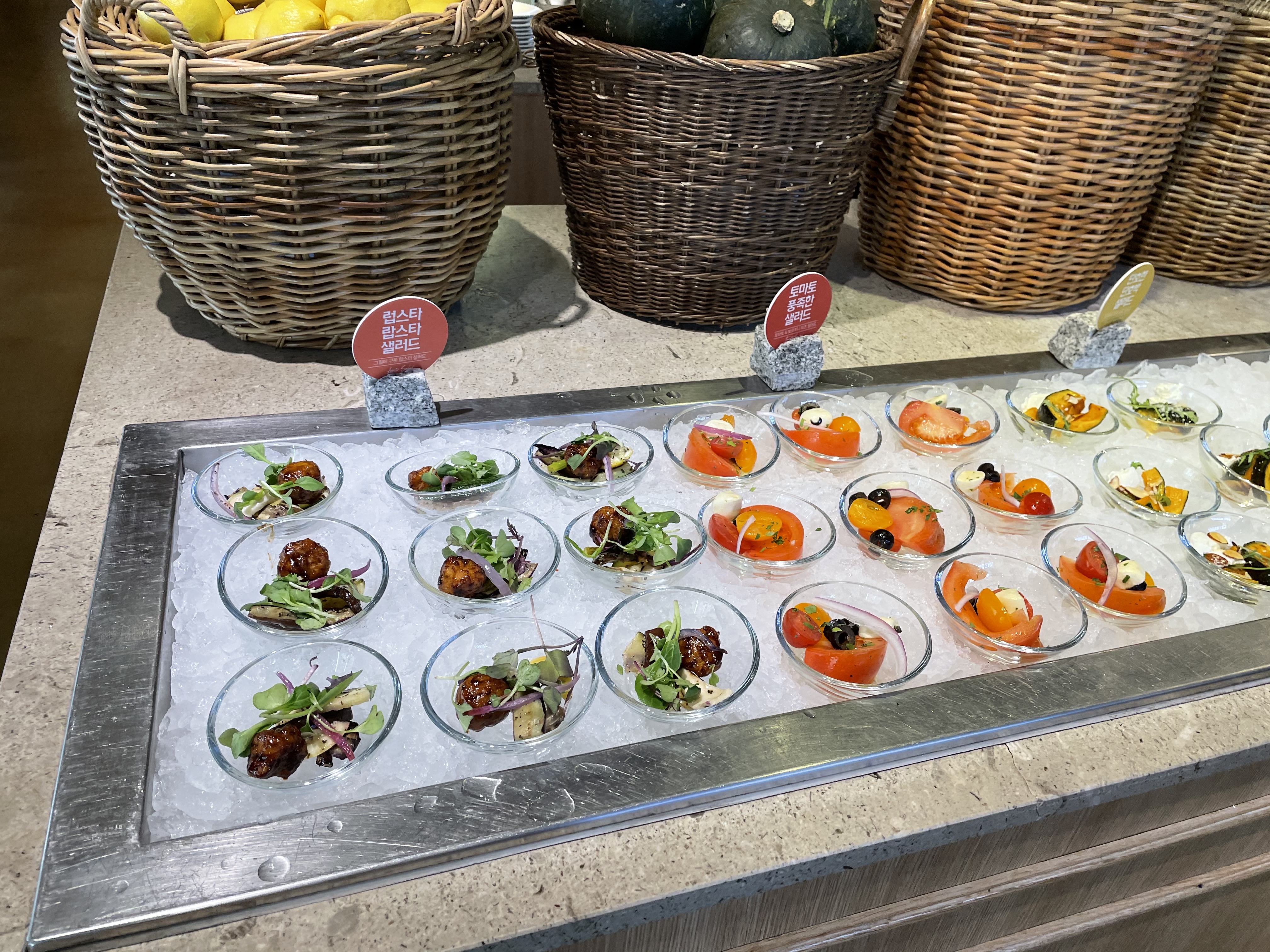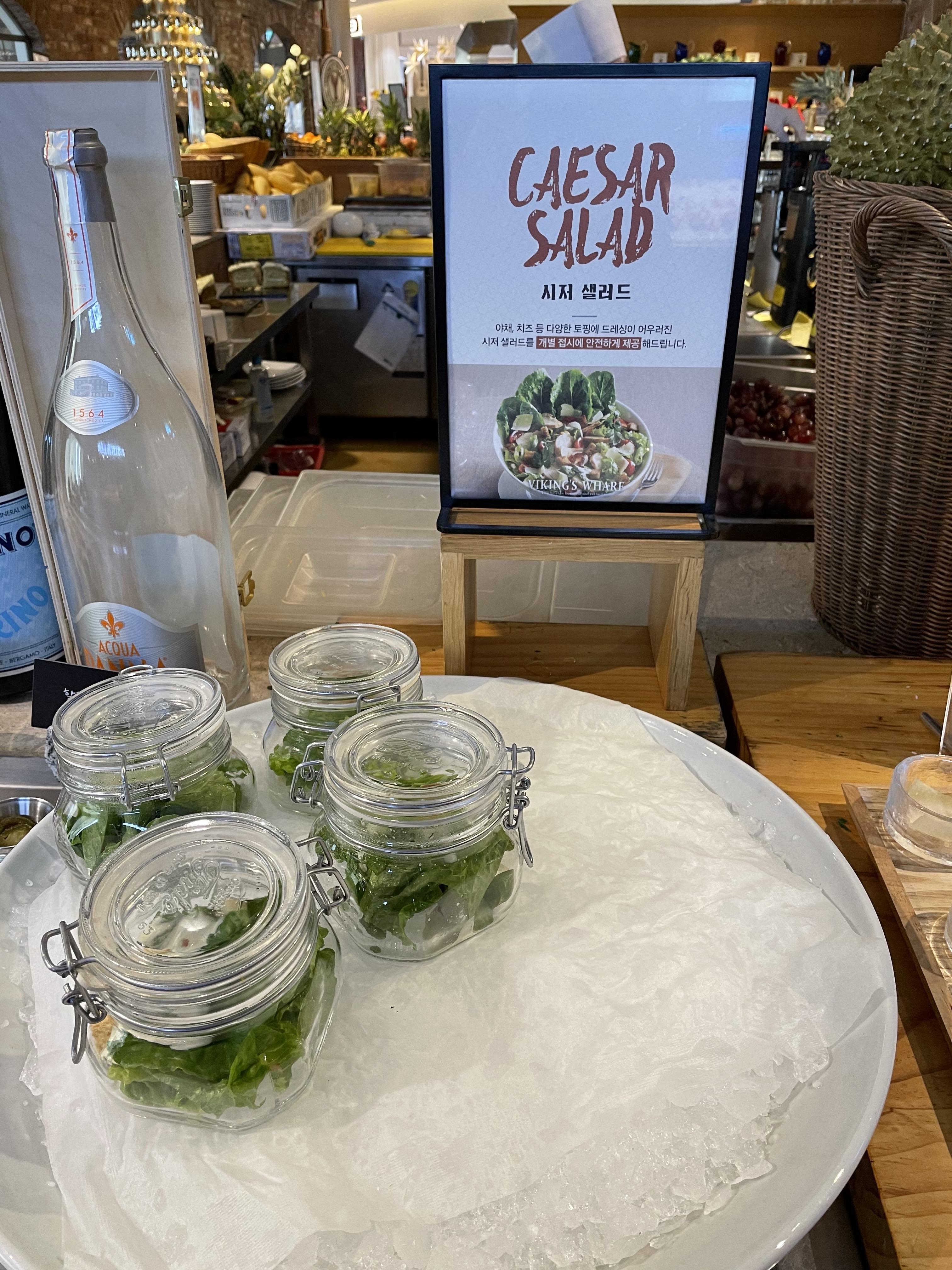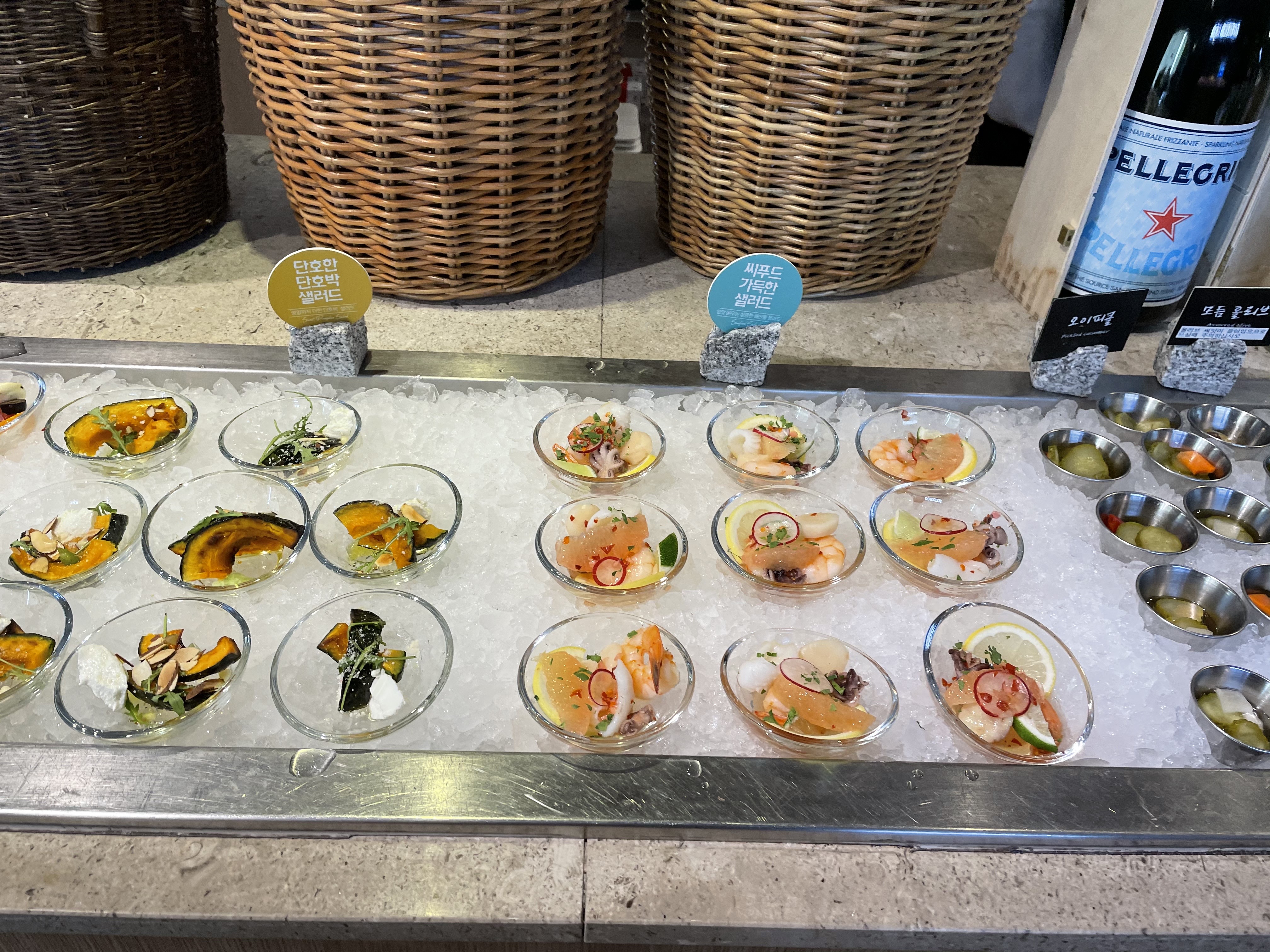 이 곳의 특징은 해산물에 곁들여 먹을 수 있는 다양하고 신선한 샐러드들이 많았다는 점인데요. 간단하게 먹을 수 있는 샐러드와 보틀에 담아 놓은 샐러드 들도 있었어요. 코로나 시국이라 개별 샐러드를 제공하기 위해 보틀에 담아두었다고 하네요. 제 위에 여유가 있었다면 이 친구들도 즐겼을 텐데, 제 위는 해산물들이 들어가기에도 부족했답니다.