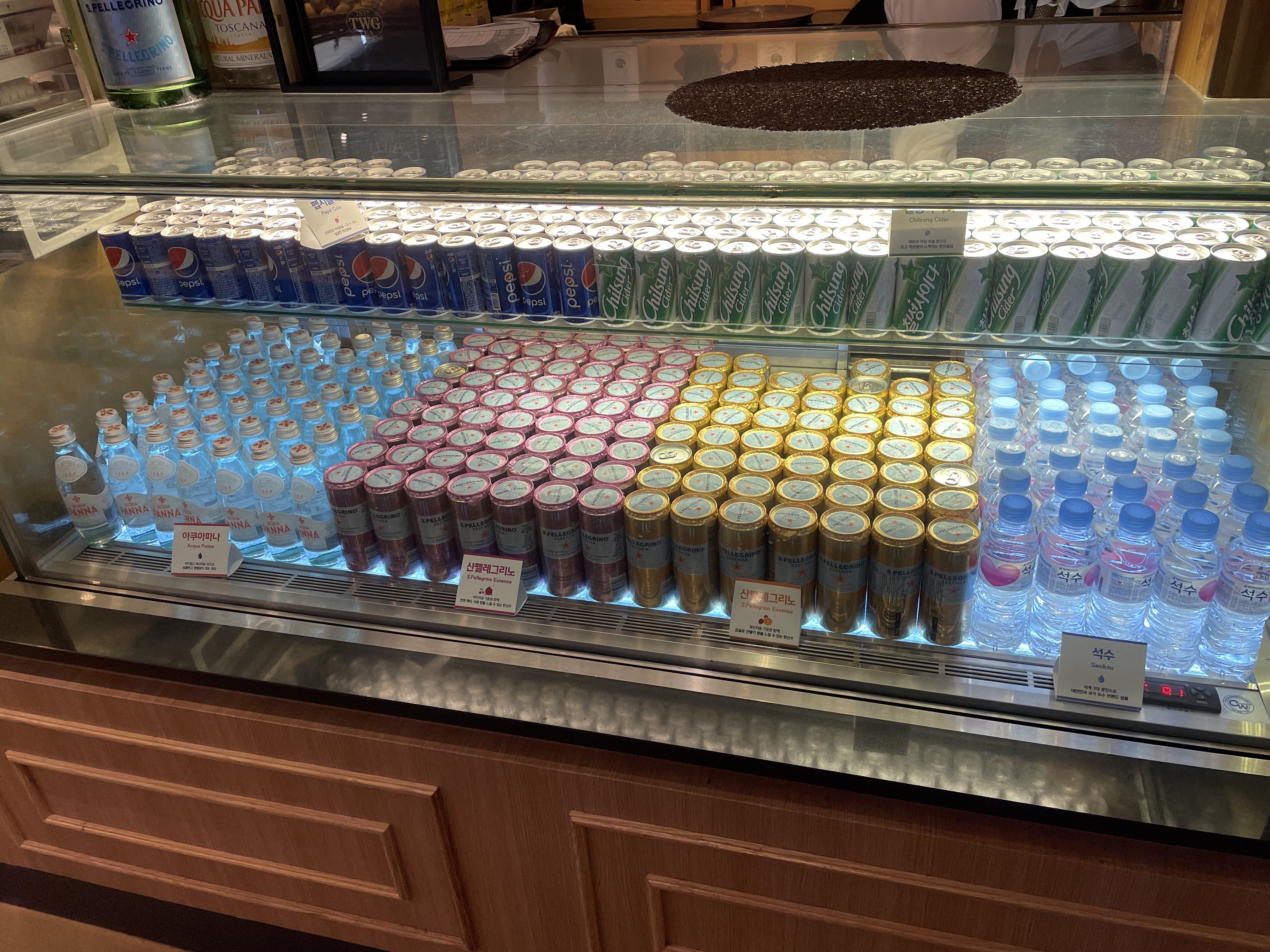 음료도 완제품을 제공해주시는데요. 펩시콜라와 칠성사이다, 아쿠아파나(생수), 산펠레그리노 체리석류향/감귤산딸기향, 석수가 있었어요. 산펠레그리노는 탄산수라고 생각하시면 됩니다! 사진은 못 찍었지만 옆에 폴바셋이 입점해있어 커피도 즐기실 수 있어요.