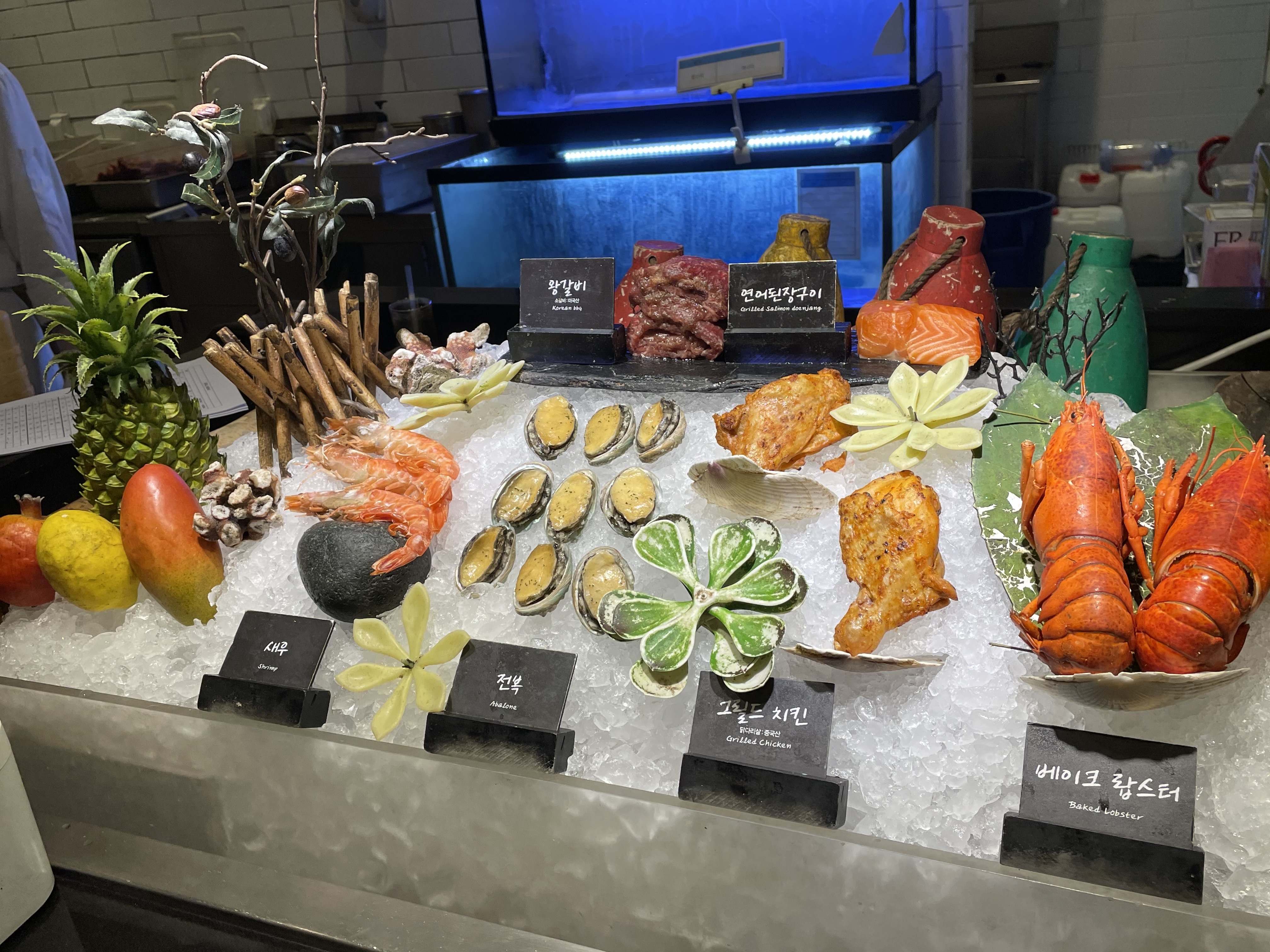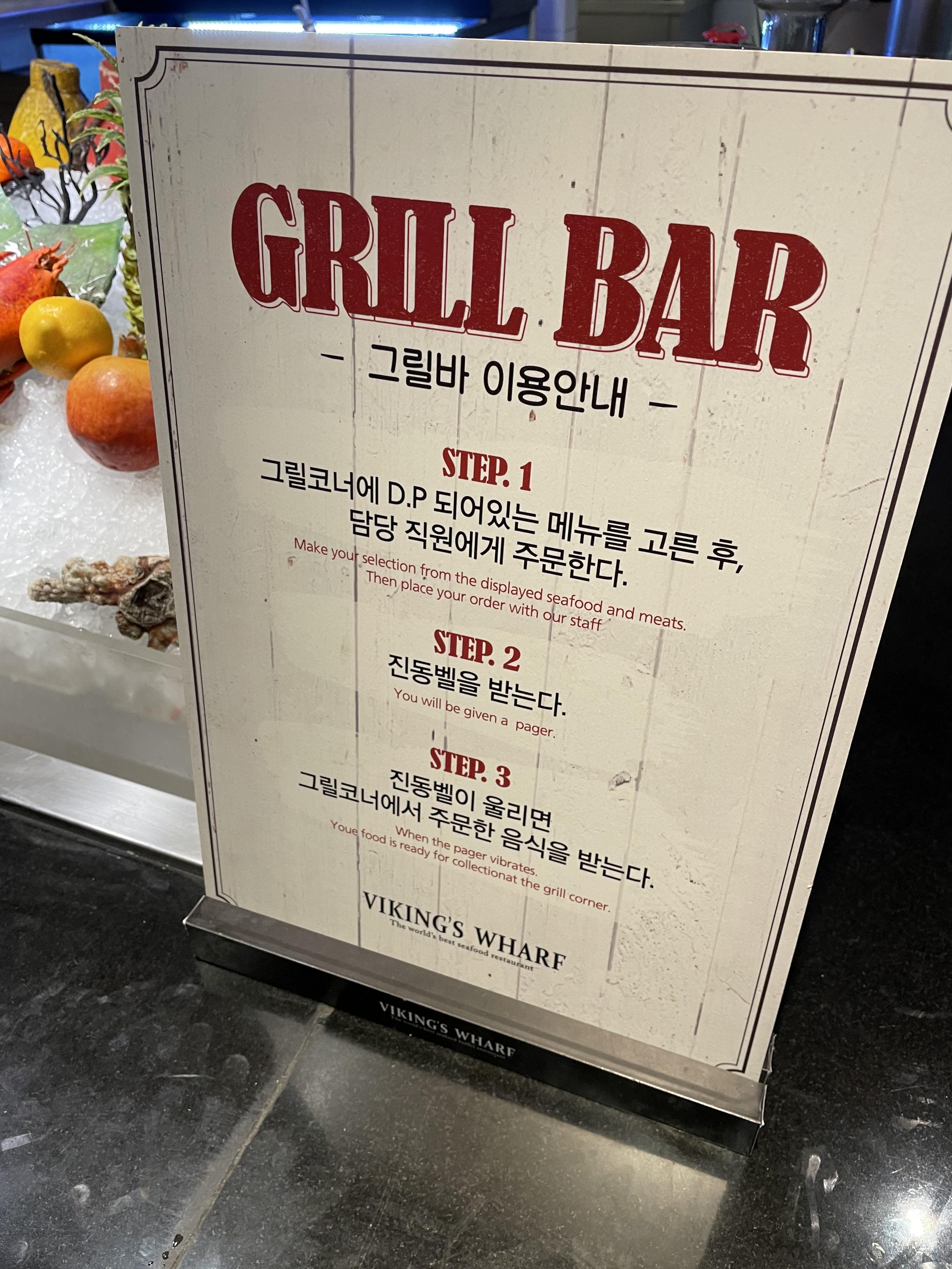 이 곳은 그릴바예요. 해산물과 고기류를 구워주시는 곳입니다. 새우, 전복, 그릴드치킨, 베이크랍스터, 연어된장구이, 왕갈비가 있구요. 이곳도 3가지를 직원분께 말씀해주시면 가재가 그려진 진동벨을 주십니다. 진동벨이 울리면 픽업해 오면 되는 시스템이에요!