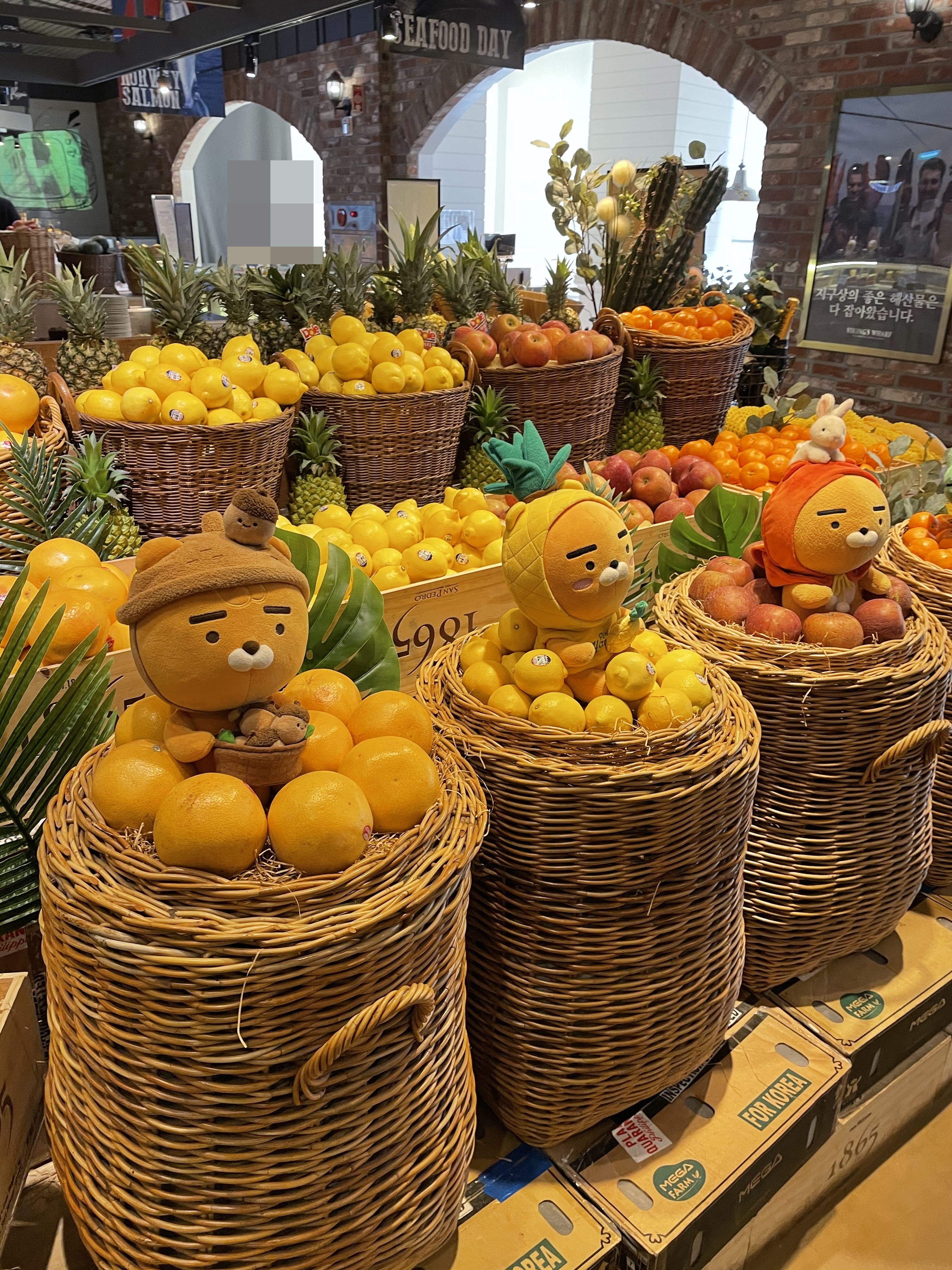 과일코너 앞에 이렇게 귀여운 카카오 인형들이 과일과 함께 디피 되어 있는데, 그러고 보니 눈치채셨는지 모르겠지만 바이킹스워프 곳곳에는 카카오 캐릭터들이 굉장히 많아요. 상관관계가 궁금해서 찾아봤지만 찾지 못했네요.