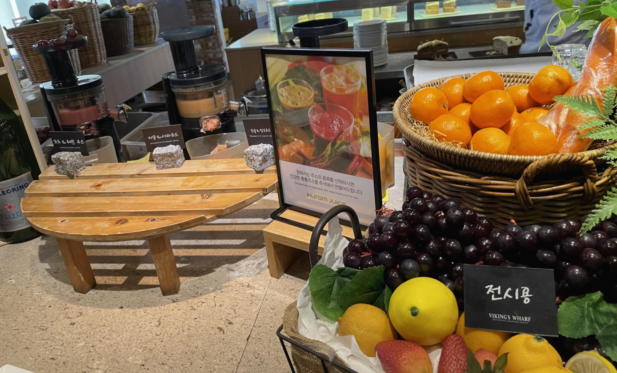과일코너 뒤쪽에 있는 주스 코너예요. 휴롬을 이용해 바로 착즙주스를 만들어주세요. 포도+레몬, 자몽+사과, 감귤+당근이 있습니다.