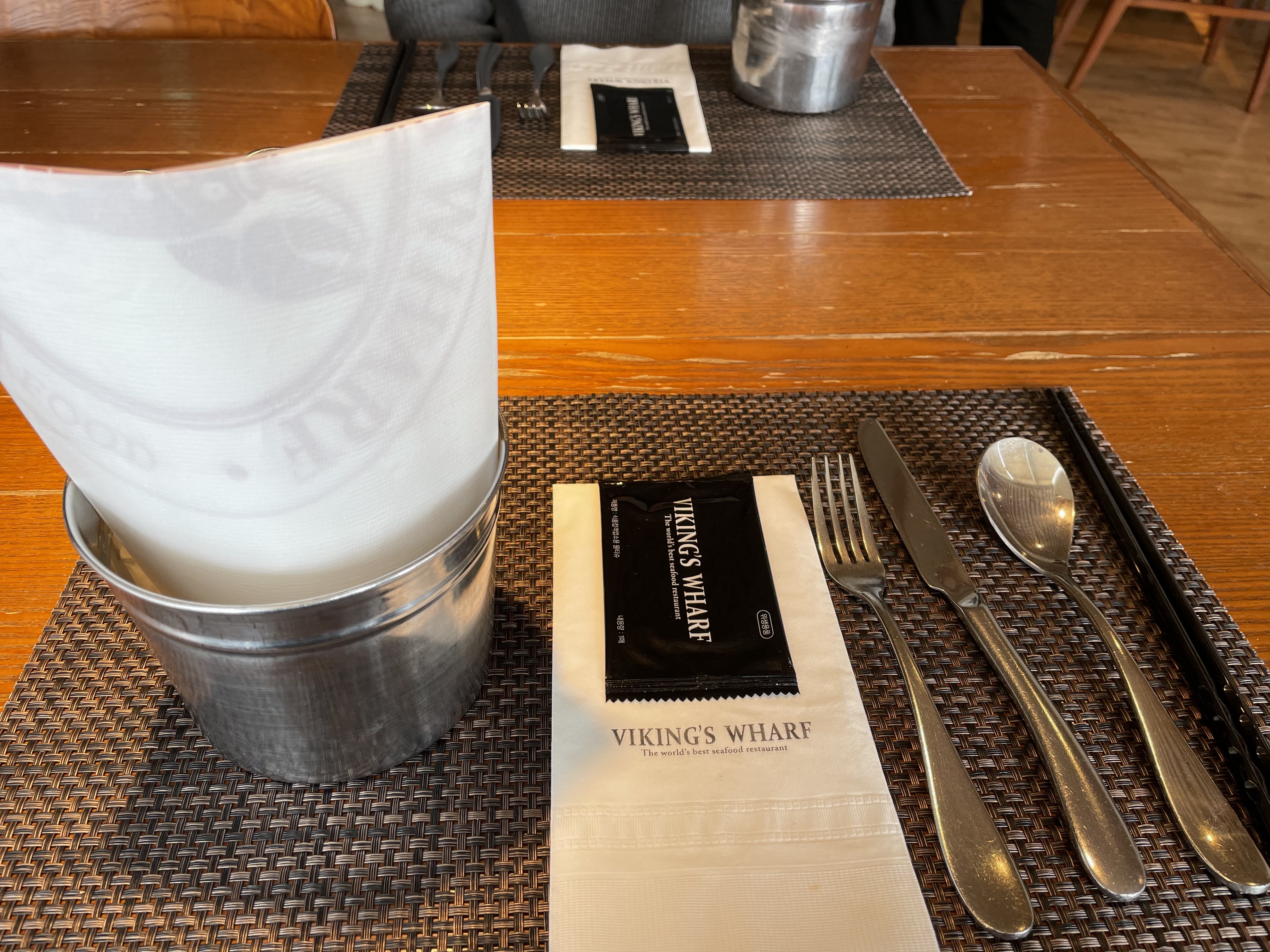 테이블 기본 세팅입니다. 앞치마와 냅킨, 물티슈, 식기와 랍스터를 먹을 수 있는 도구인 가위와 비닐장갑과 껍질을 버리는 그릇이 있어요! 테이블에는 넘버가 적혀있어요. 꼭 외우셔야 해요!