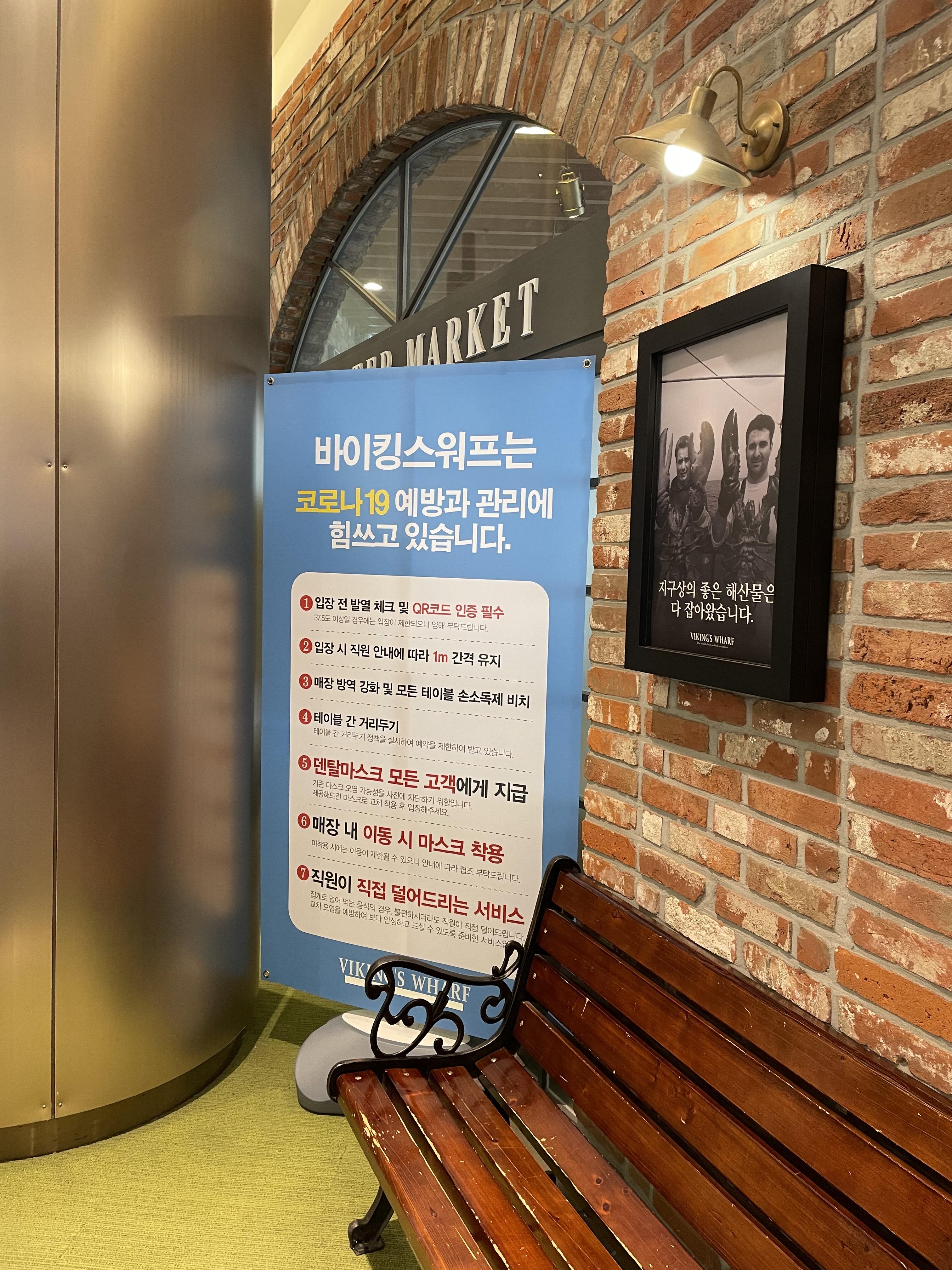 기다리는 동안 직원분께서 열체크를 해주시면서 덴탈 마스크를 주셨어요. 안내문에는 고객이 이미 쓰고 있는 마스크는 오염의 위험이 있어, 교체 착용을 권고한다고 쓰여있었지만 실제로는 주시기만 하시고 바꿔서 착용하라고 말씀은 안하시더라구요. 바이킹스워프 로고가 새겨져 있어서 밖에서는 못 쓸 것 같네요.