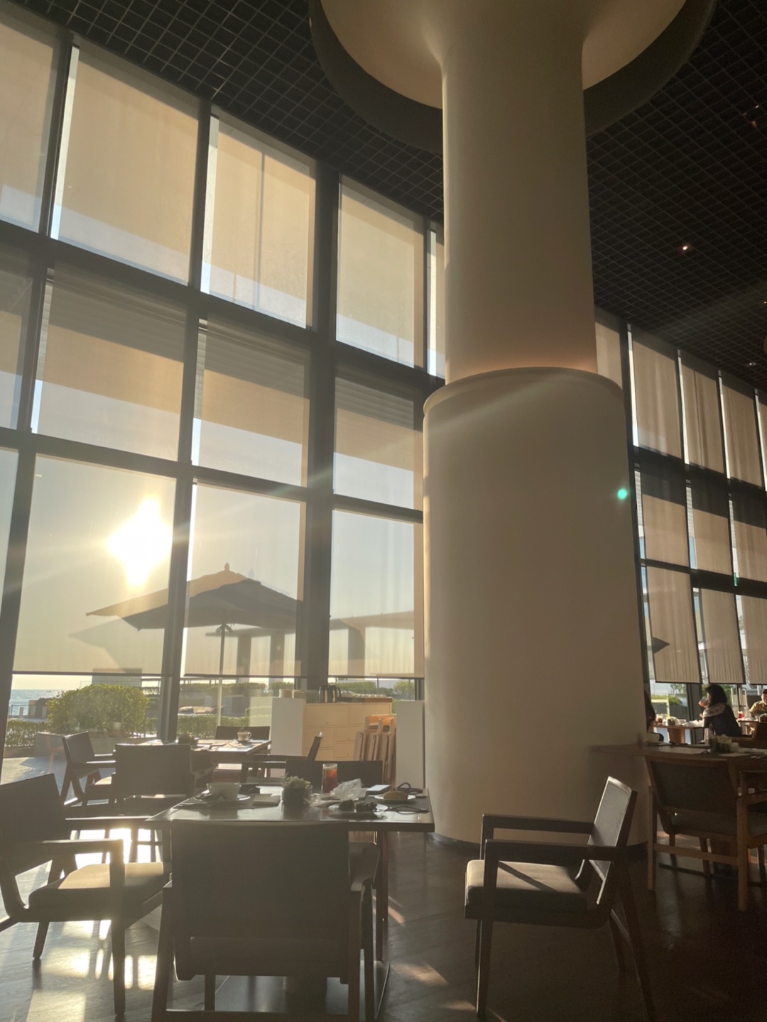 지하 2층으로 내려가면 다모임이라는 곳이 있는데 이 곳이 조식 먹는 곳이에요. 너무너무 좋았던 건 높은 천장 고와 휴양지에 온 듯 찬란하게 공간을 가득채운 아침 햇살.