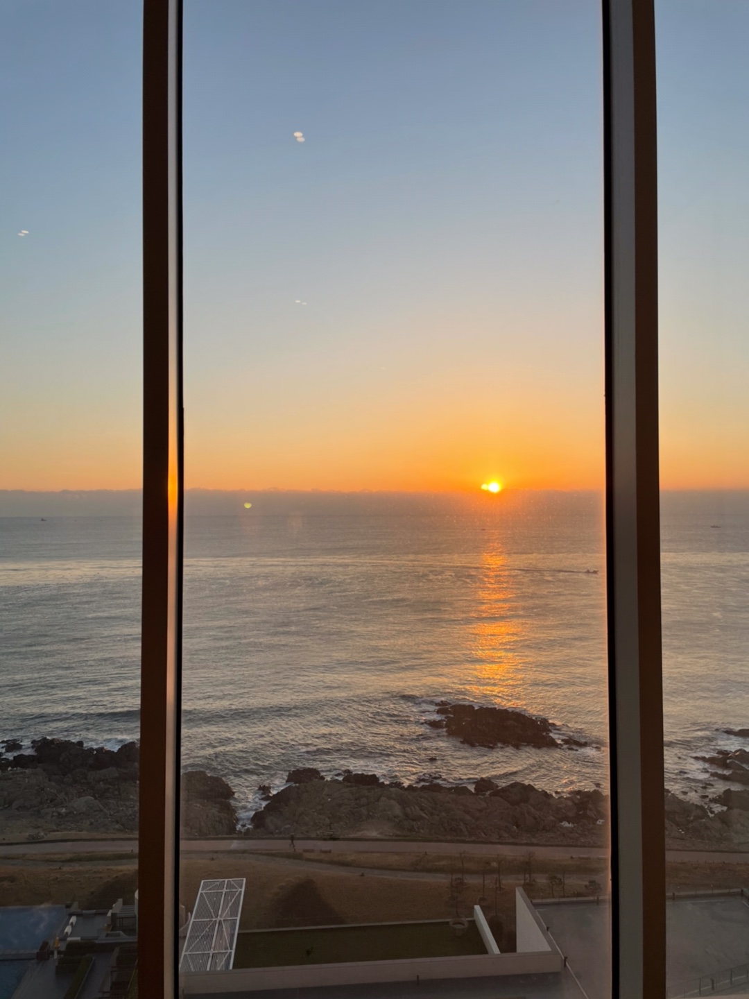 조식 먹으러 가는 길에 큰 창에서 이렇게 예쁜 일출도 찍었고요!