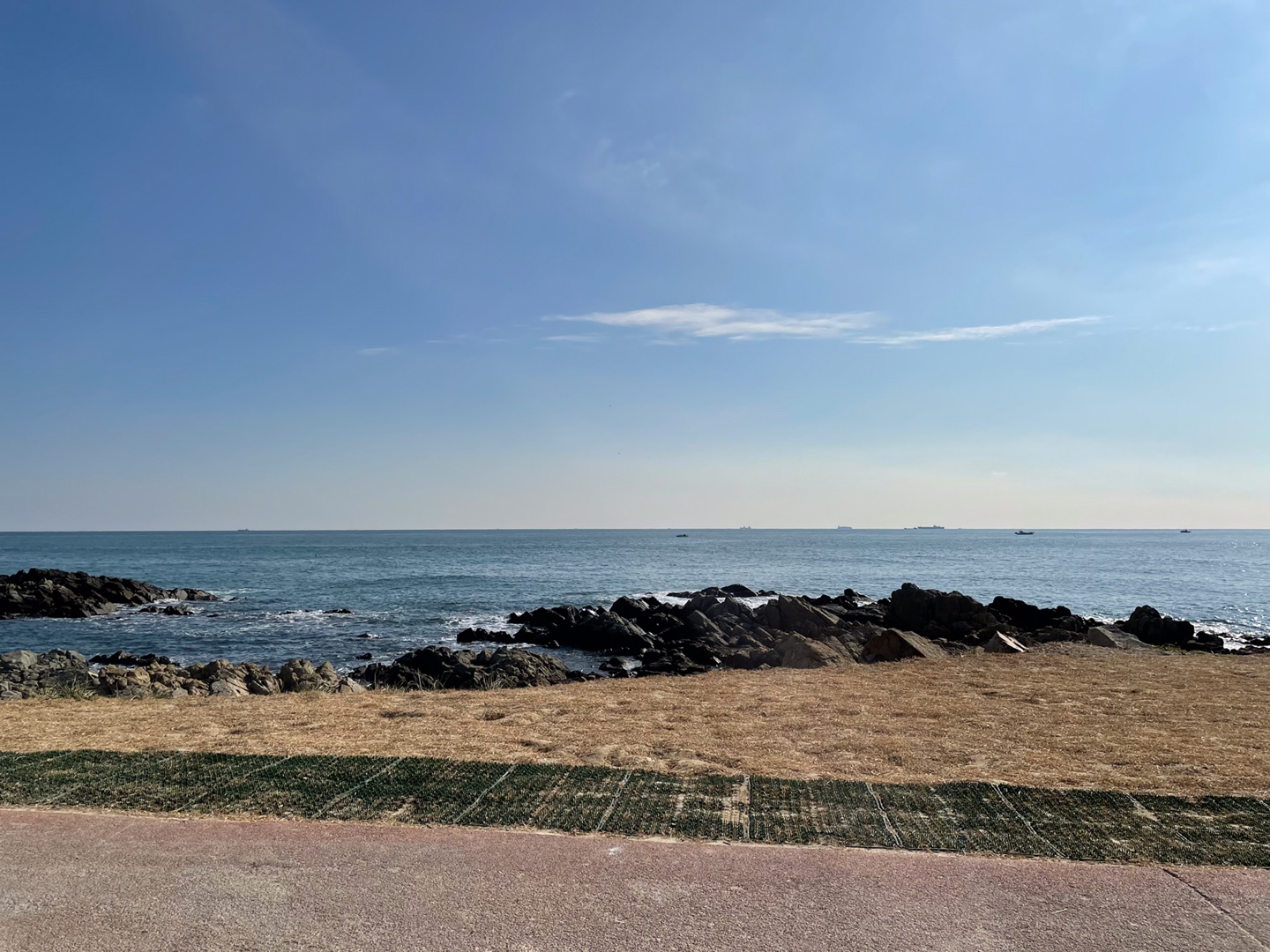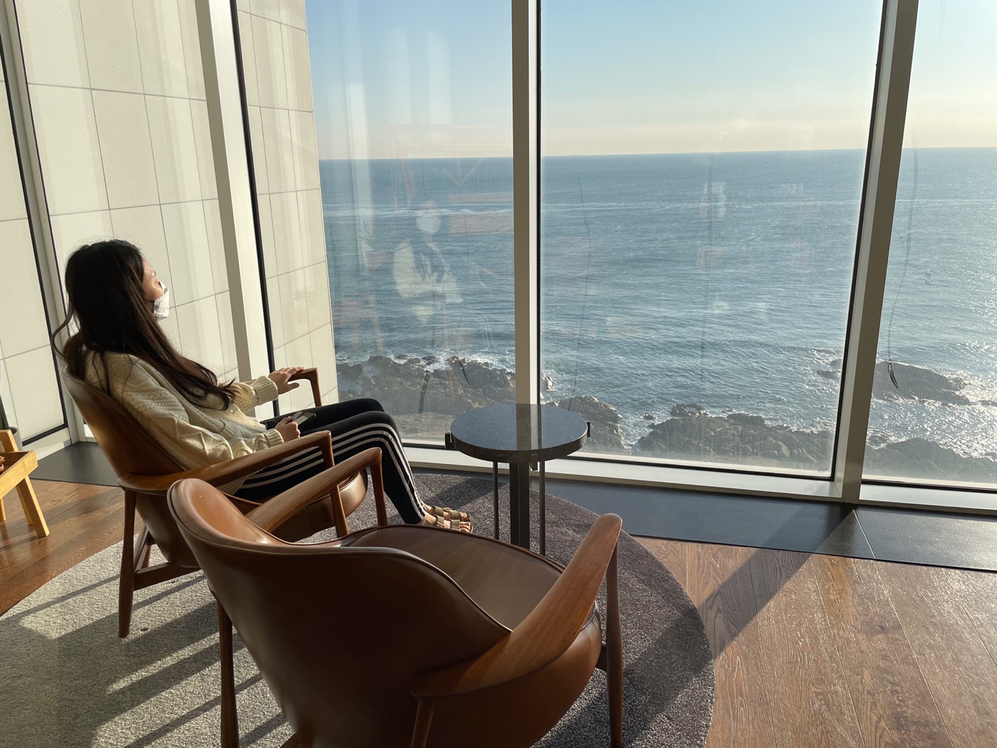 바위가 많은 파란 바다예요. 이것도 너무 힐링되더라고요. 부산 힐튼 호텔은 서울에 있는 호텔에서의 호캉스랑은 다른 느낌이에요.