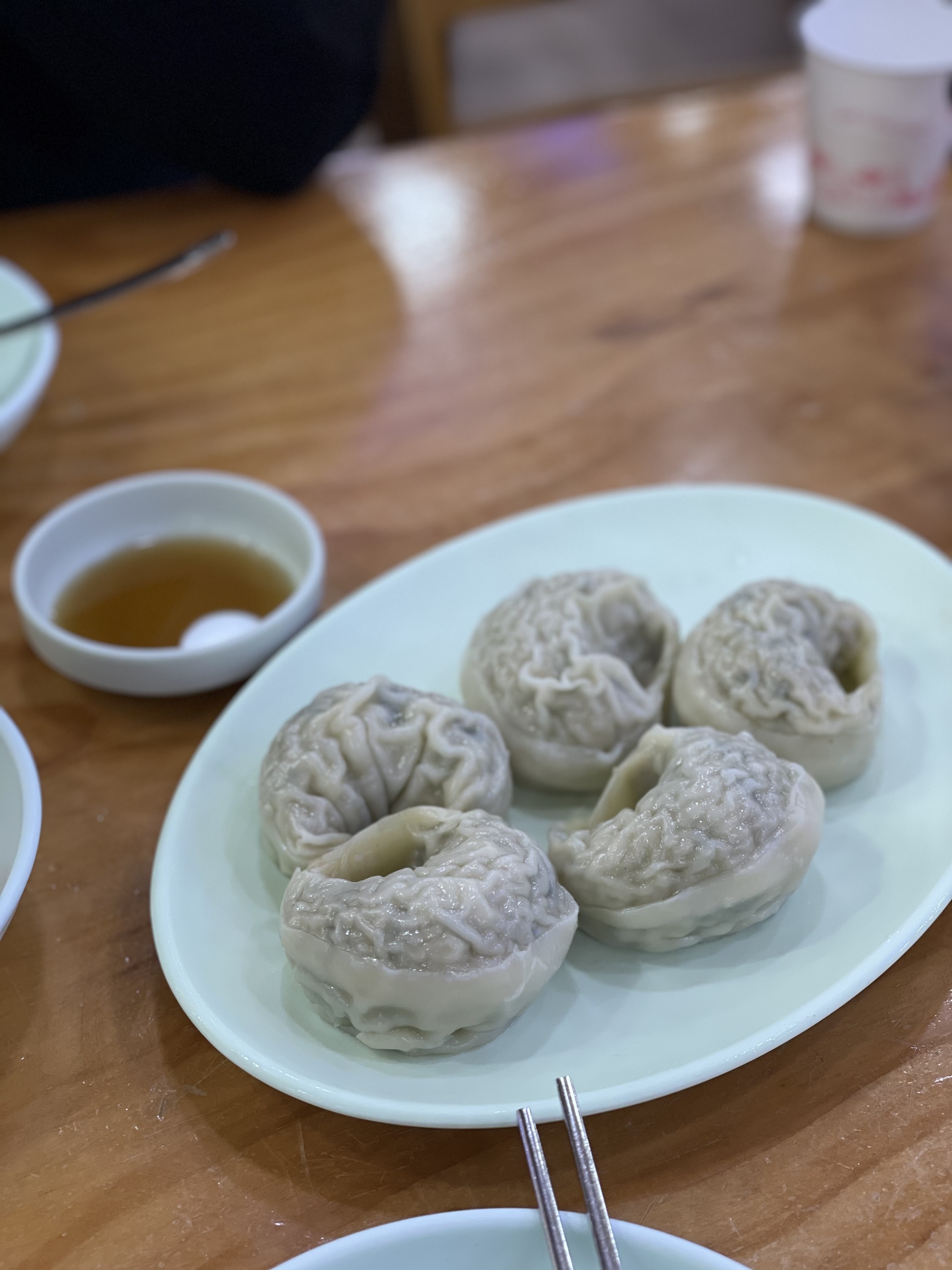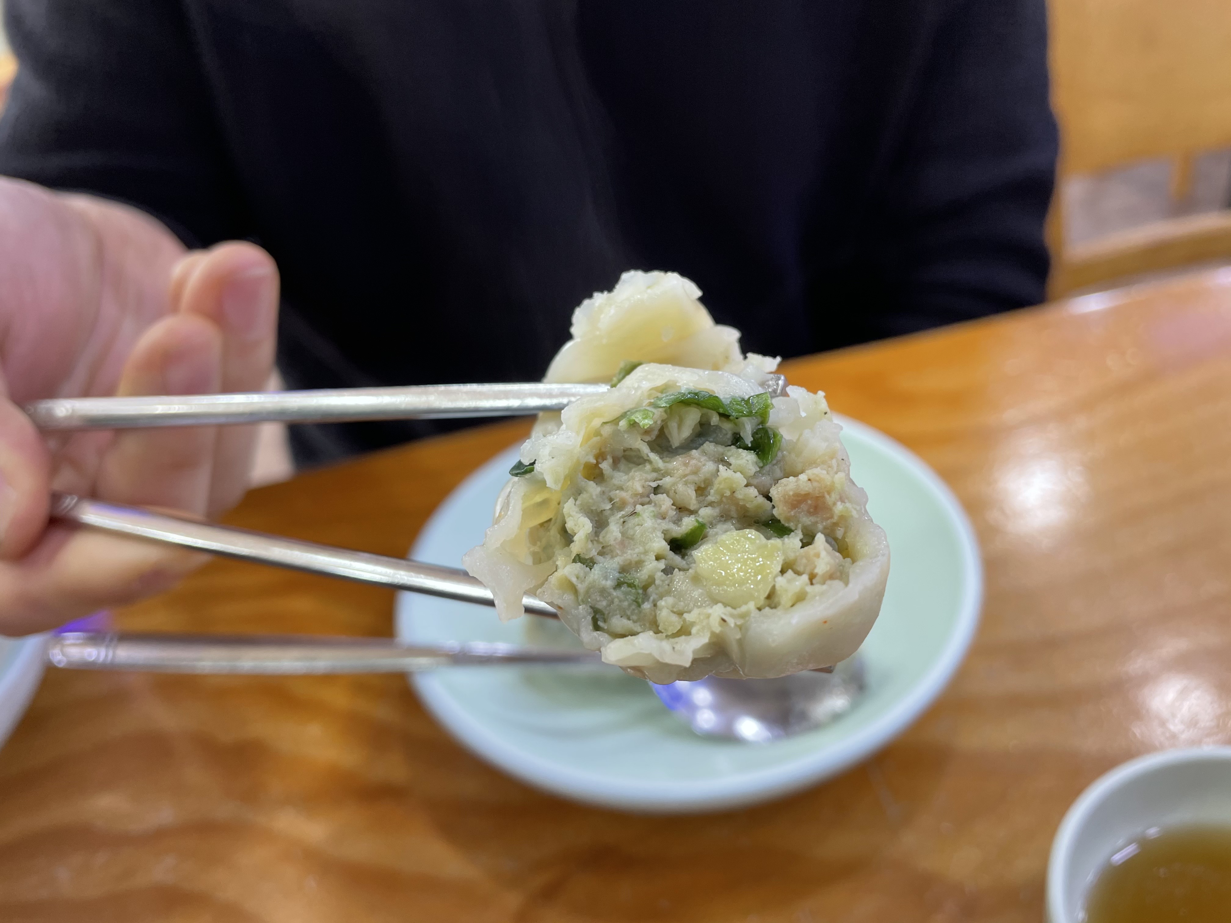 적당한 두께의 만두피에, 꽉찬 속. 간장에 찍어먹어요.